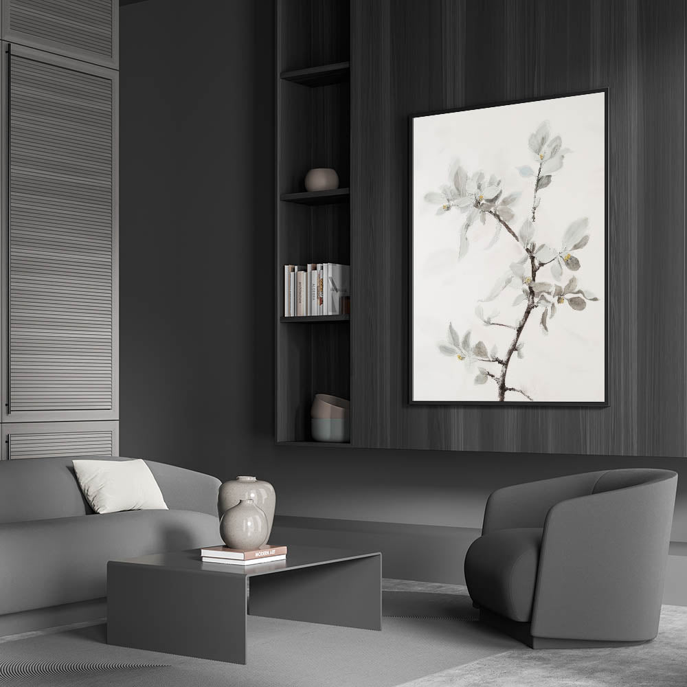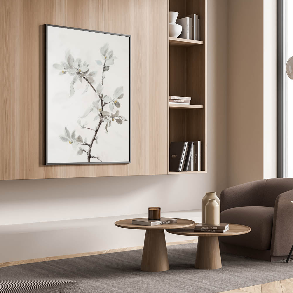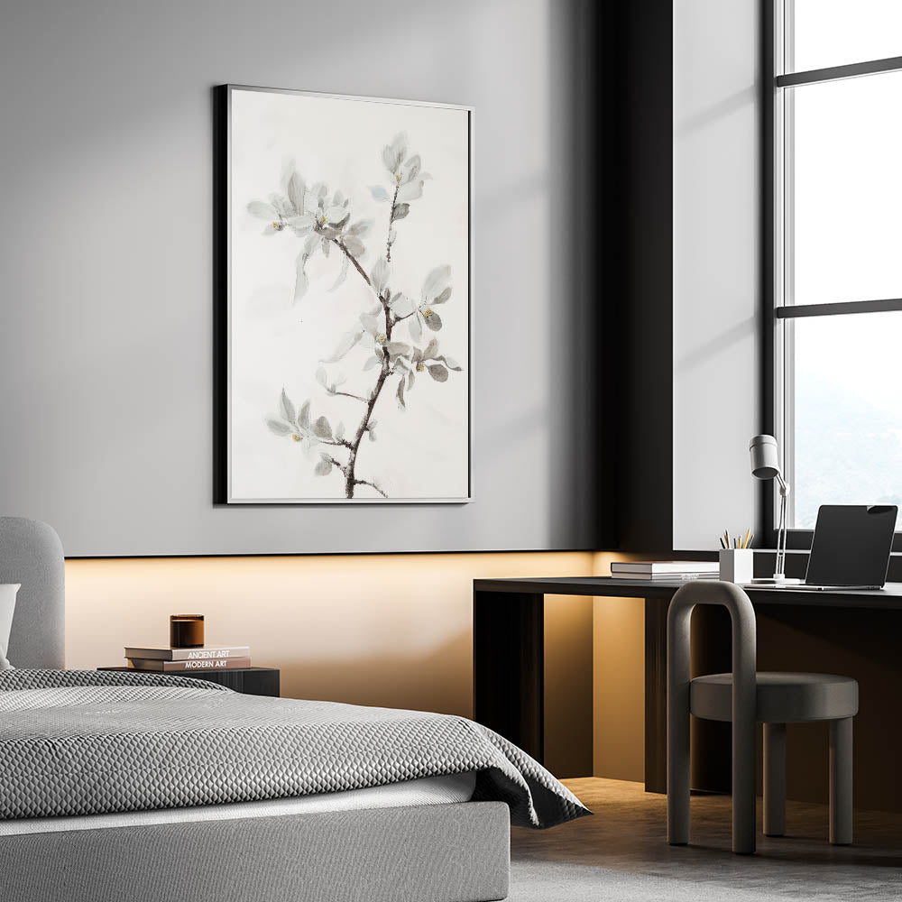 Add a touch of sophisticated elegance to your home with this living room wall art featuring a delicate floral branch in soft, muted tones. This modern wall art blends minimalist aesthetics with intricate botanical details, making it a perfect addition to contemporary living room decor. The subtle hints of light gray, beige, and white enhance the airy and calming ambiance of any space.