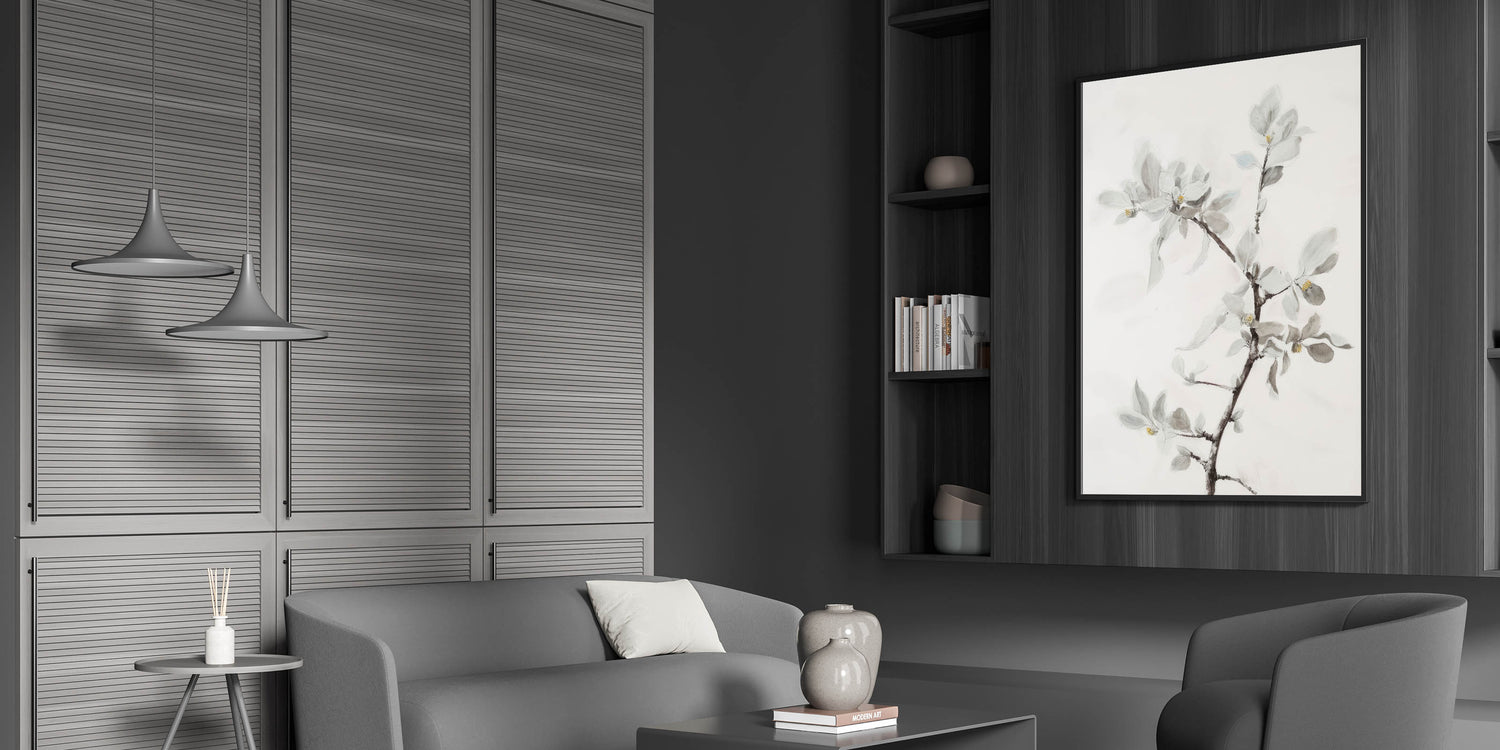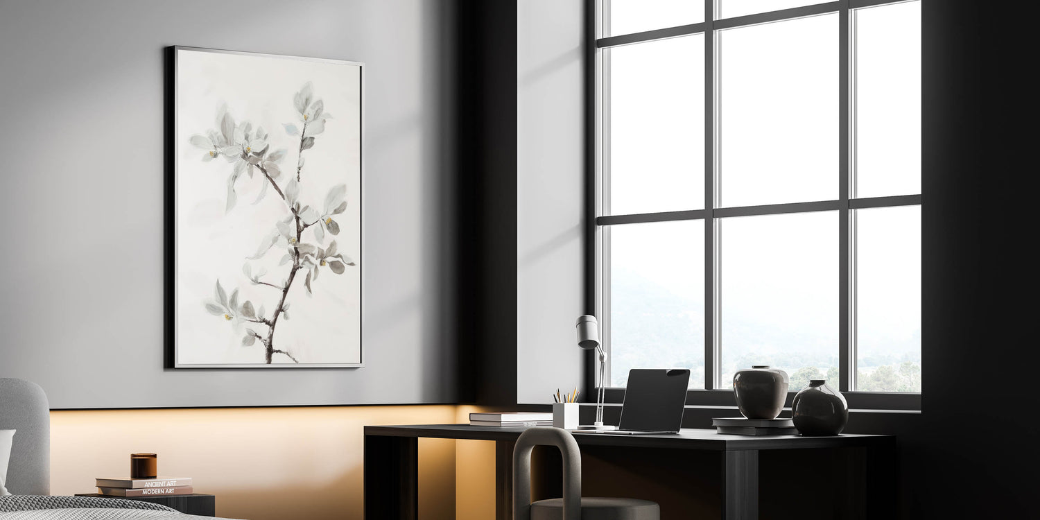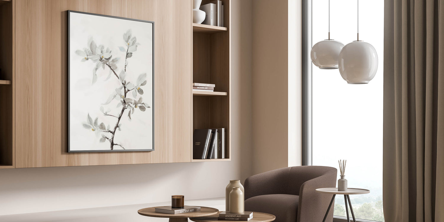 Add a touch of sophisticated elegance to your home with this living room wall art featuring a delicate floral branch in soft, muted tones. This modern wall art blends minimalist aesthetics with intricate botanical details, making it a perfect addition to contemporary living room decor. The subtle hints of light gray, beige, and white enhance the airy and calming ambiance of any space.