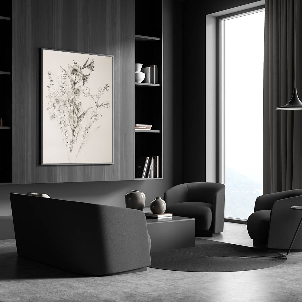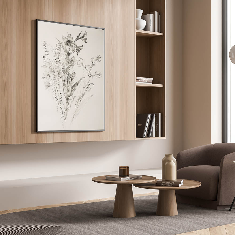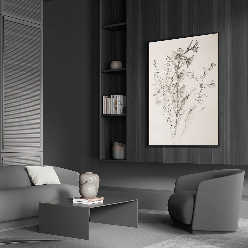 Embrace elegance and simplicity with this modern wall art, featuring a beautifully detailed black and white floral sketch. This living room wall art showcases delicate hand-drawn flowers in a minimalist, monochrome palette, bringing a touch of timeless sophistication. Whether displayed as canvas wall art or framed wall art, this piece enhances modern living room decor with its graceful and artistic appeal.