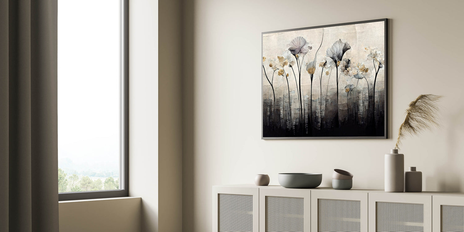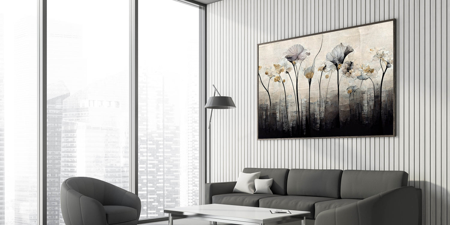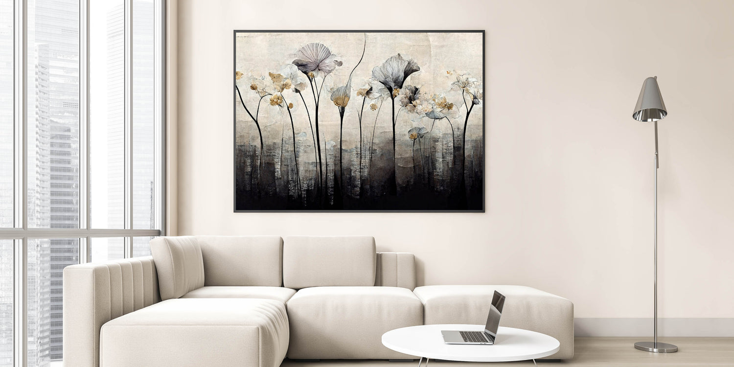 Bring a touch of nature into your space with this minimalist floral wall art for the living room. Featuring delicate botanical elements in black, white, and gold hues, this modern wall art blends elegance with a contemporary aesthetic. The subtle abstract design adds depth and sophistication, making it a perfect choice for contemporary living room decor.