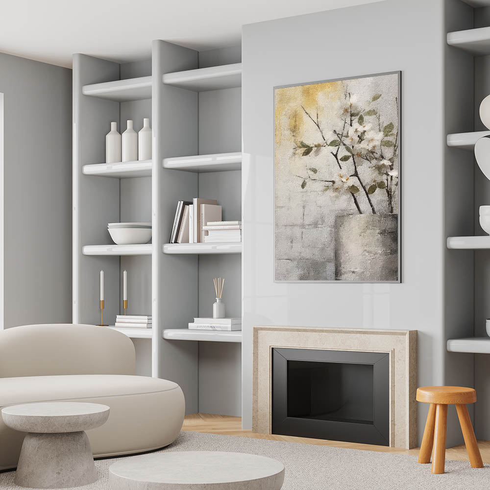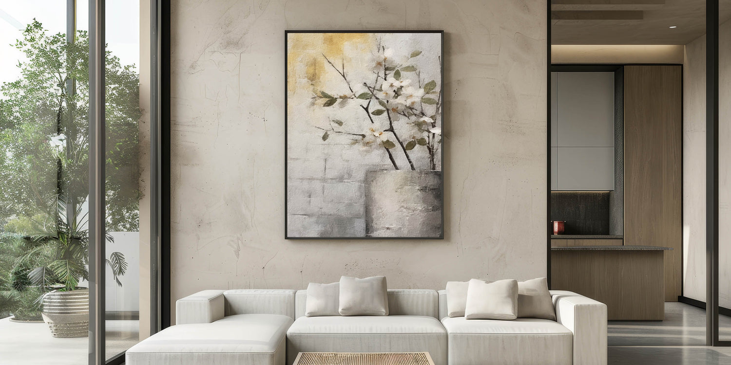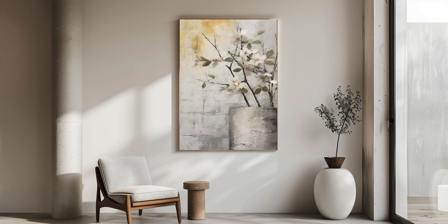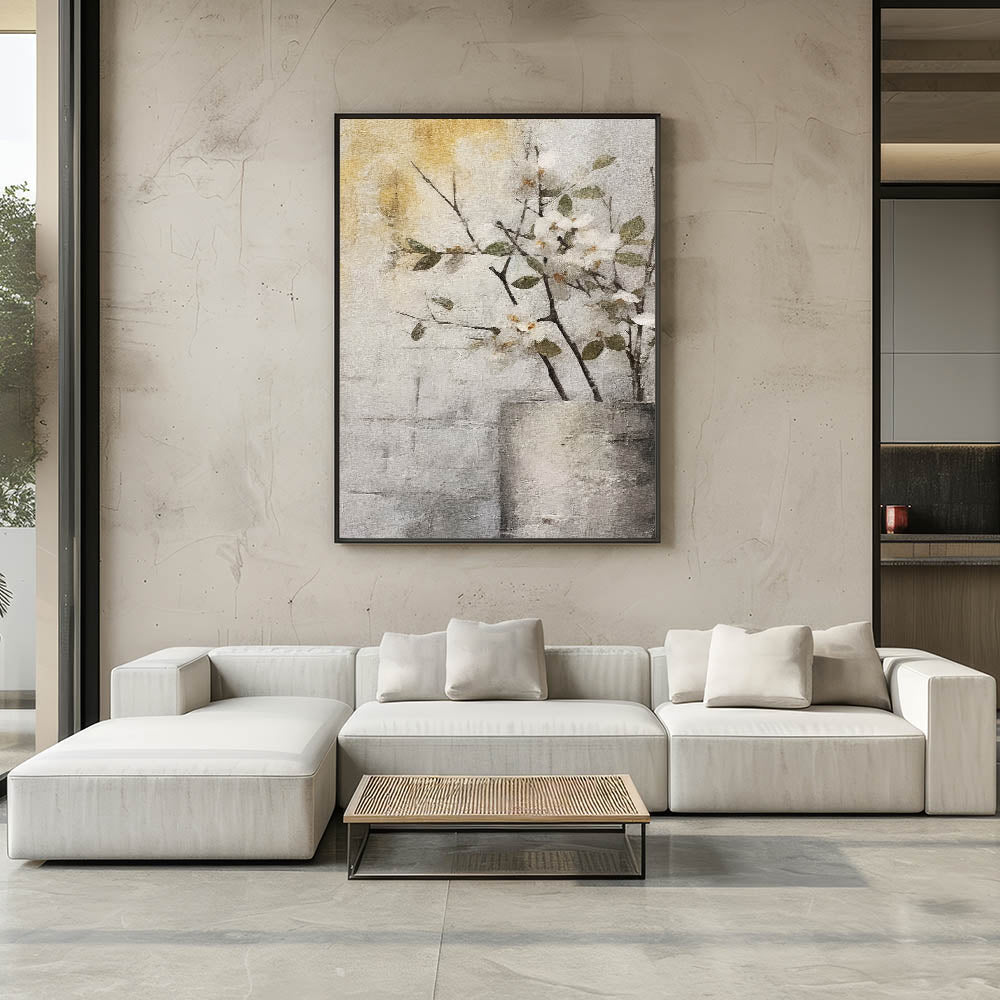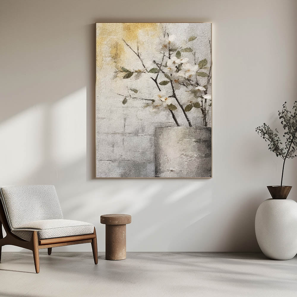 Elevate your interior with this minimalist floral living room wall art, a stunning blend of soft neutrals, muted greens, and warm gold tones. The delicate floral arrangement in a textured vase adds a sophisticated yet understated charm, making it an ideal choice for modern living room decor. This canvas wall art is perfect for those who appreciate elegant simplicity in their home.