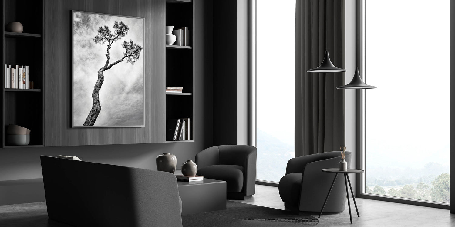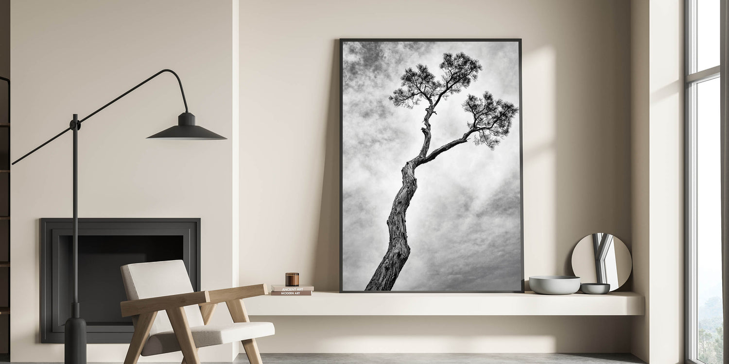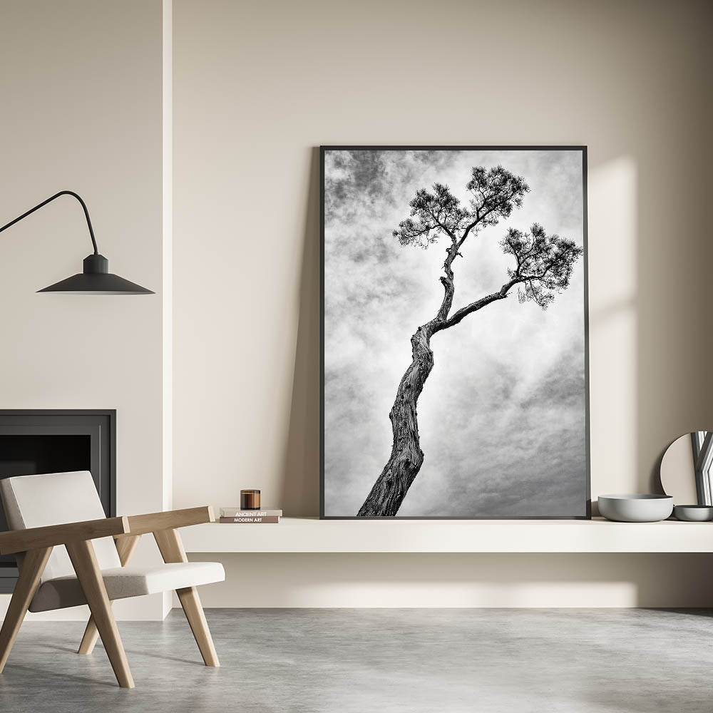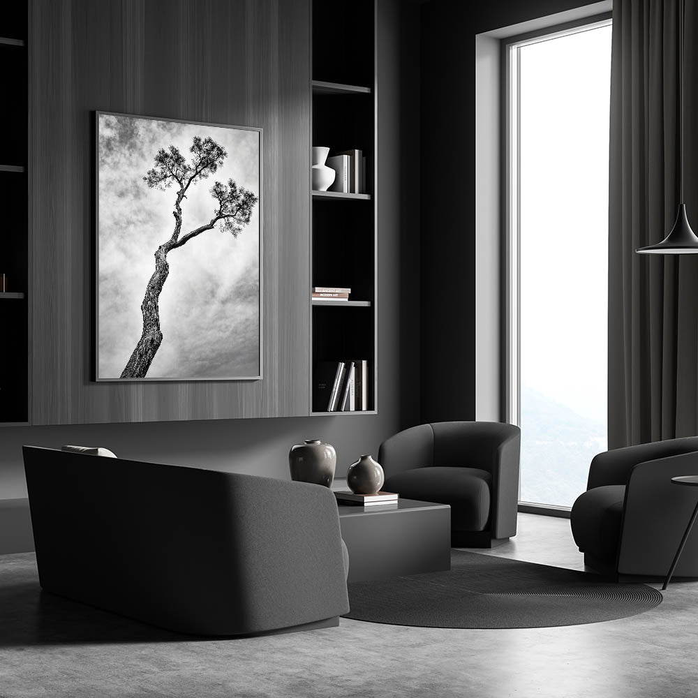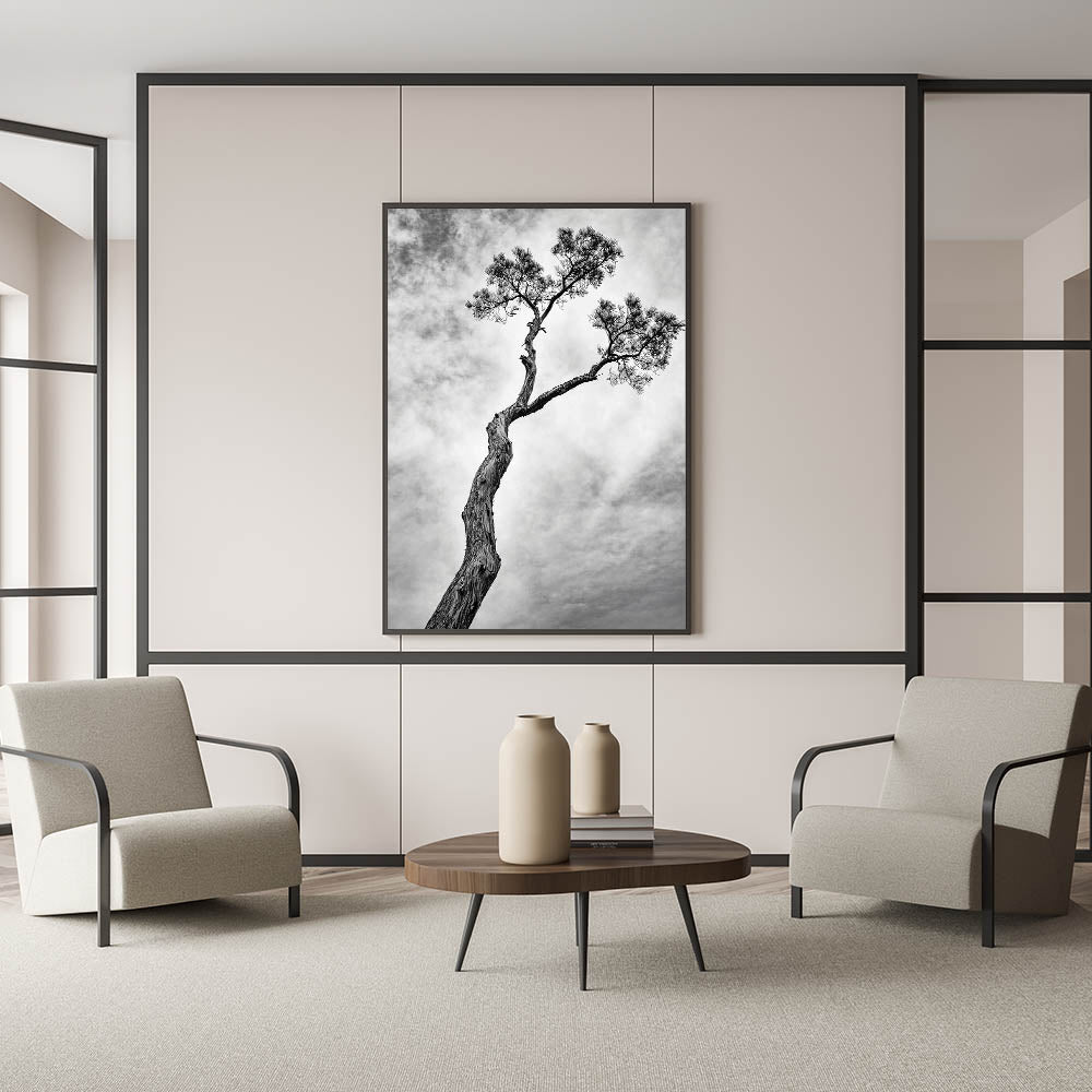 Elevate your modern living room decor with this striking black and white tree silhouette wall art. Featuring a majestic, twisted tree against a soft, clouded sky, this minimalist composition exudes a sense of strength and resilience. The sharp contrast and intricate textures bring out the beauty of natural simplicity, making it a sophisticated focal point for contemporary interiors.