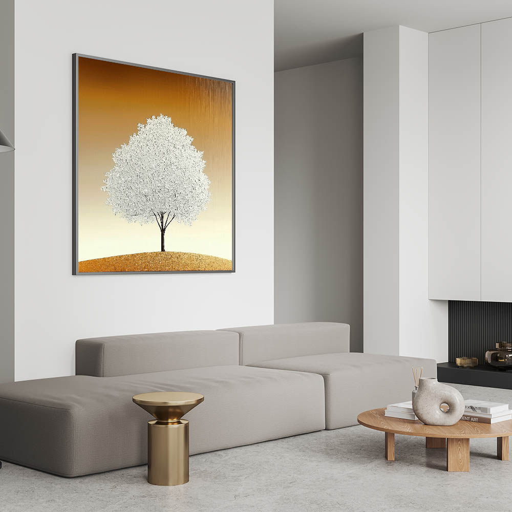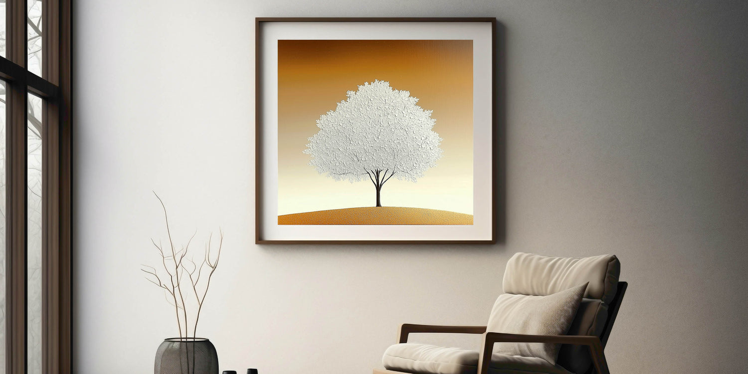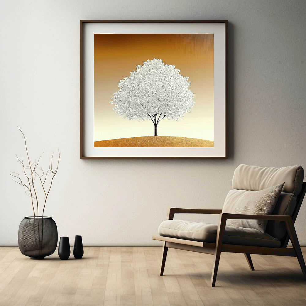 Elevate your space with the simplicity and elegance of this living room wall art, featuring a striking white textured tree set against a warm beige and gold gradient. The minimalist composition and refined details make this modern wall art a perfect addition to contemporary interiors.