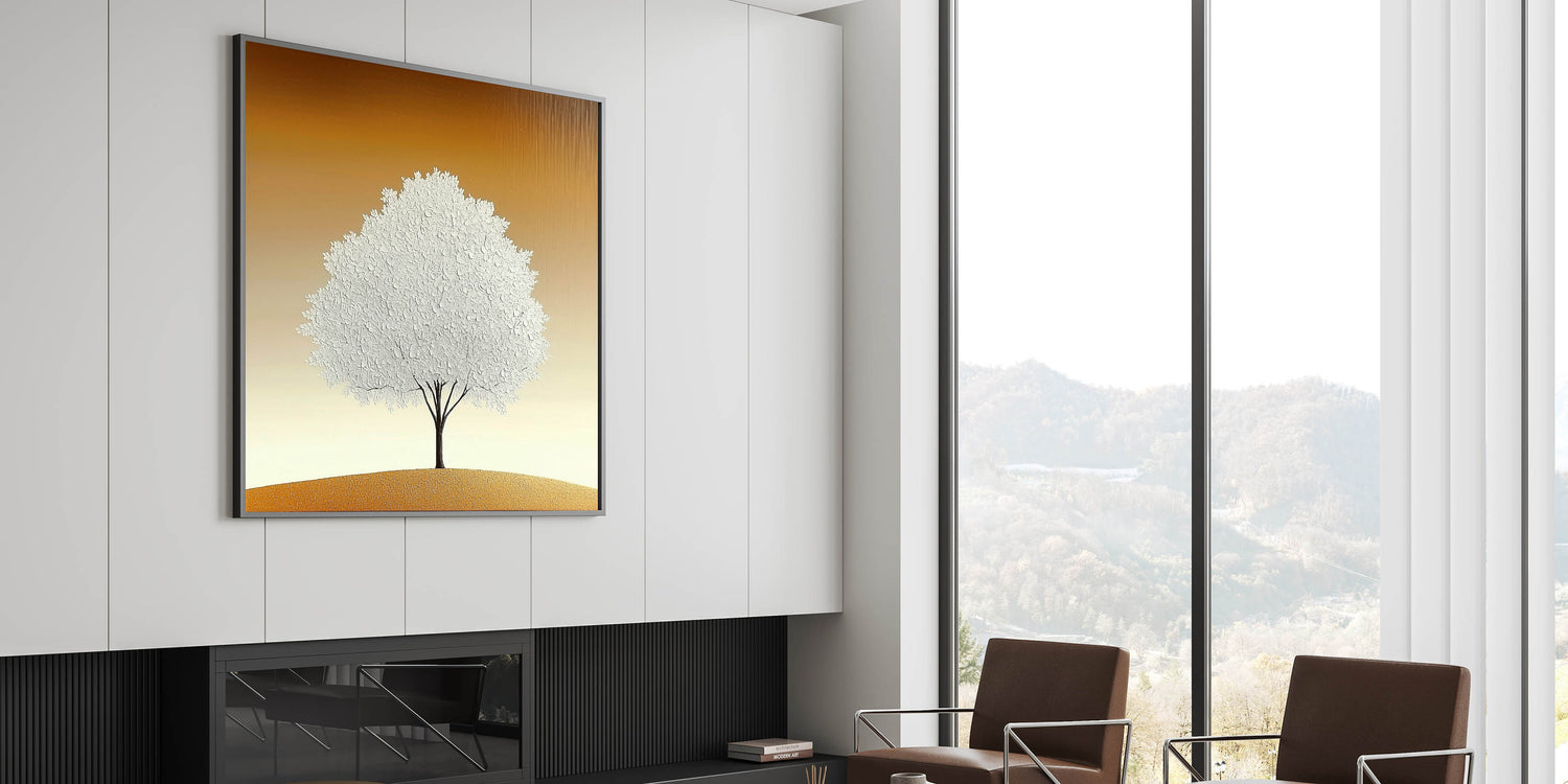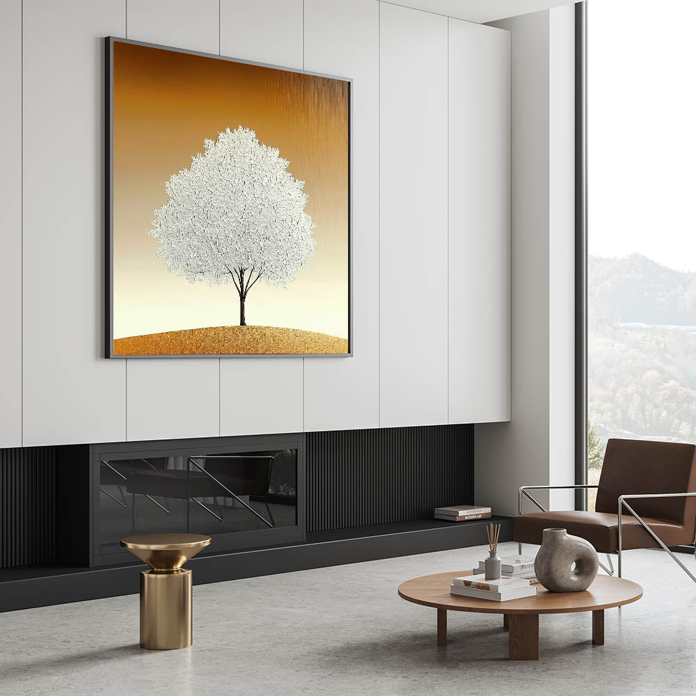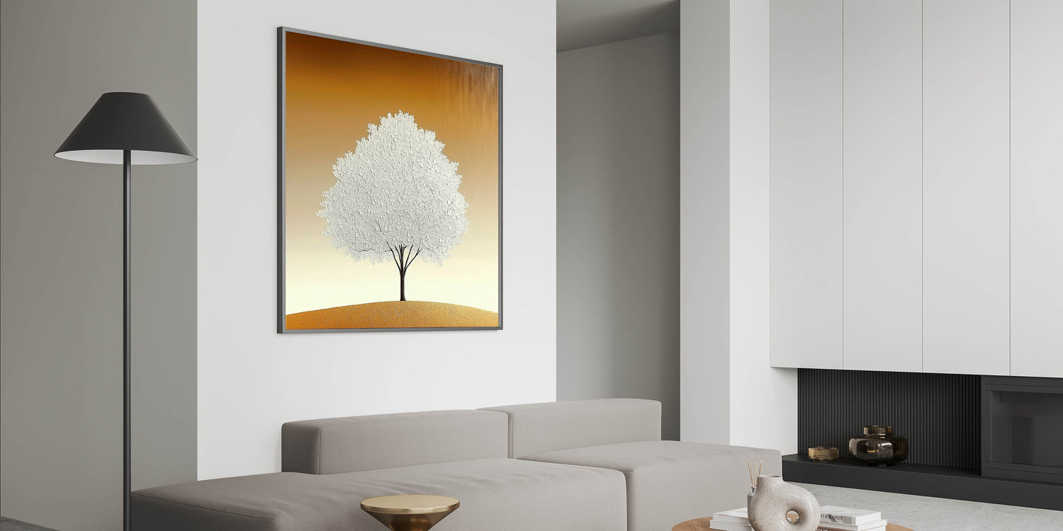 Elevate your space with the simplicity and elegance of this living room wall art, featuring a striking white textured tree set against a warm beige and gold gradient. The minimalist composition and refined details make this modern wall art a perfect addition to contemporary interiors.