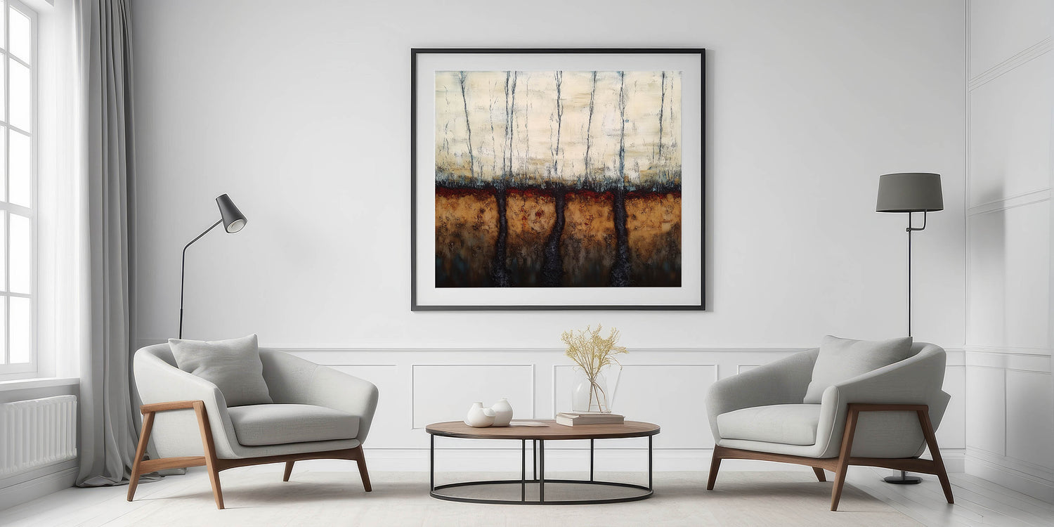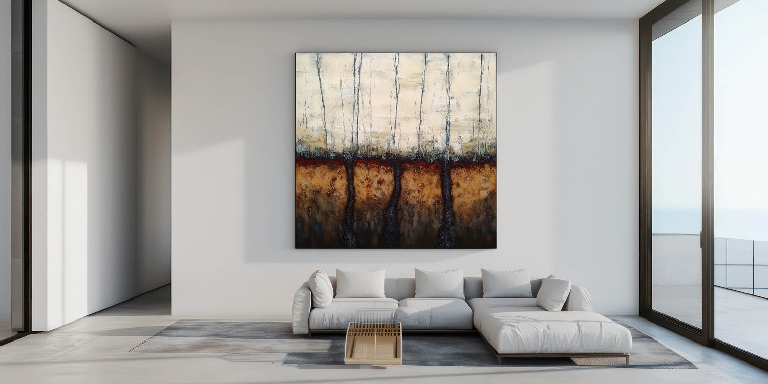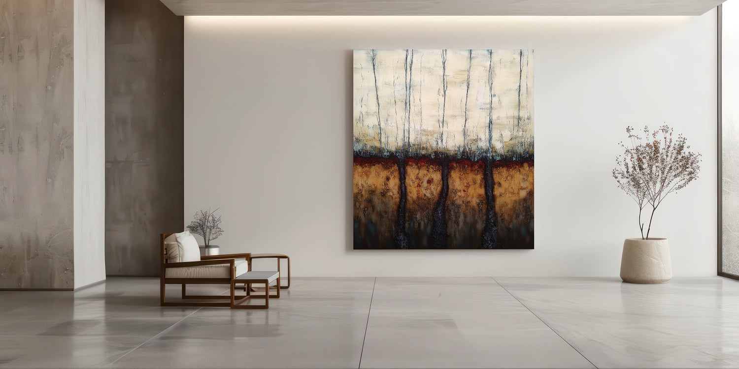 Elevate your living space with this stunning wall art for the living room, designed to bring warmth and sophistication to any modern interior. This modern living room décor piece features an earthy abstract landscape with rich browns, deep blacks, and soft neutrals. Its textured details and vertical elements add depth and dimension, making it an eye-catching canvas art print or framed art print for any space.