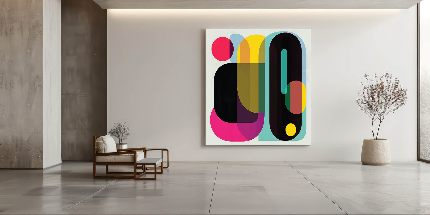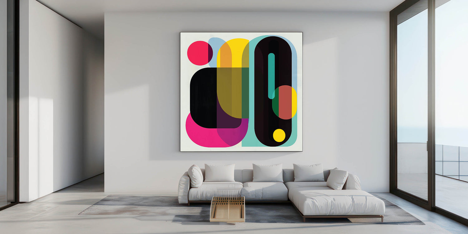 Add a bold, modern touch to your space with this vibrant abstract wall art for the living room. Featuring a dynamic composition of geometric shapes in black, yellow, pink, teal, and orange, this modern wall art exudes creativity and energy. The unique color combinations and sleek design make it an ideal statement piece for contemporary living room decor.