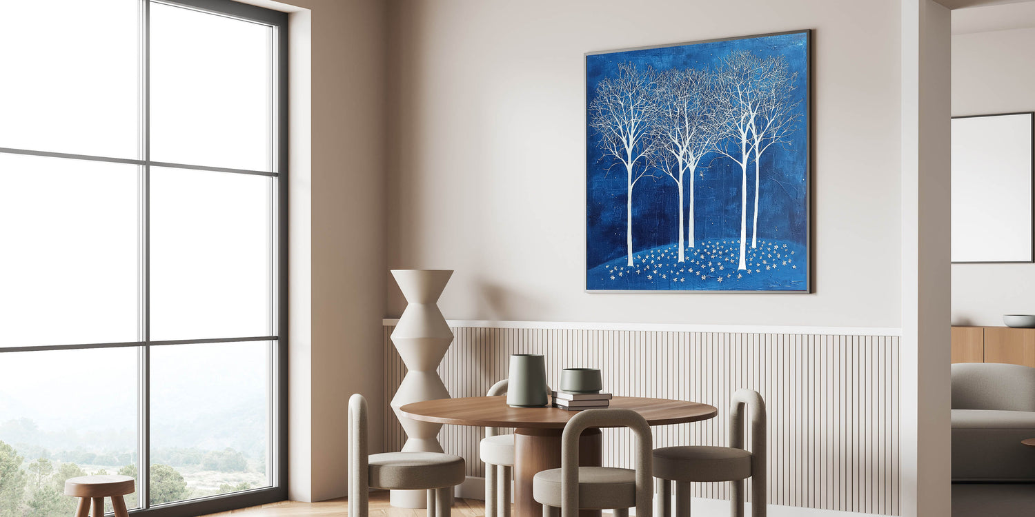 Transform your space with this modern canvas wall art, featuring an enchanting winter-inspired design of delicate trees set against a deep navy blue background. The intricate white branches contrast beautifully with the cool-toned backdrop, while small floral and star-like details add a magical touch. This abstract wall art creates a serene, dreamlike atmosphere, making it a perfect wall art for the living room or any stylish interior.