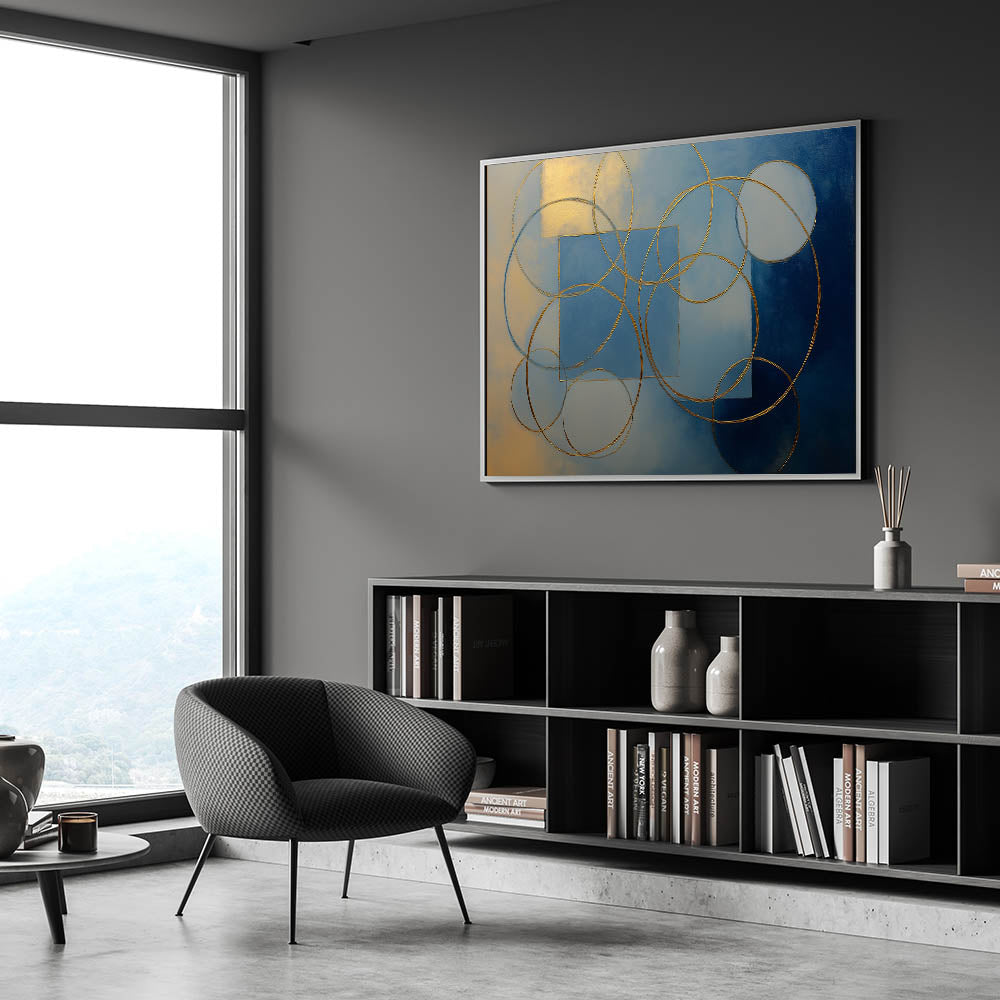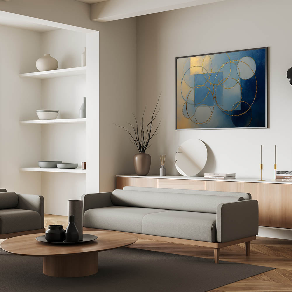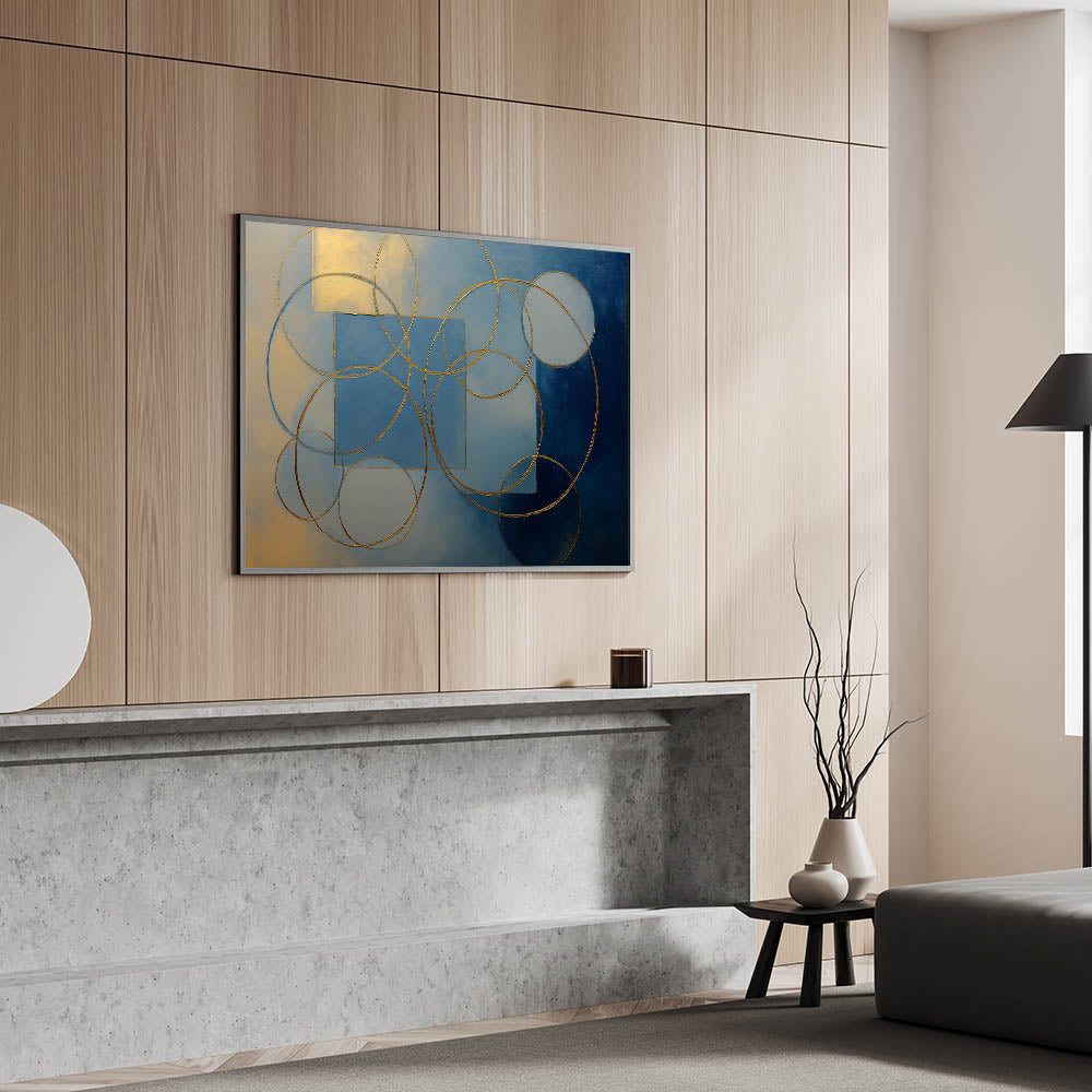 Elevate your interior with this stunning abstract wall art, featuring gold geometric circles and squares against a rich blue and beige gradient. This modern wall art combines luxury with artistic elegance, making it a perfect statement piece for wall art for living rooms, offices, or upscale interiors. Available in canvas wall art, framed wall art, and acrylic glass, this artwork seamlessly blends with contemporary and minimalist décor styles.