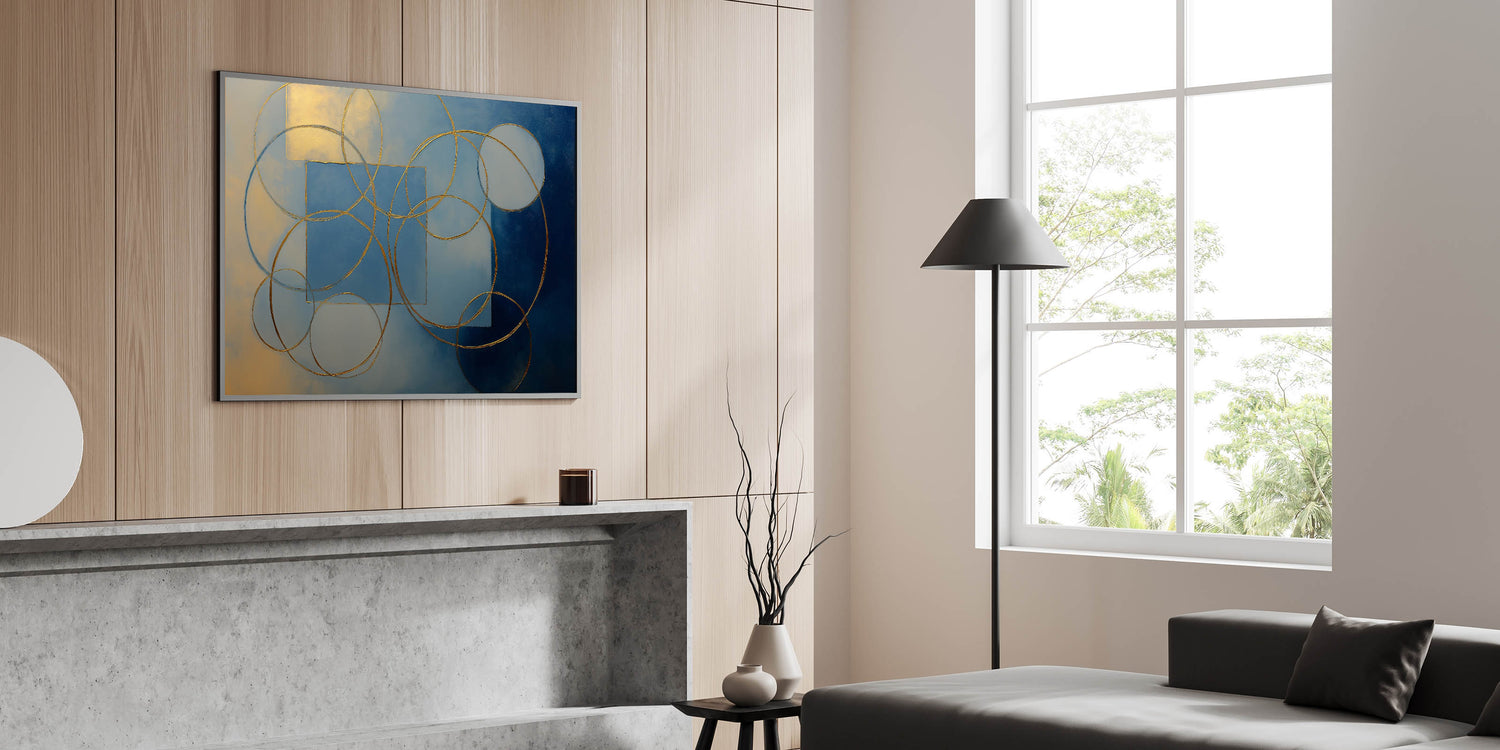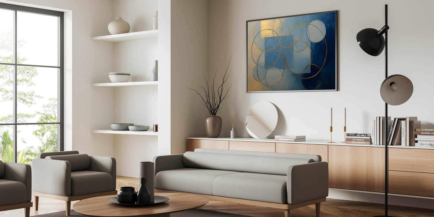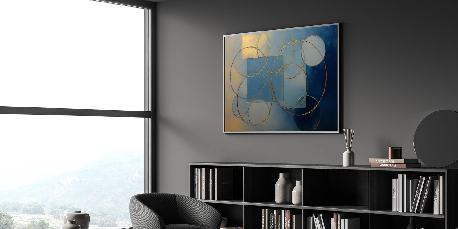 Elevate your interior with this stunning abstract wall art, featuring gold geometric circles and squares against a rich blue and beige gradient. This modern wall art combines luxury with artistic elegance, making it a perfect statement piece for wall art for living rooms, offices, or upscale interiors. Available in canvas wall art, framed wall art, and acrylic glass, this artwork seamlessly blends with contemporary and minimalist décor styles.