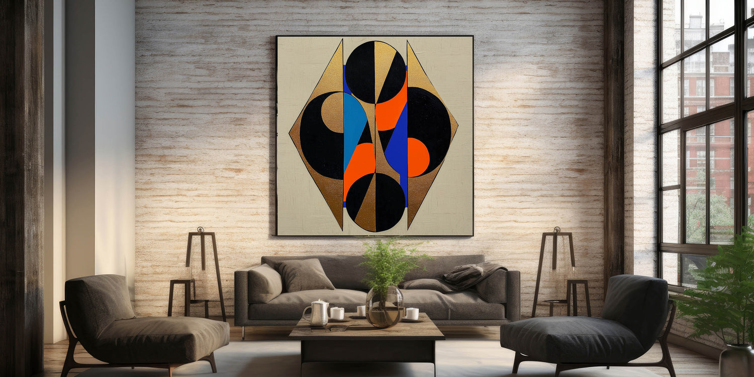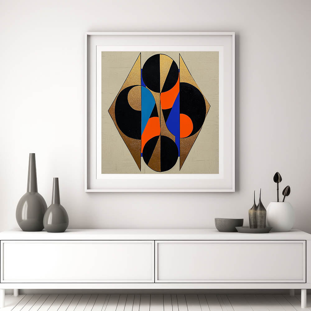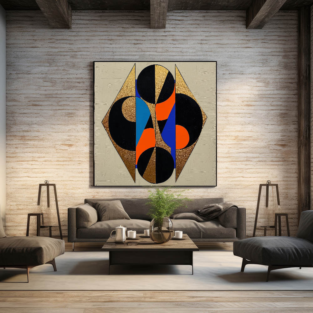 Make a bold statement with this modern geometric abstract wall art, a captivating fusion of black, gold, blue, and orange hues. This artwork’s structured composition and metallic accents create a sense of balance, depth, and sophistication, making it the perfect canvas wall art or framed wall art for modern living room decor.