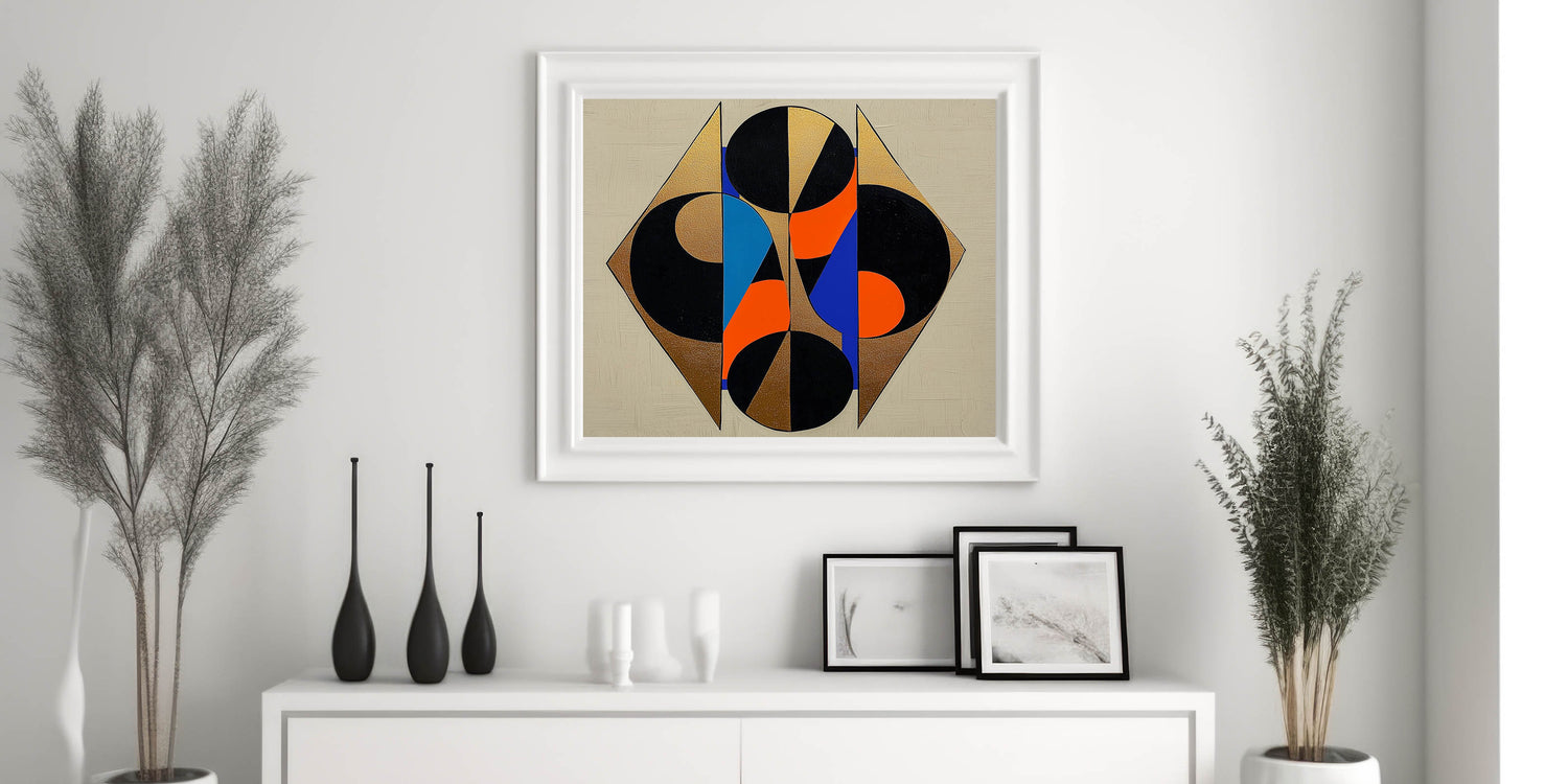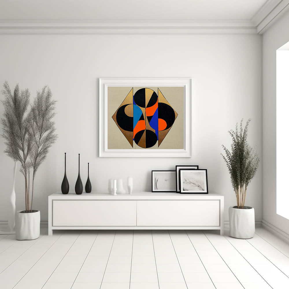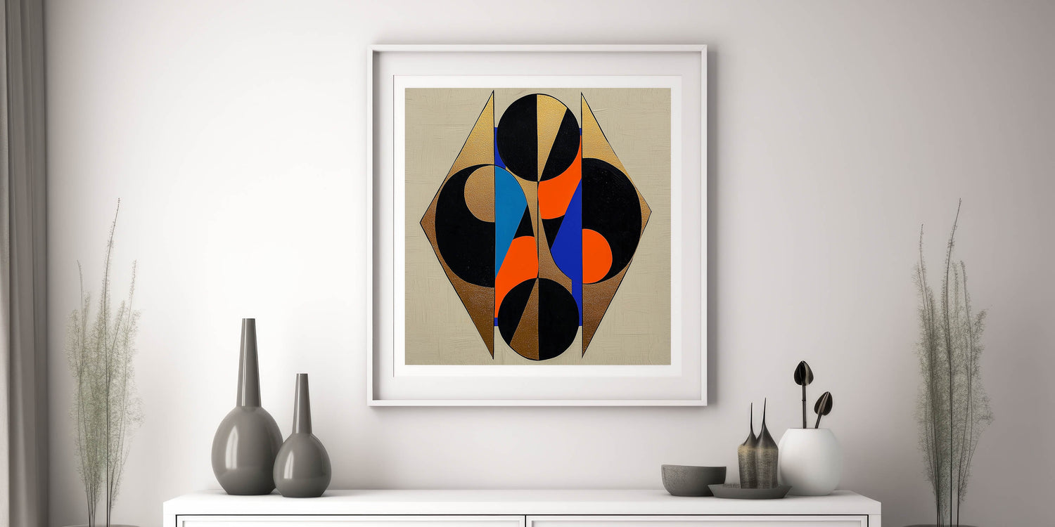 Make a bold statement with this modern geometric abstract wall art, a captivating fusion of black, gold, blue, and orange hues. This artwork’s structured composition and metallic accents create a sense of balance, depth, and sophistication, making it the perfect canvas wall art or framed wall art for modern living room decor.