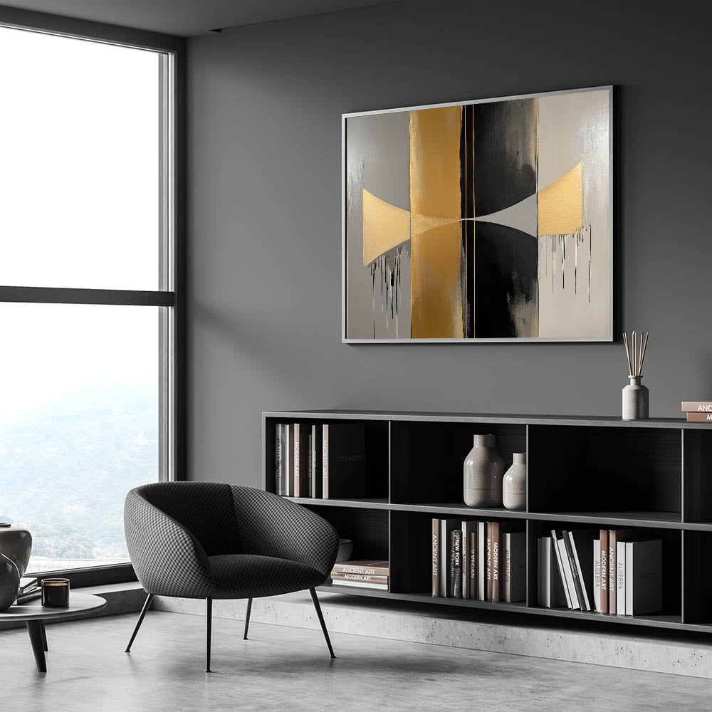 Make a bold statement with this modern geometric abstract wall art, featuring a striking interplay of gold, black, and neutral tones. The sleek symmetry and dripping metallic accents give this modern wall art a sophisticated edge, perfect for modern living room decor. This dynamic canvas wall art is ideal for those who appreciate contemporary luxury with a touch of minimalism.
