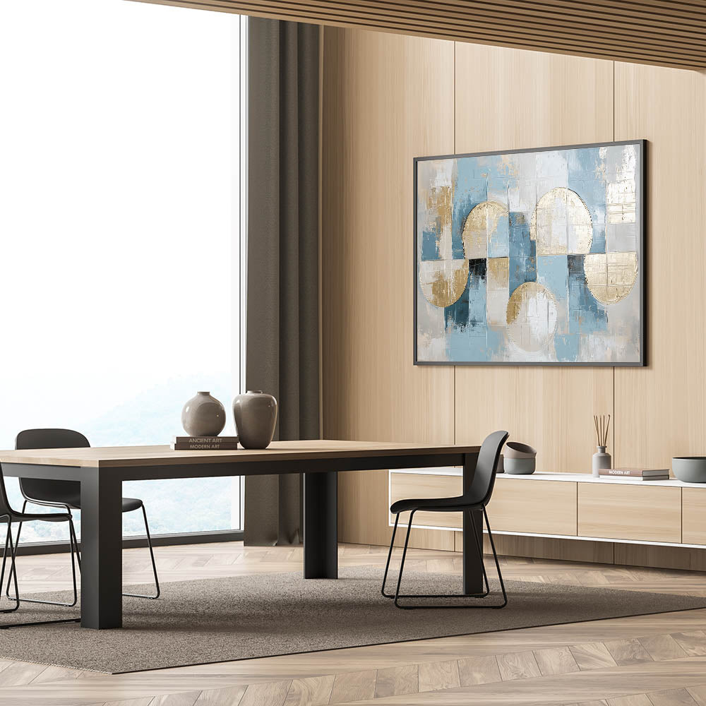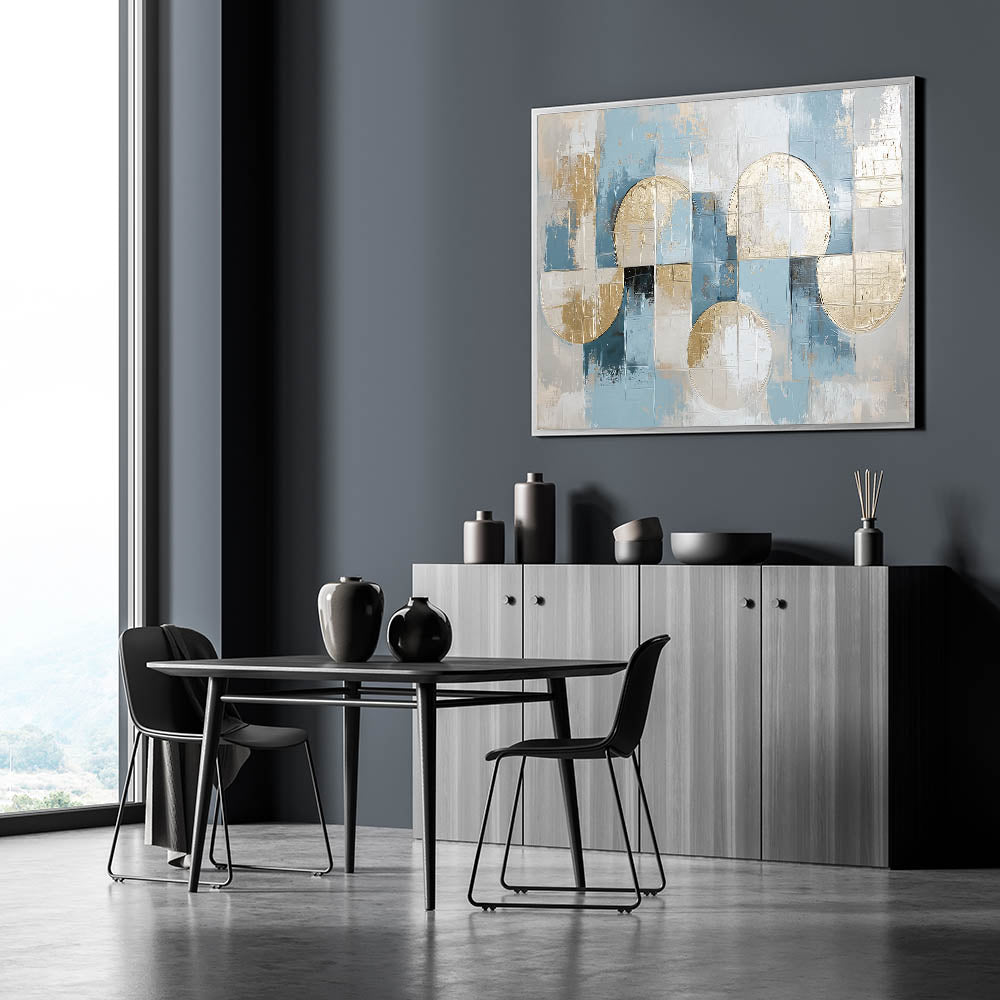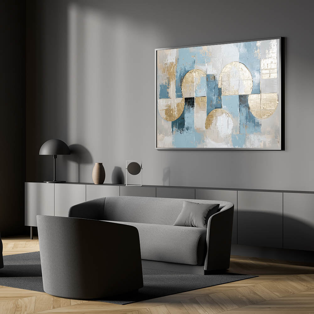 Bring elegance and sophistication to your space with this modern wall art, featuring a stunning abstract geometric design. The soft blend of gold, light blue, and white creates a harmonious balance, making it a perfect statement piece for living room wall art. The textured brushstrokes and metallic accents add depth and dimension, giving your walls a contemporary art print that radiates luxury and style.