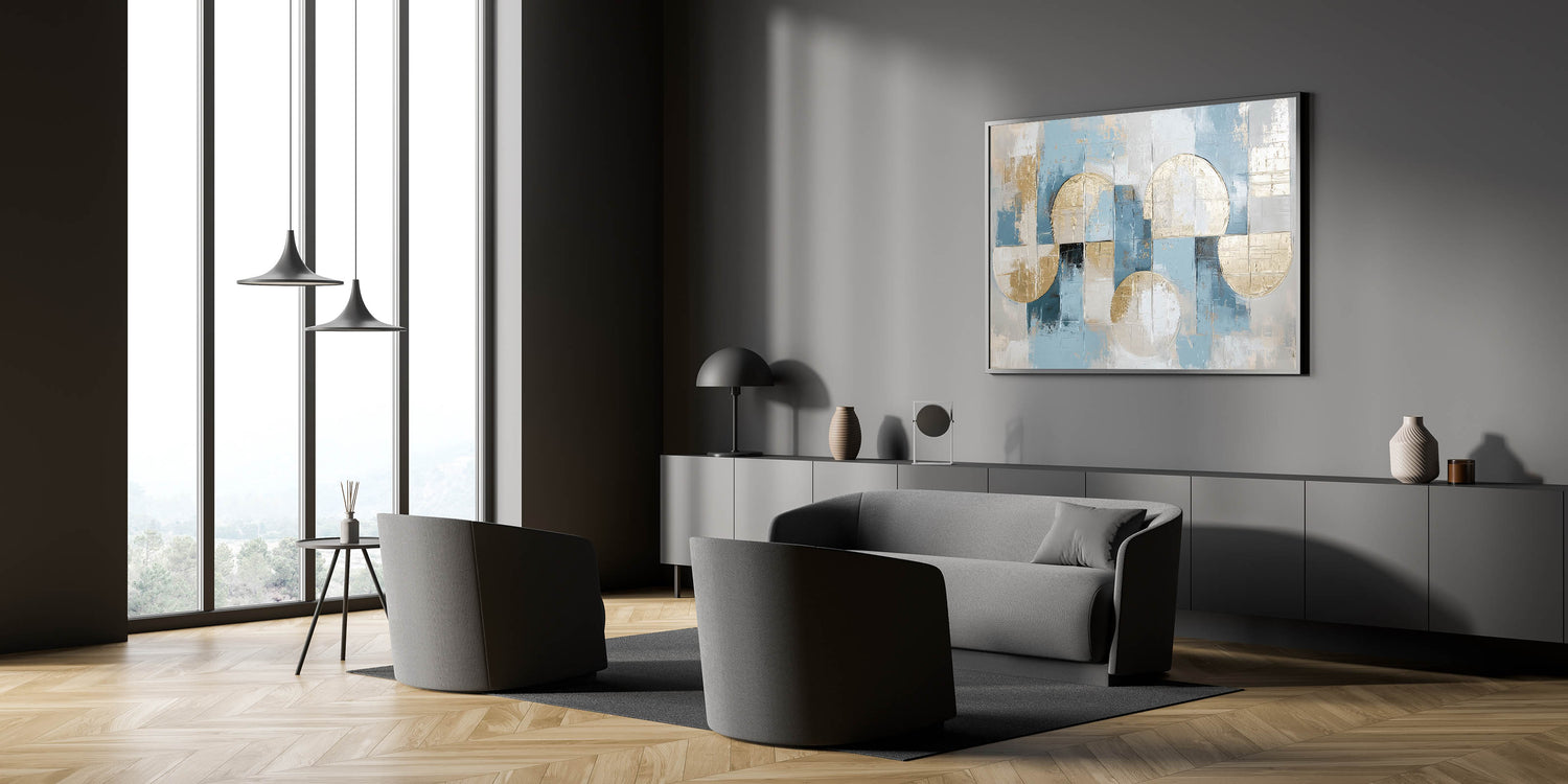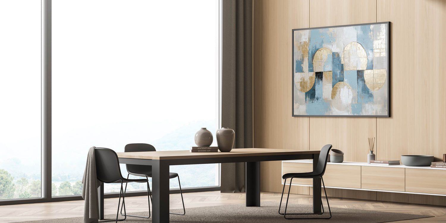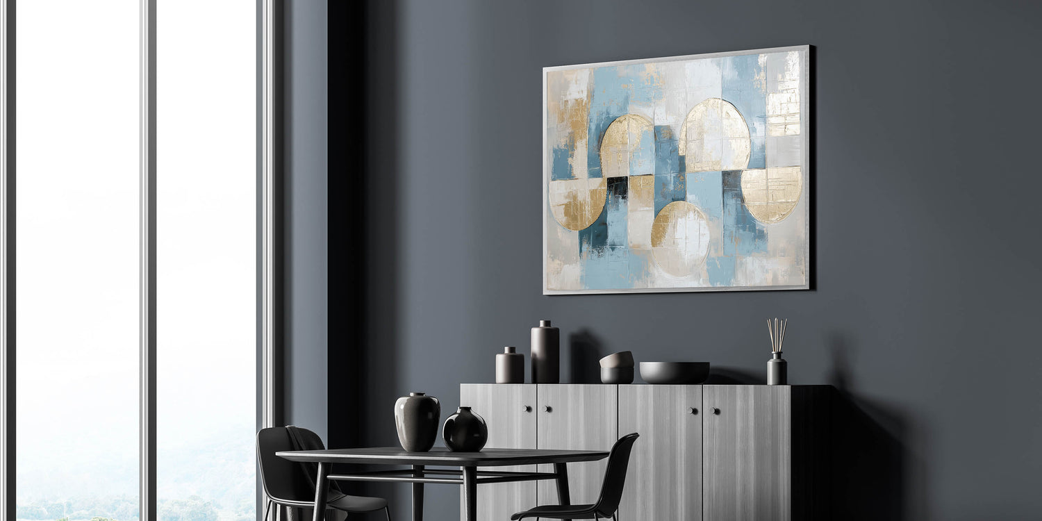 Bring elegance and sophistication to your space with this modern wall art, featuring a stunning abstract geometric design. The soft blend of gold, light blue, and white creates a harmonious balance, making it a perfect statement piece for living room wall art. The textured brushstrokes and metallic accents add depth and dimension, giving your walls a contemporary art print that radiates luxury and style.
