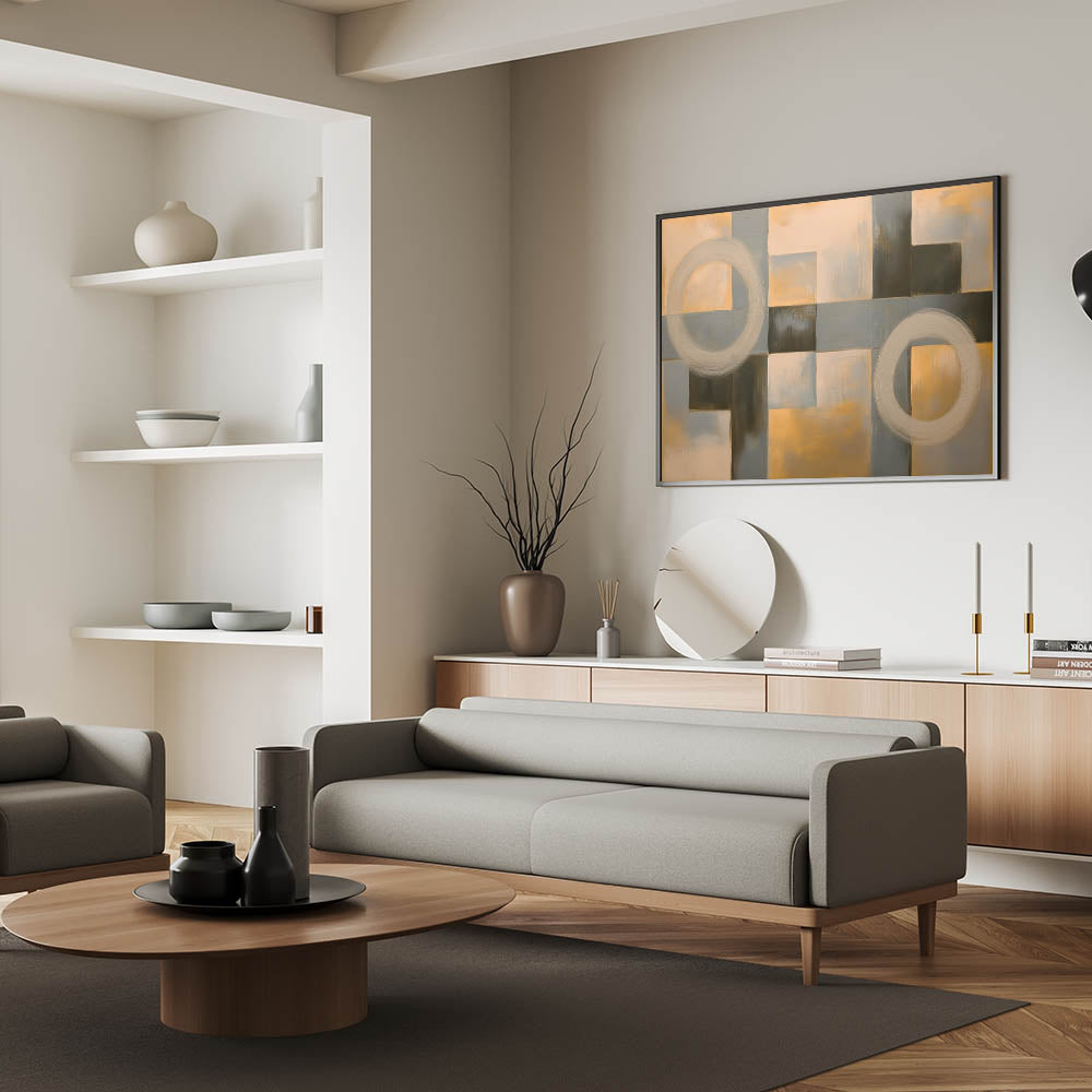 Bring harmony and sophistication to your space with this Modern Geometric Living Room Wall Art. Featuring a balanced arrangement of soft squares and overlapping circular accents, this modern wall art showcases a calming palette of beige, muted blue, and soft gold. Its minimalist design blends seamlessly with modern living room decor, making it a versatile statement piece.