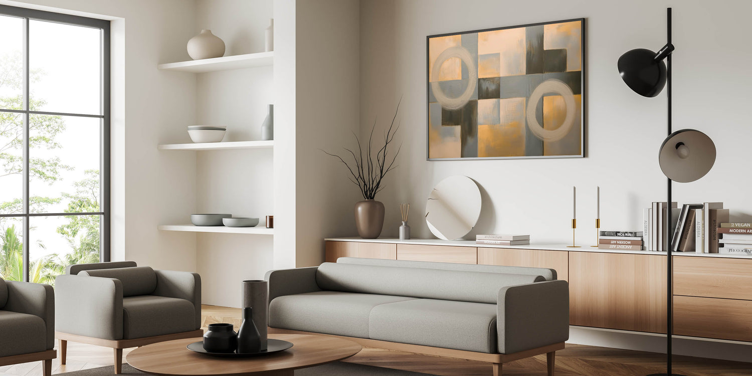 - Large canvas art with geometric patterns for a sleek contemporary look.