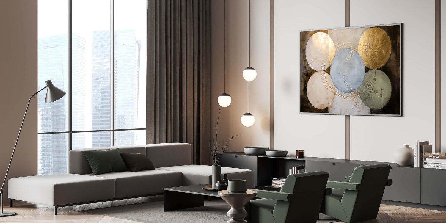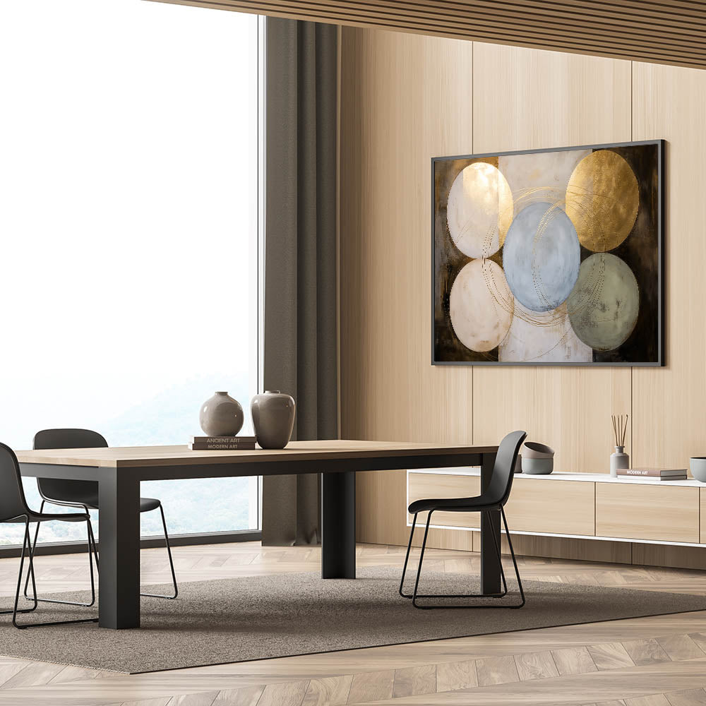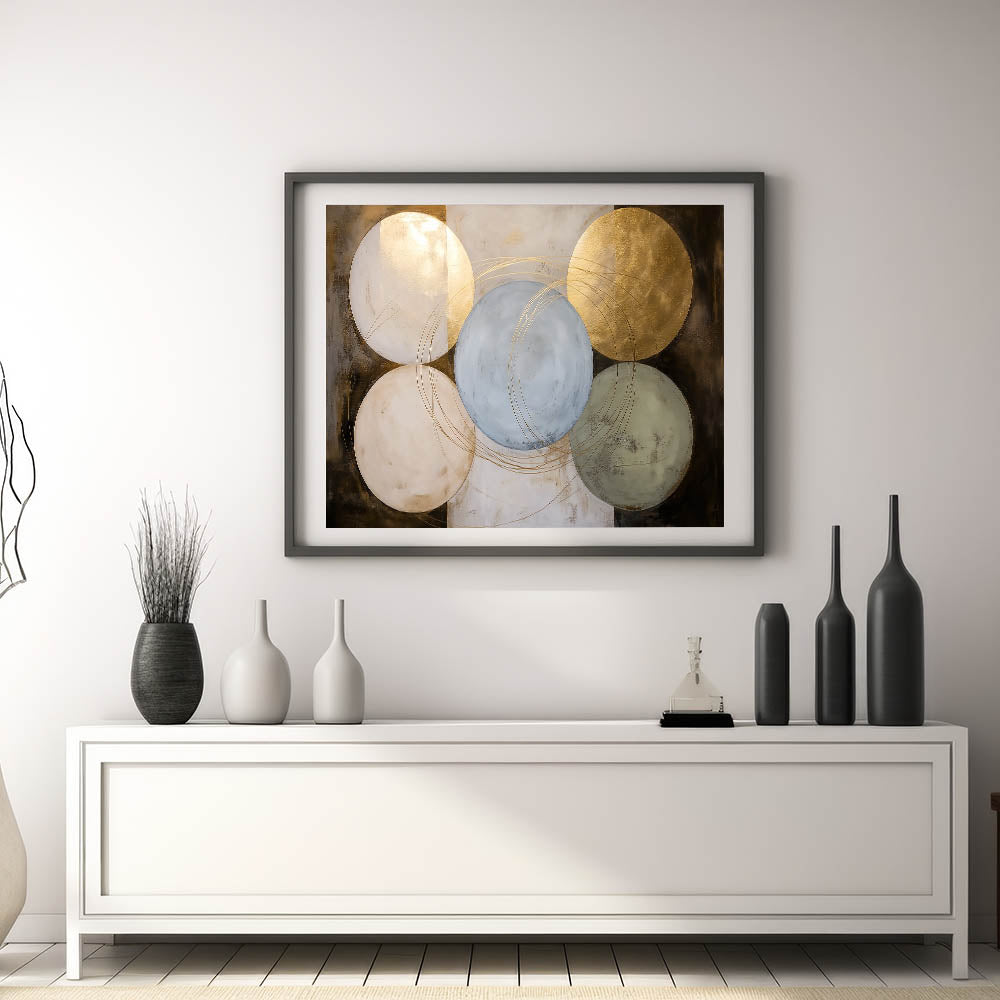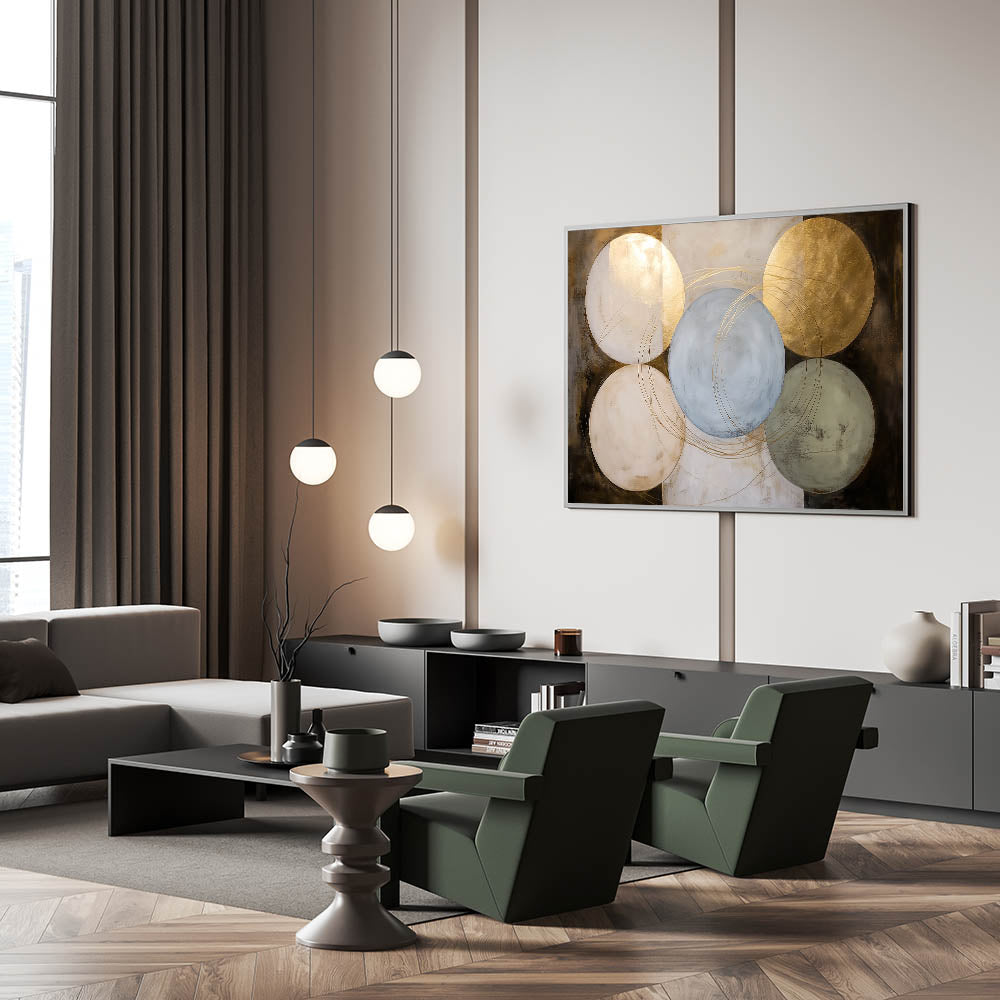 Elevate your space with this stunning geometric wall art for living rooms, featuring a captivating arrangement of golden, blue, and neutral-toned circles. This modern living room décor blends artistic elegance with a contemporary abstract design, making it a sophisticated statement piece for any space.