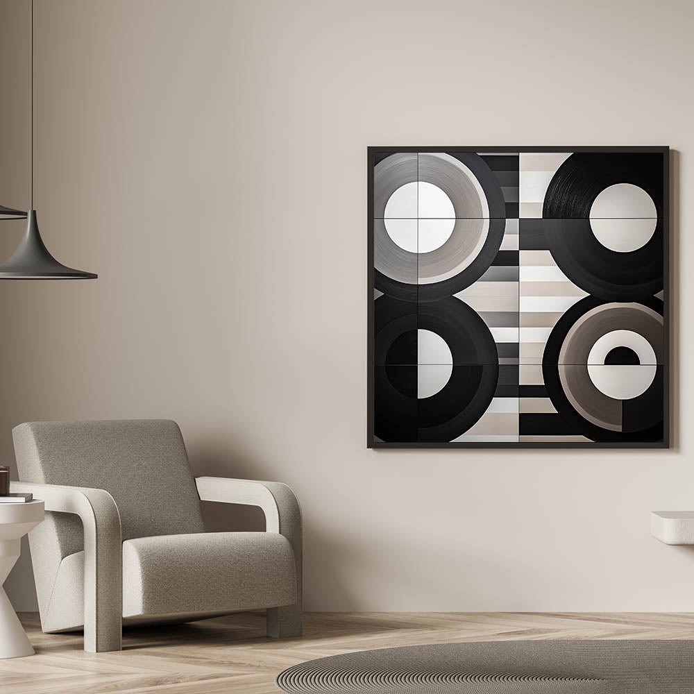 The symmetrical circular design combined with clean lines creates a sophisticated focal point in any space. Whether displayed as a large wall art piece or a stylish framed print, this artwork adds depth and contrast to your decor. Its timeless black and white palette ensures versatility, seamlessly blending with modern home interiors.