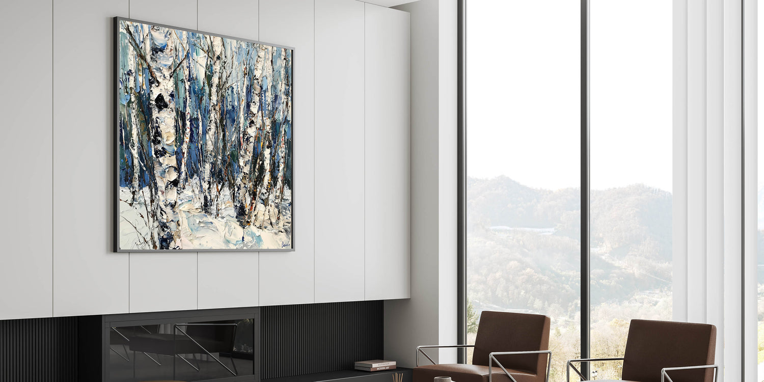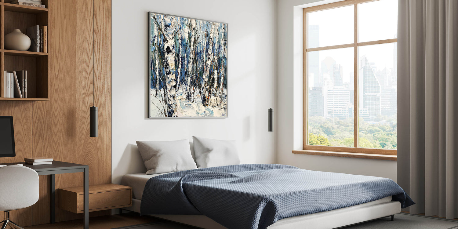 Bring the serene beauty of a winter forest into your home with this living room wall art, featuring stunning birch trees painted in an abstract wall art style. The textured brushstrokes and cool tones create a calming and contemporary ambiance, making it a perfect modern wall art piece for any interior.