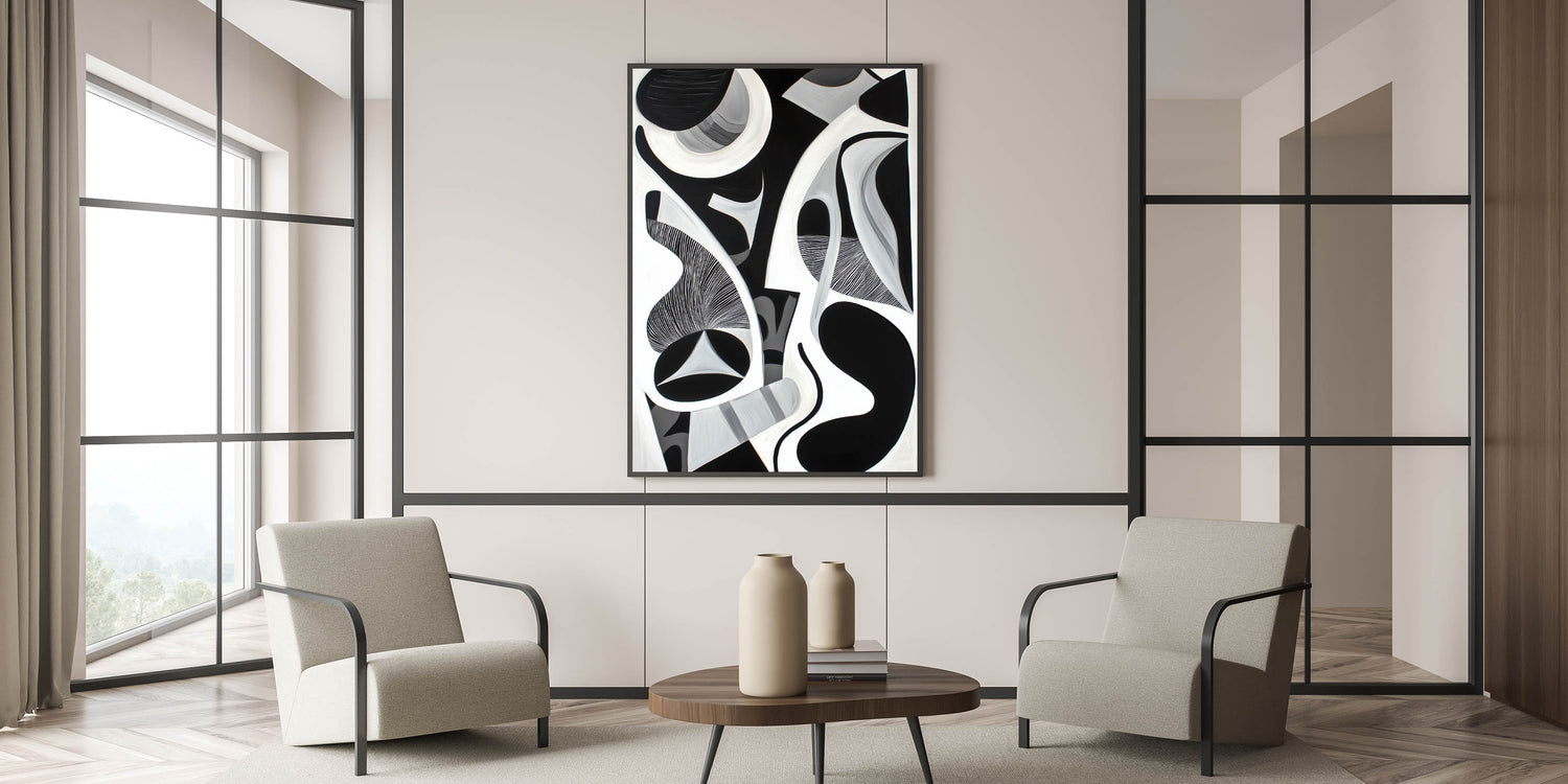 Make a bold statement with this modern wall art, featuring a striking black and white abstract composition. This living room wall art is designed with flowing geometric shapes and intricate patterns, making it an eye-catching addition to contemporary decor. The contrast between deep black, crisp white, and soft gray adds sophistication and modern appeal to any interior.
