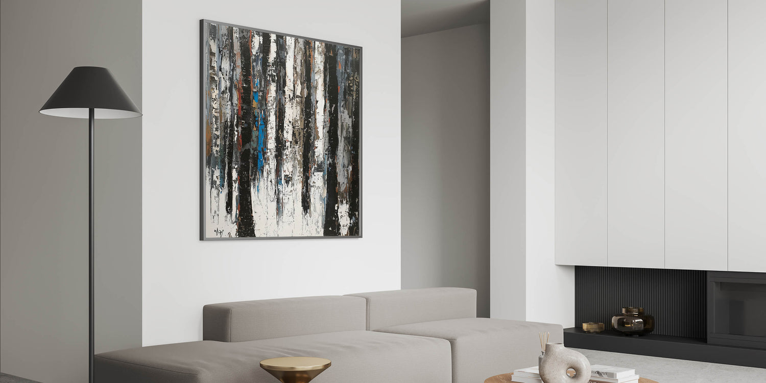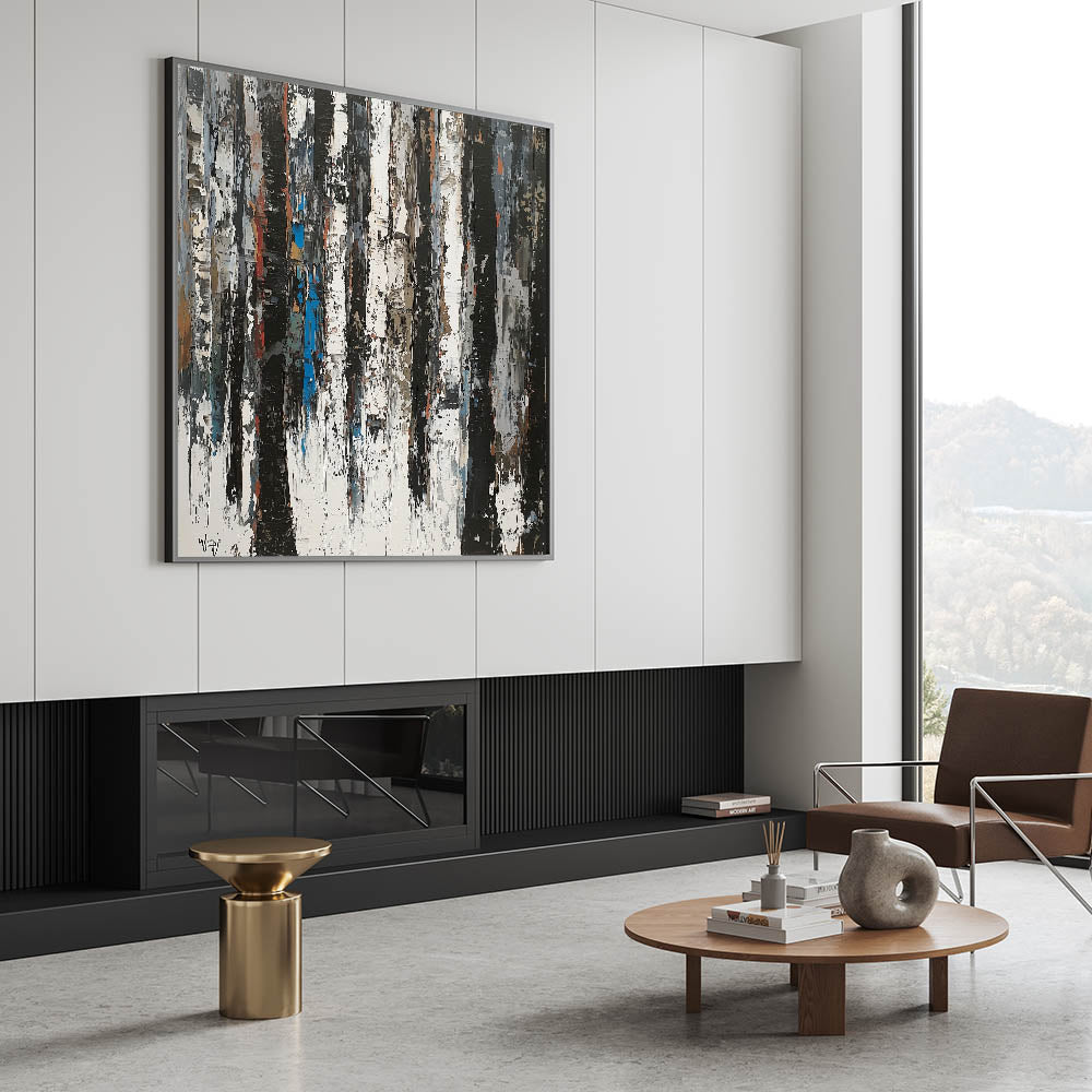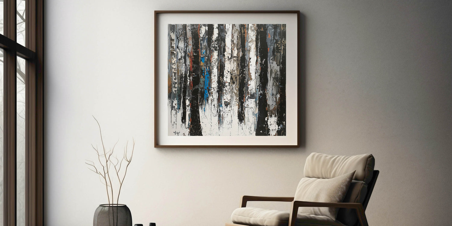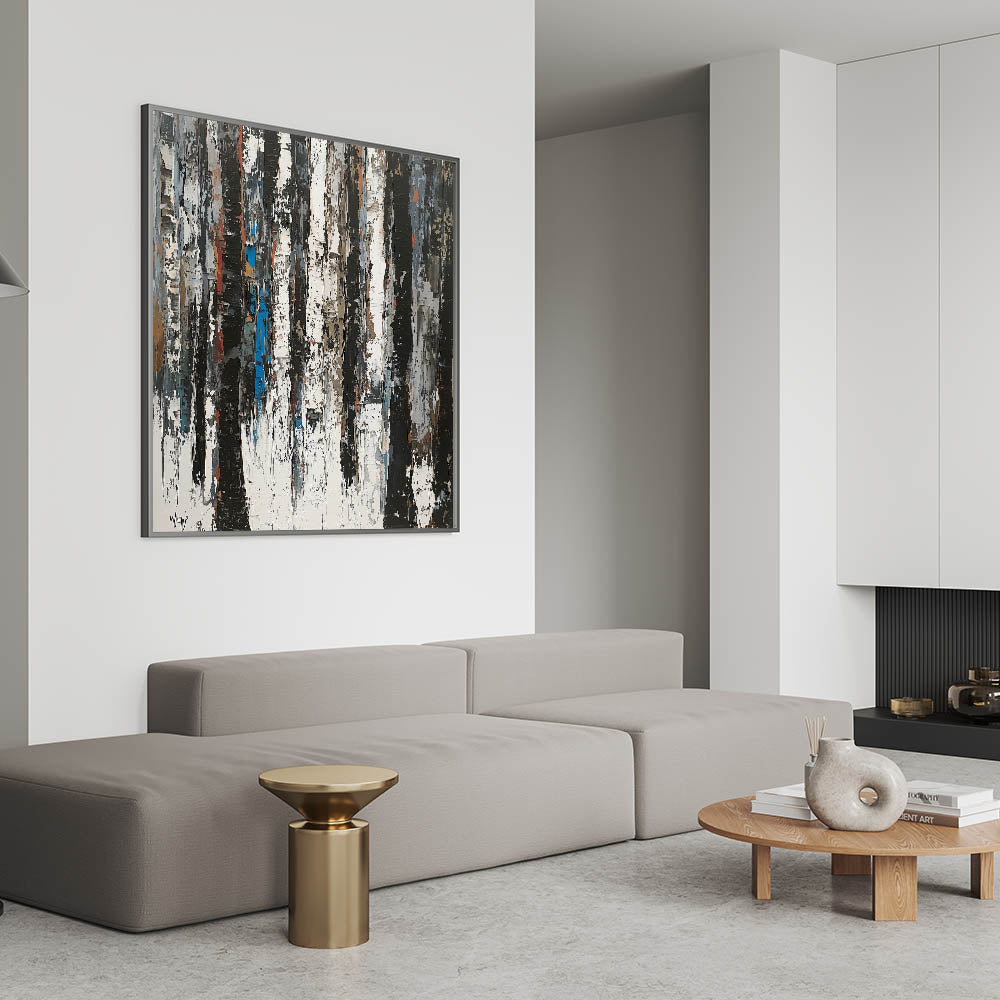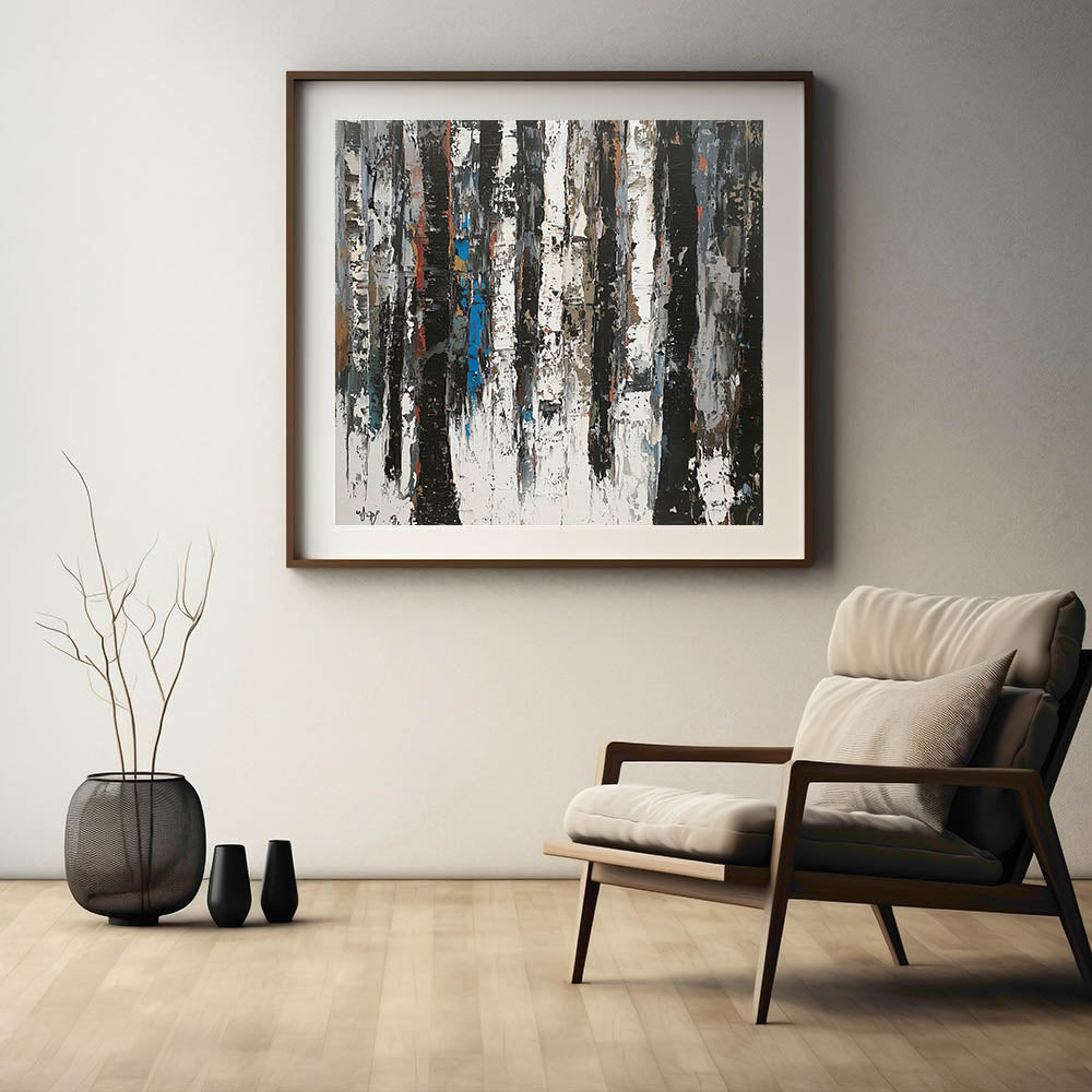 Add a touch of sophistication to your modern living room decor with this striking abstract birch tree wall art. Featuring bold black, white, gray, and subtle hints of blue and brown, this textured artwork creates a dynamic and elegant forest scene. The expressive palette knife strokes enhance the depth and texture, making it a stunning statement piece for any contemporary space.