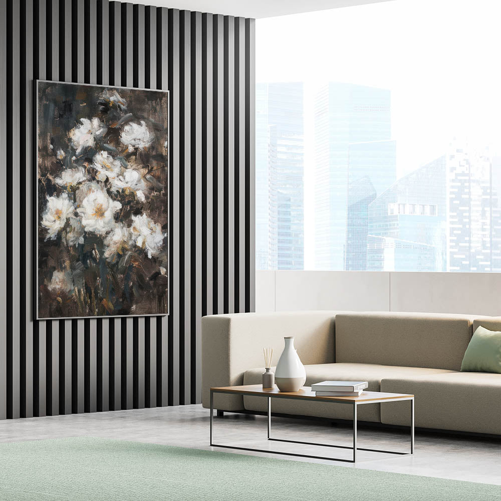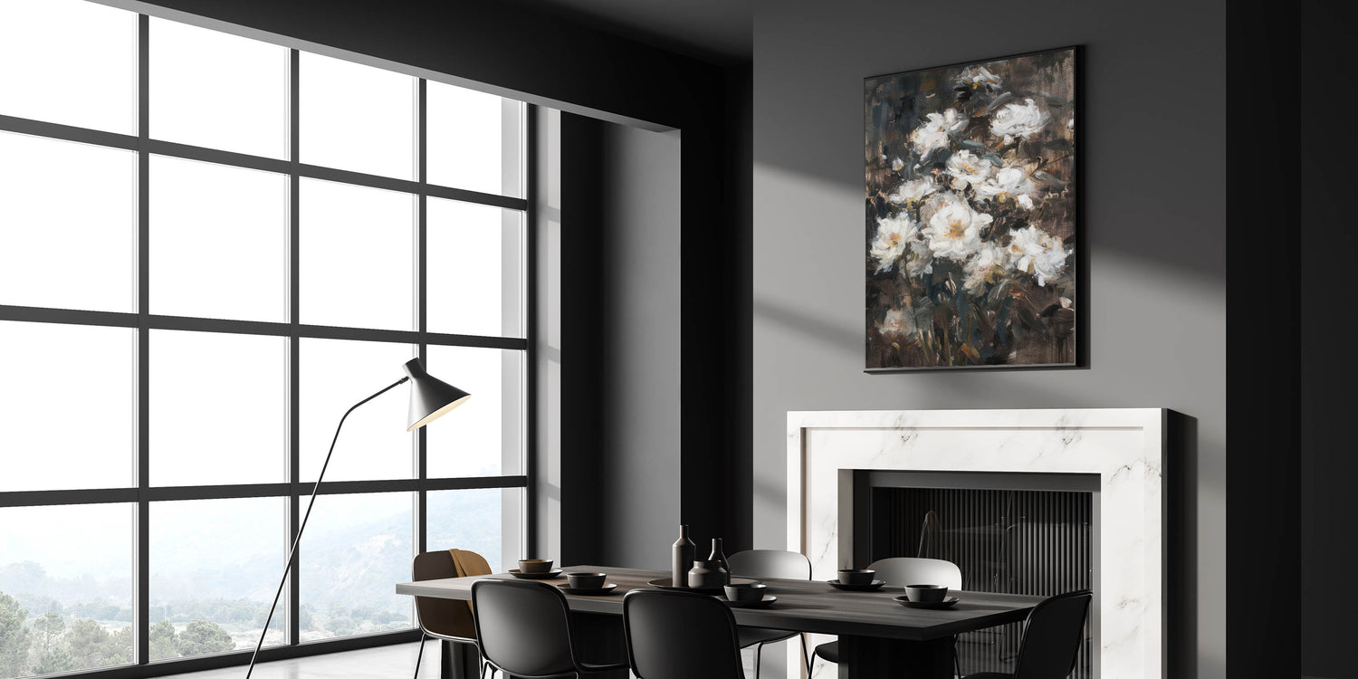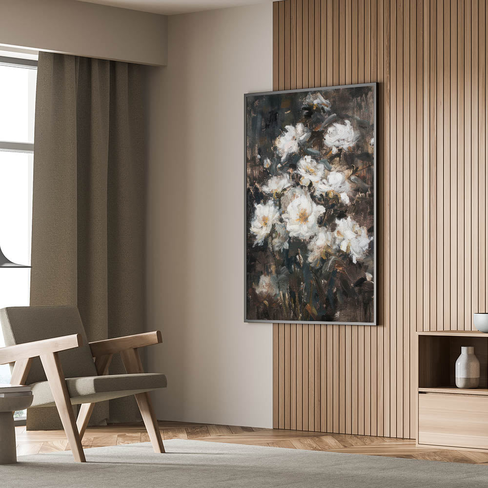 Add depth and sophistication to your home with this moody floral wall art. Featuring white flowers painted with expressive brushstrokes against a dark background, this modern wall art is the perfect blend of drama and elegance. Designed for contemporary living room décor, it makes a bold statement in any space.