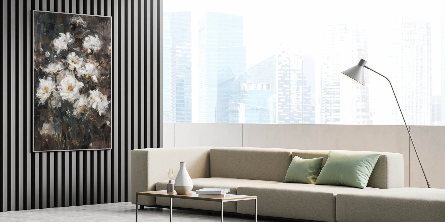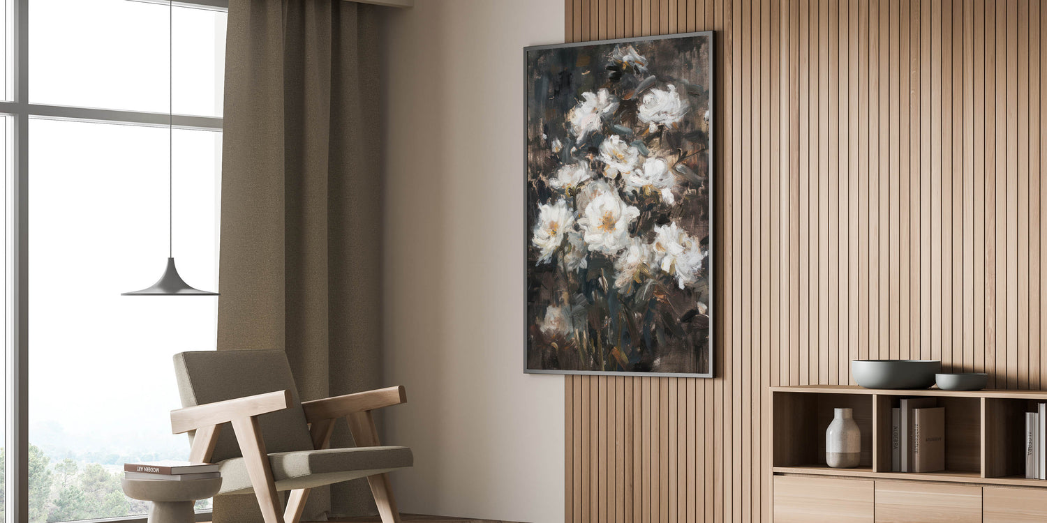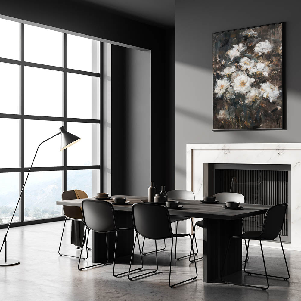 Add depth and sophistication to your home with this moody floral wall art. Featuring white flowers painted with expressive brushstrokes against a dark background, this modern wall art is the perfect blend of drama and elegance. Designed for contemporary living room décor, it makes a bold statement in any space.