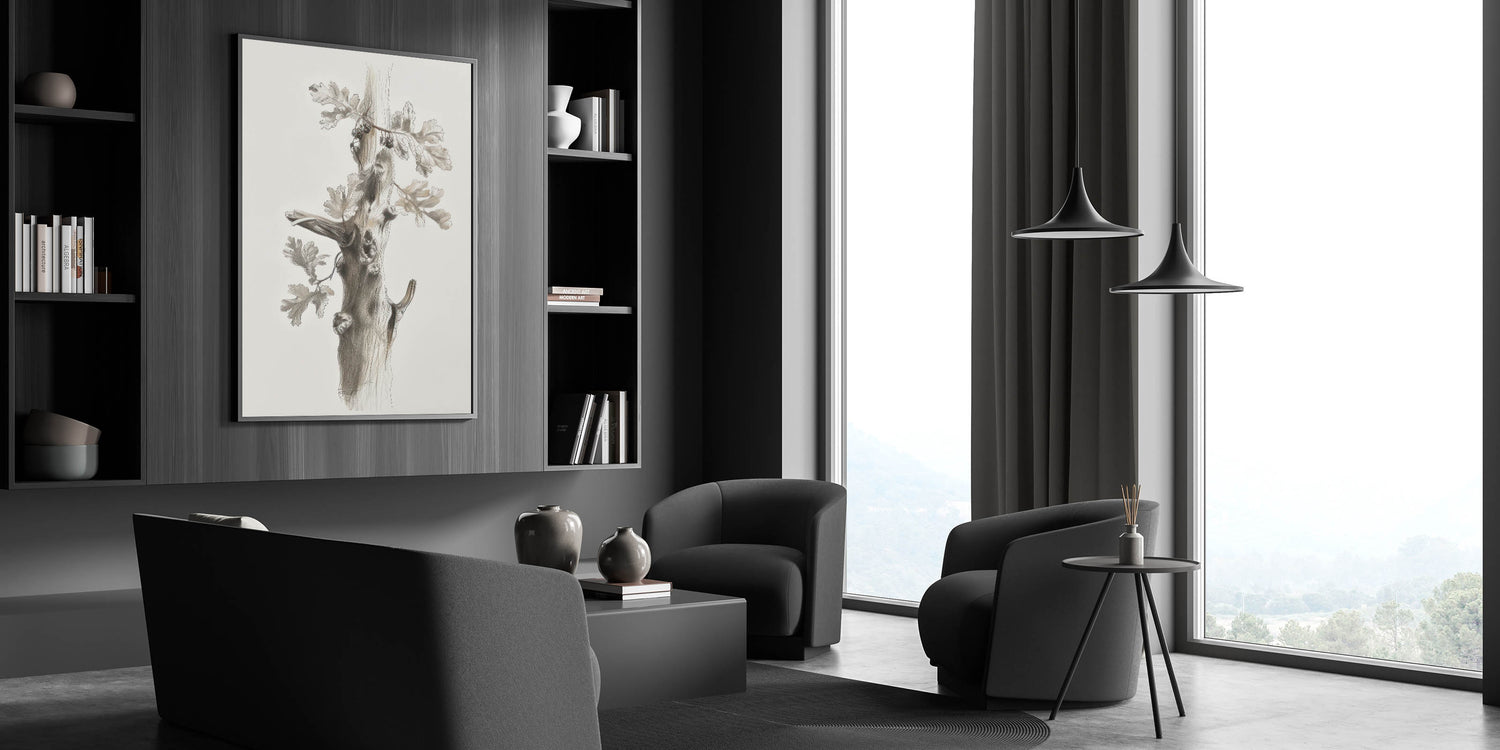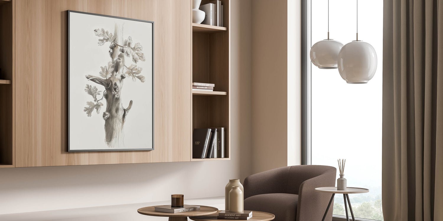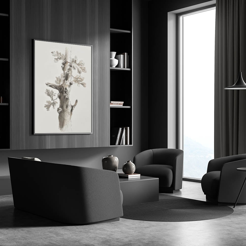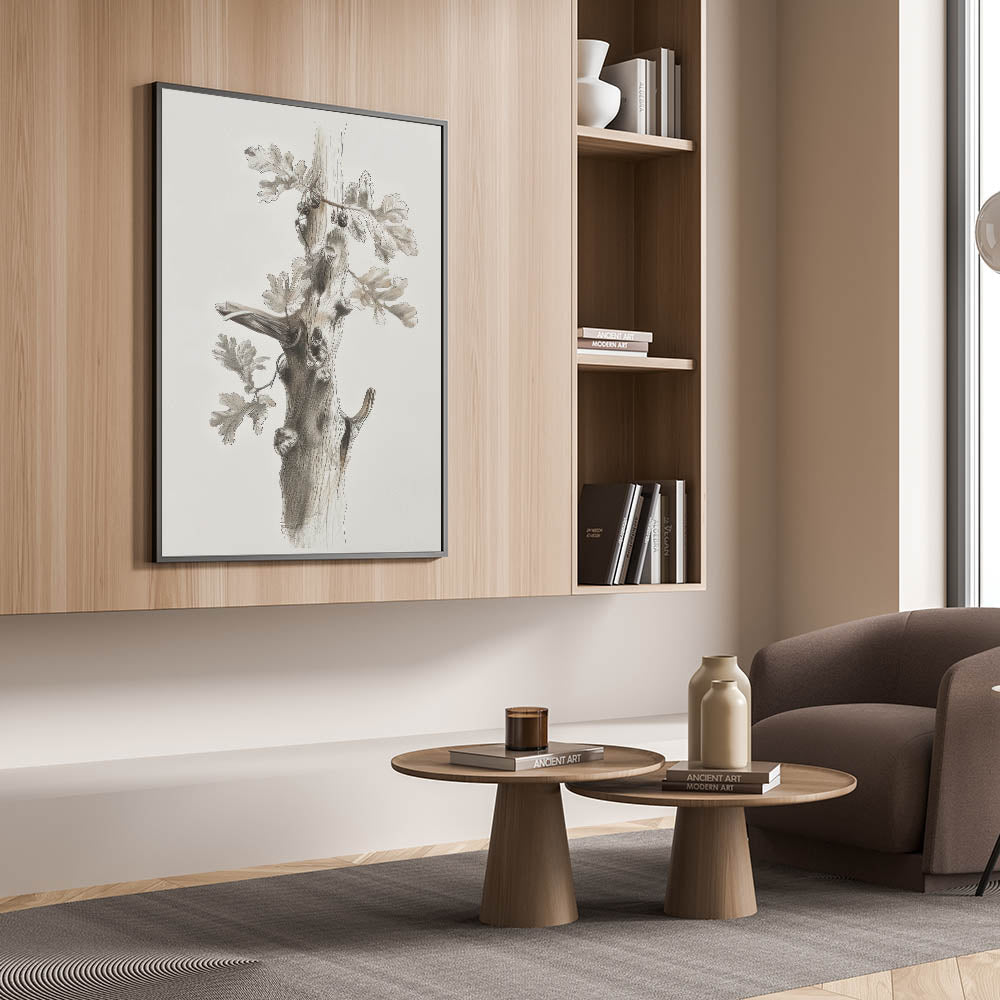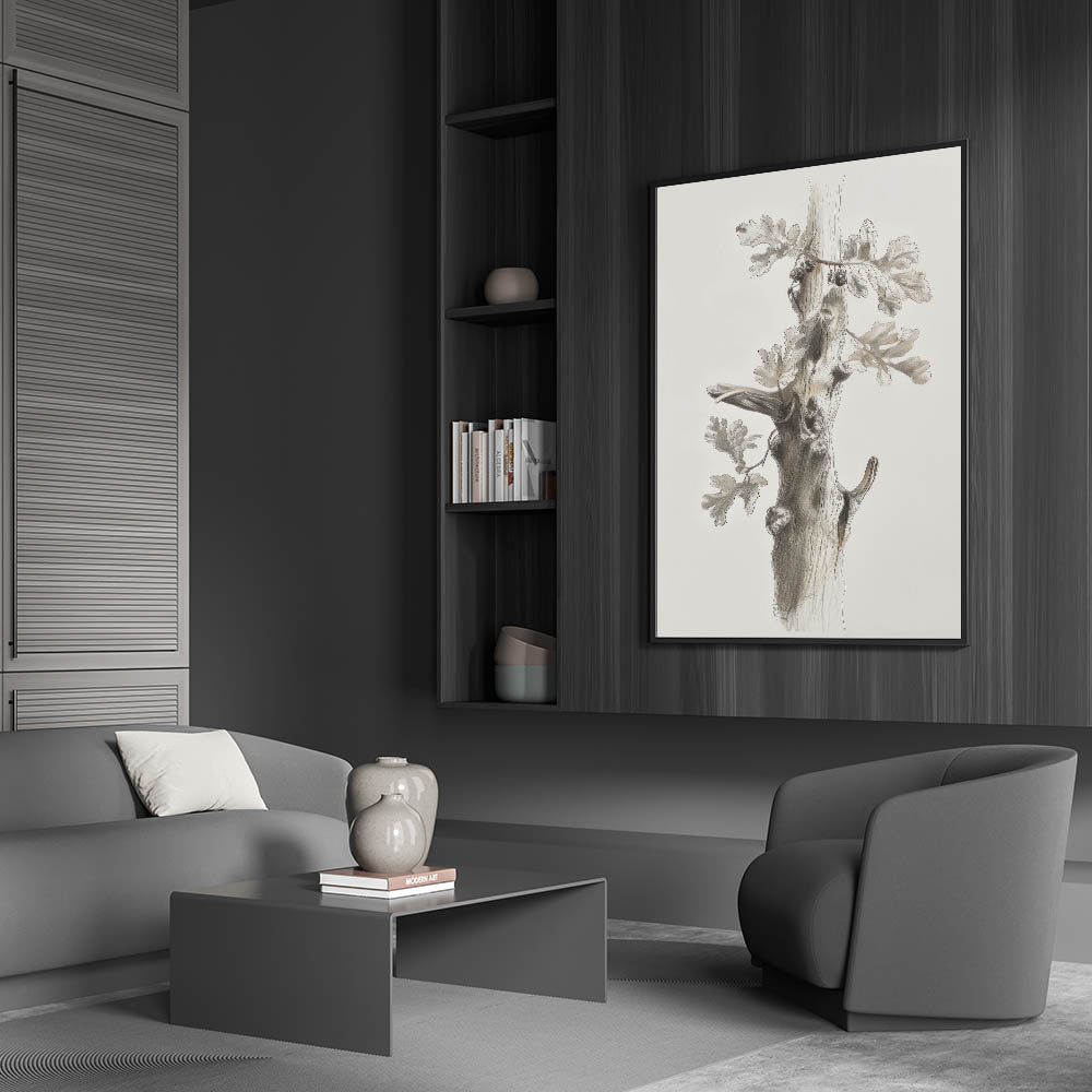 Bring the beauty of nature indoors with this stunning monochrome tree sketch, a detailed pencil drawing of a tree trunk with oak leaves and acorns. The fine shading and textural depth make this modern wall art a perfect piece for nature lovers and those who appreciate minimalist, contemporary décor. Whether displayed as canvas wall art, framed wall art, or acrylic glass, this contemporary art print adds a calming, organic touch to any interior.