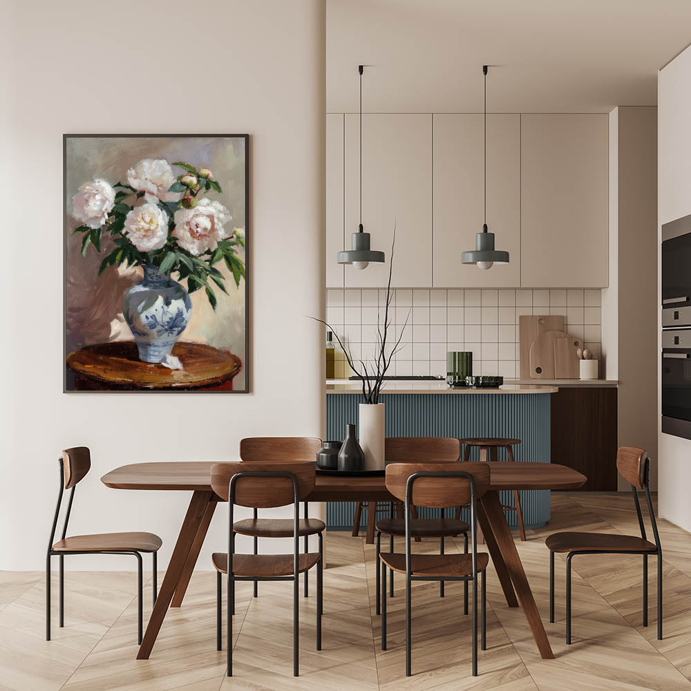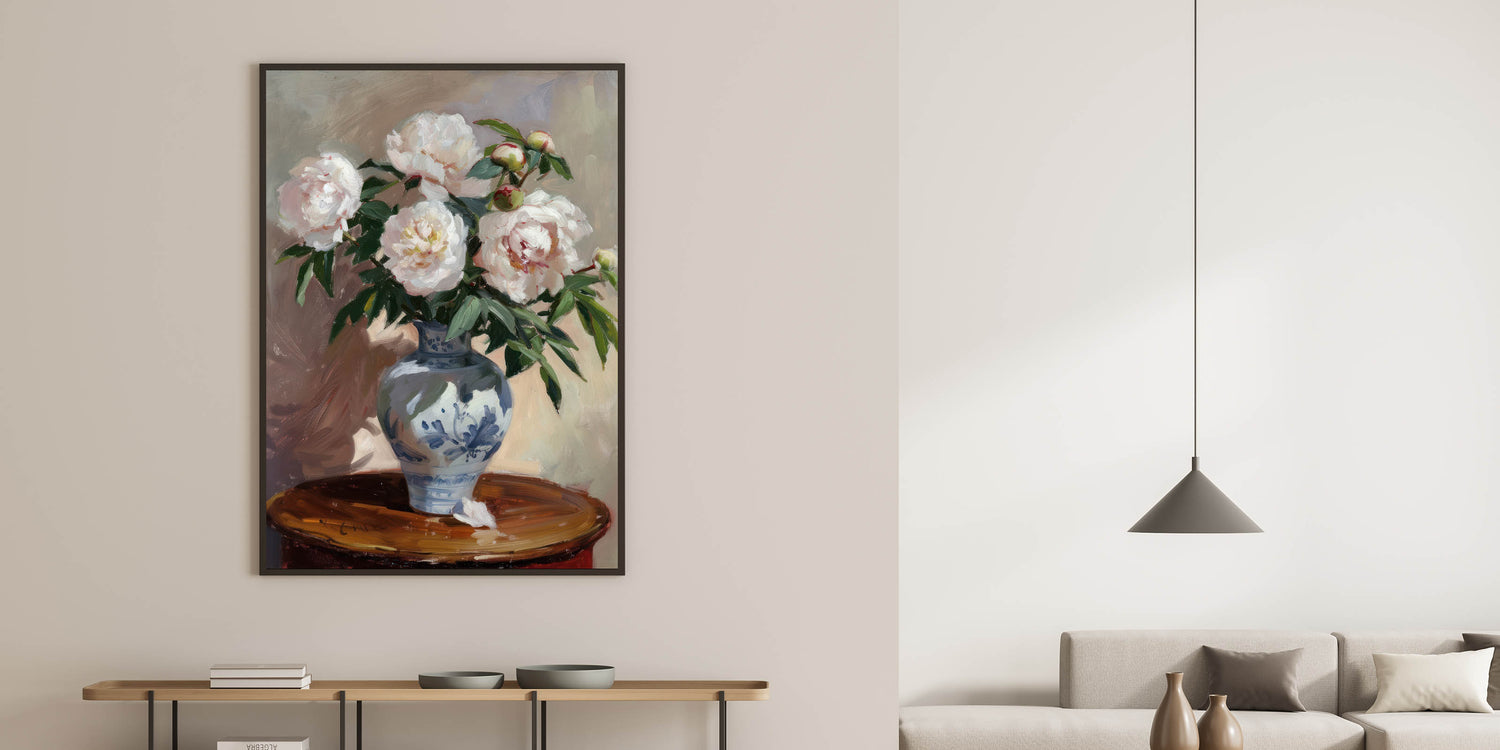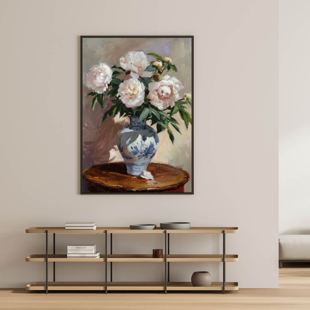 Bring a touch of timeless elegance to your home with this exquisite floral still life wall art. Featuring delicate peonies in full bloom, set in a beautifully decorated blue vase, this modern wall art captures the charm of classic botanical paintings. With its soft whites, rich greens, and warm neutral tones, this piece adds sophistication to any living room wall décor.