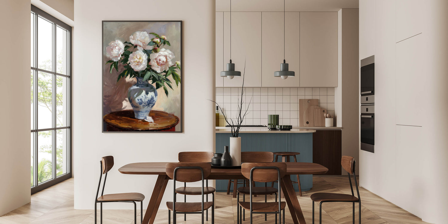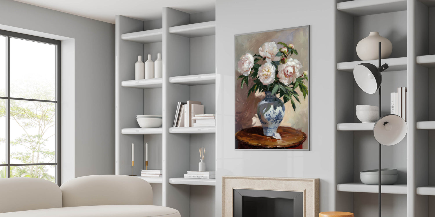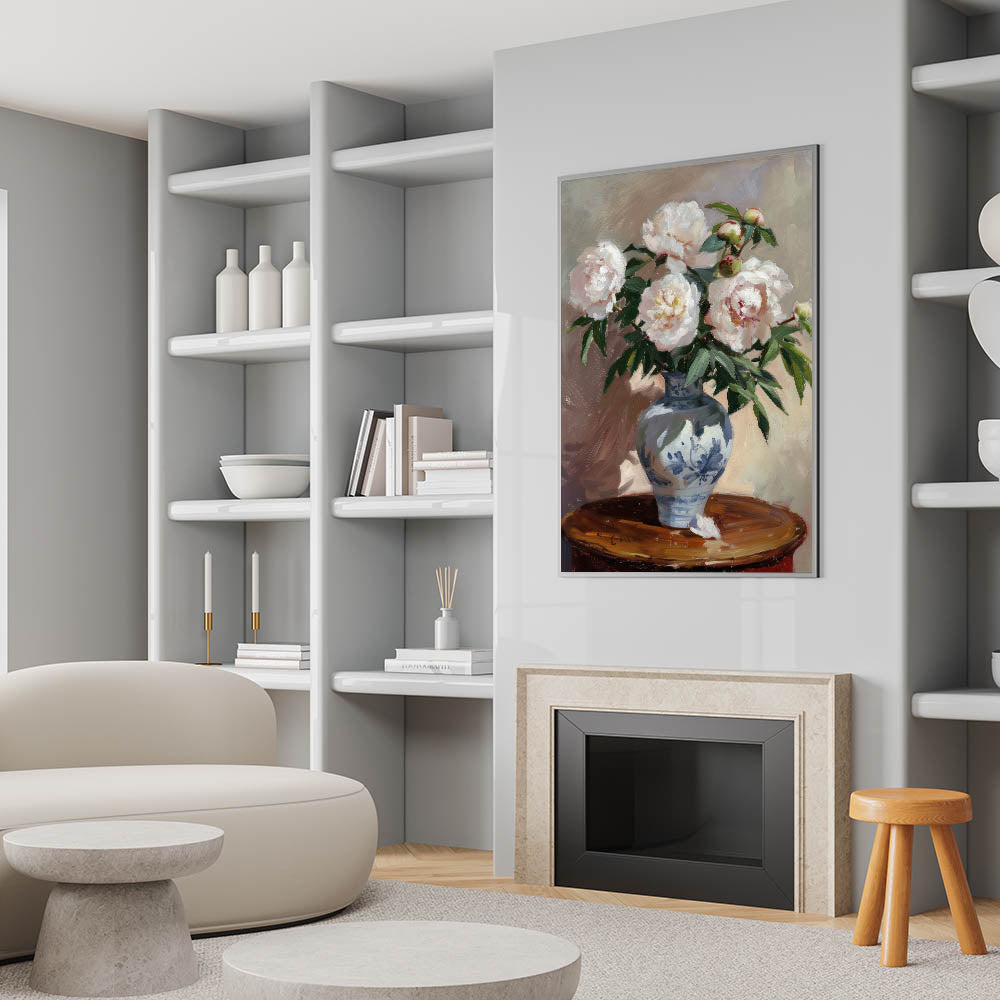 Bring a touch of timeless elegance to your home with this exquisite floral still life wall art. Featuring delicate peonies in full bloom, set in a beautifully decorated blue vase, this modern wall art captures the charm of classic botanical paintings. With its soft whites, rich greens, and warm neutral tones, this piece adds sophistication to any living room wall décor.