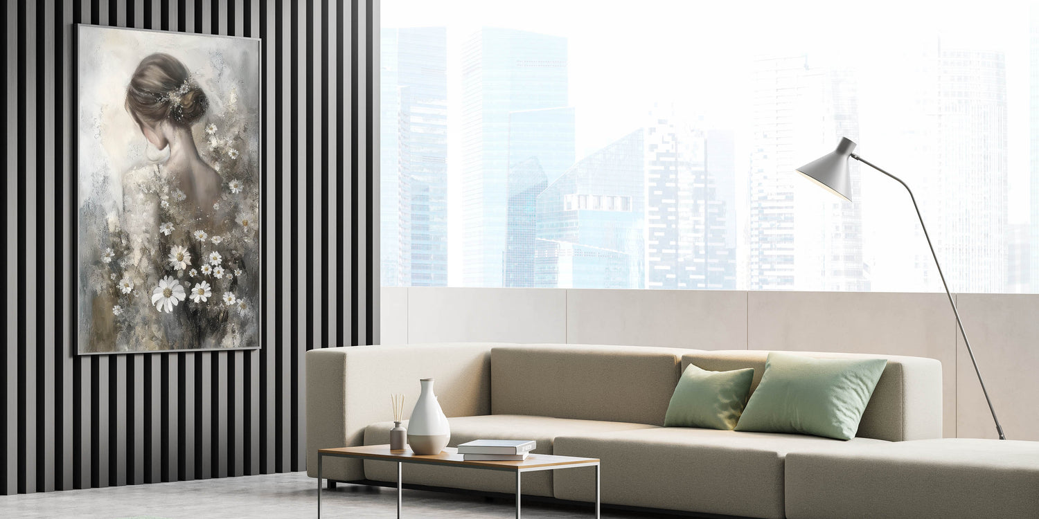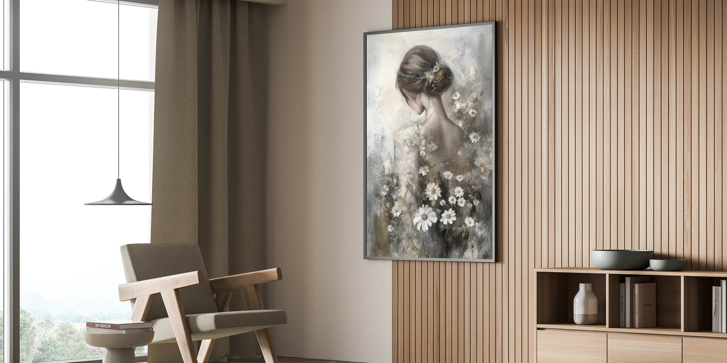 Add timeless elegance to your space with this romantic figurative wall art for the living room. Featuring a delicate portrait of a woman surrounded by soft white florals and muted beige tones, this modern wall art radiates beauty, grace, and sophistication. The painterly effect and subtle texture make this artwork a perfect choice for contemporary living room decor, bedroom interiors, or elegant spaces.