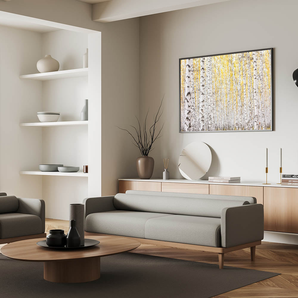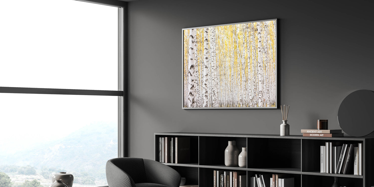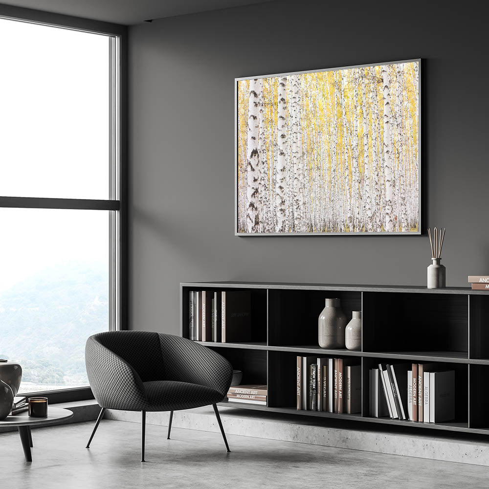 This framed wall art is perfect for those who love abstract art pieces infused with the beauty of the outdoors. Whether you're looking for large canvas art or contemporary art prints, this elegant birch tree landscape will bring warmth and serenity to your home.