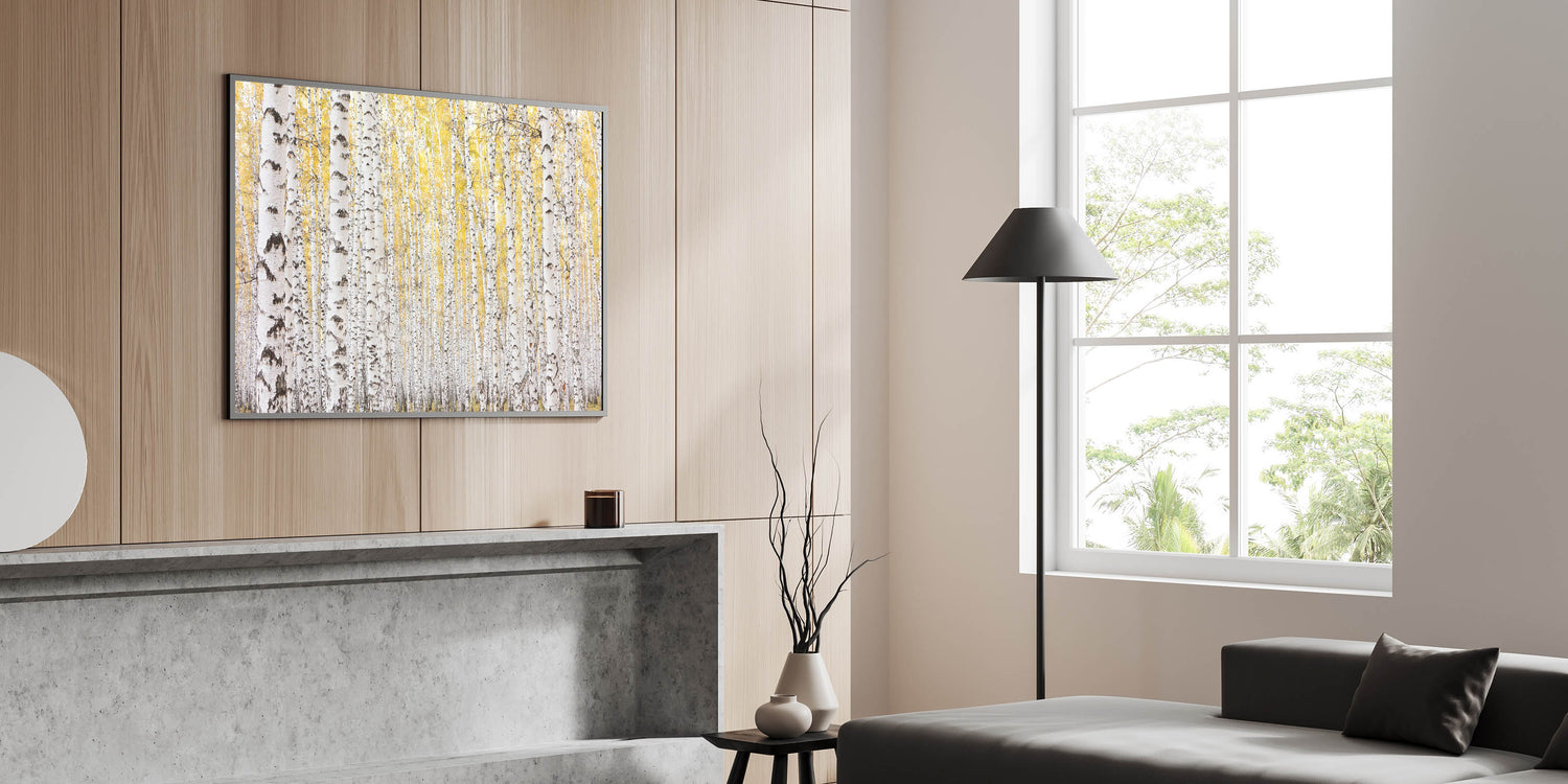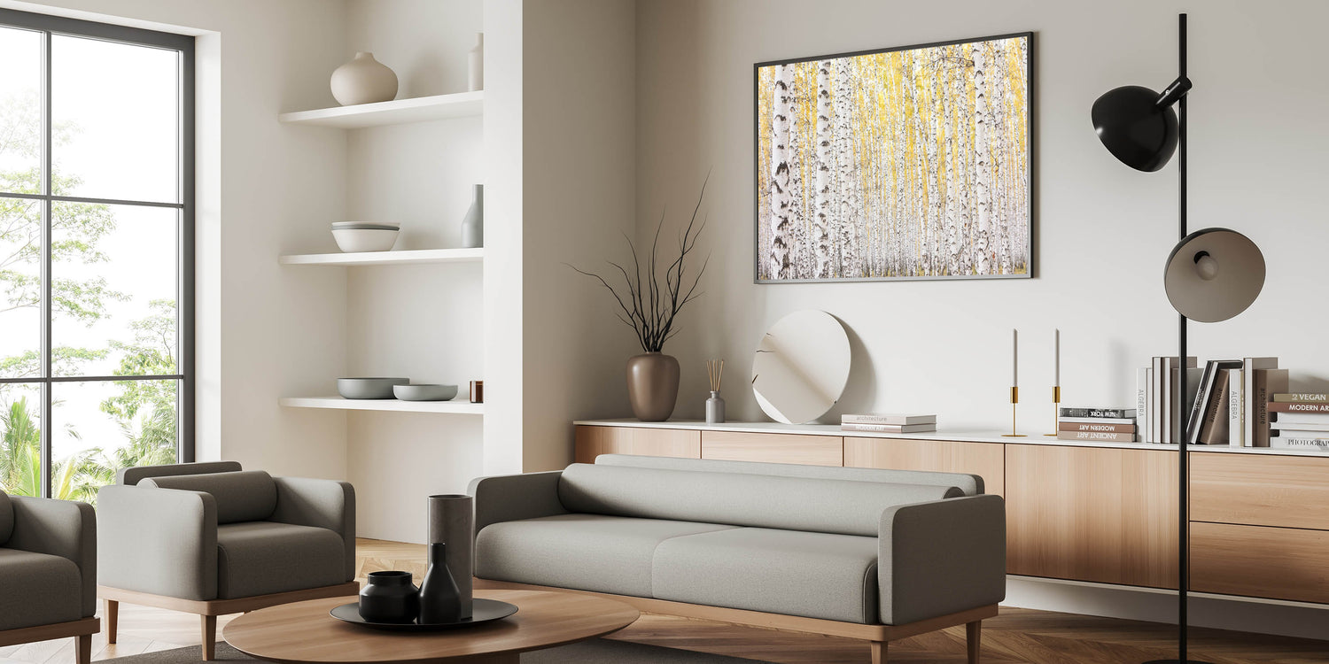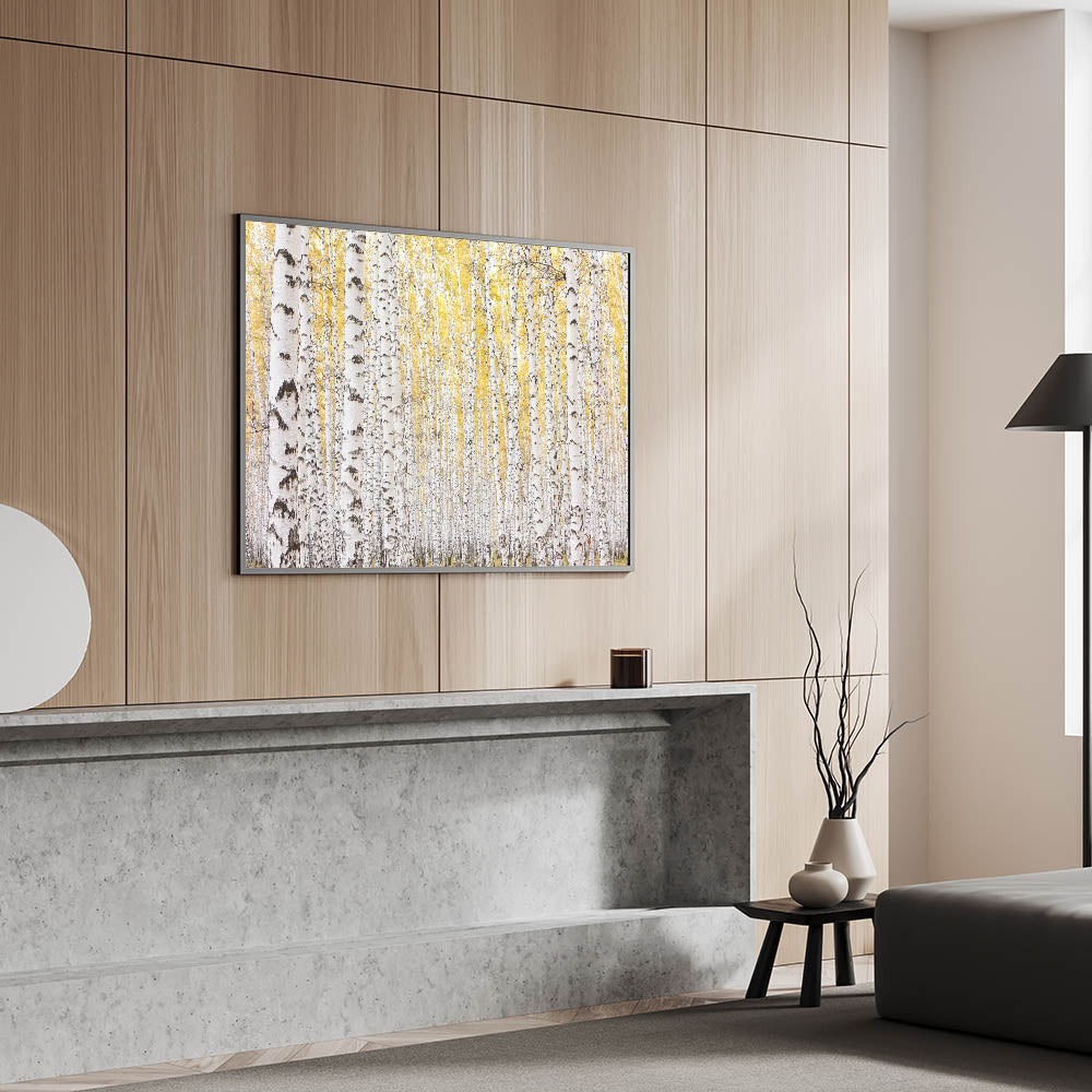 This framed wall art is perfect for those who love abstract art pieces infused with the beauty of the outdoors. Whether you're looking for large canvas art or contemporary art prints, this elegant birch tree landscape will bring warmth and serenity to your home.