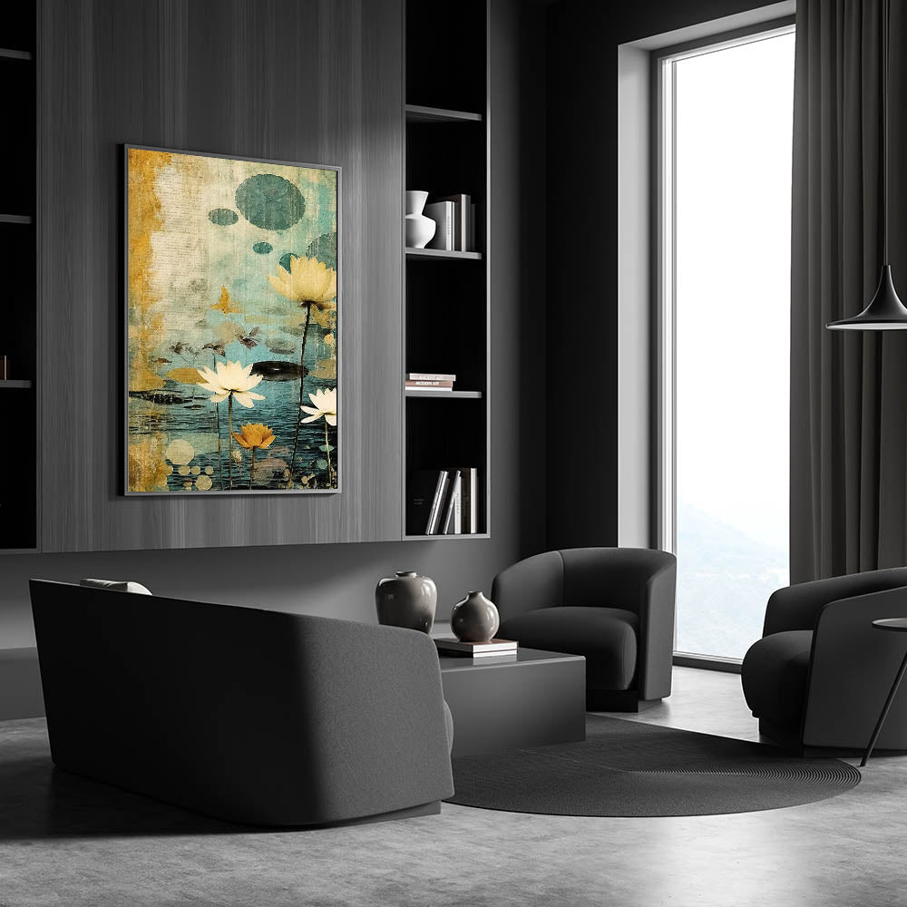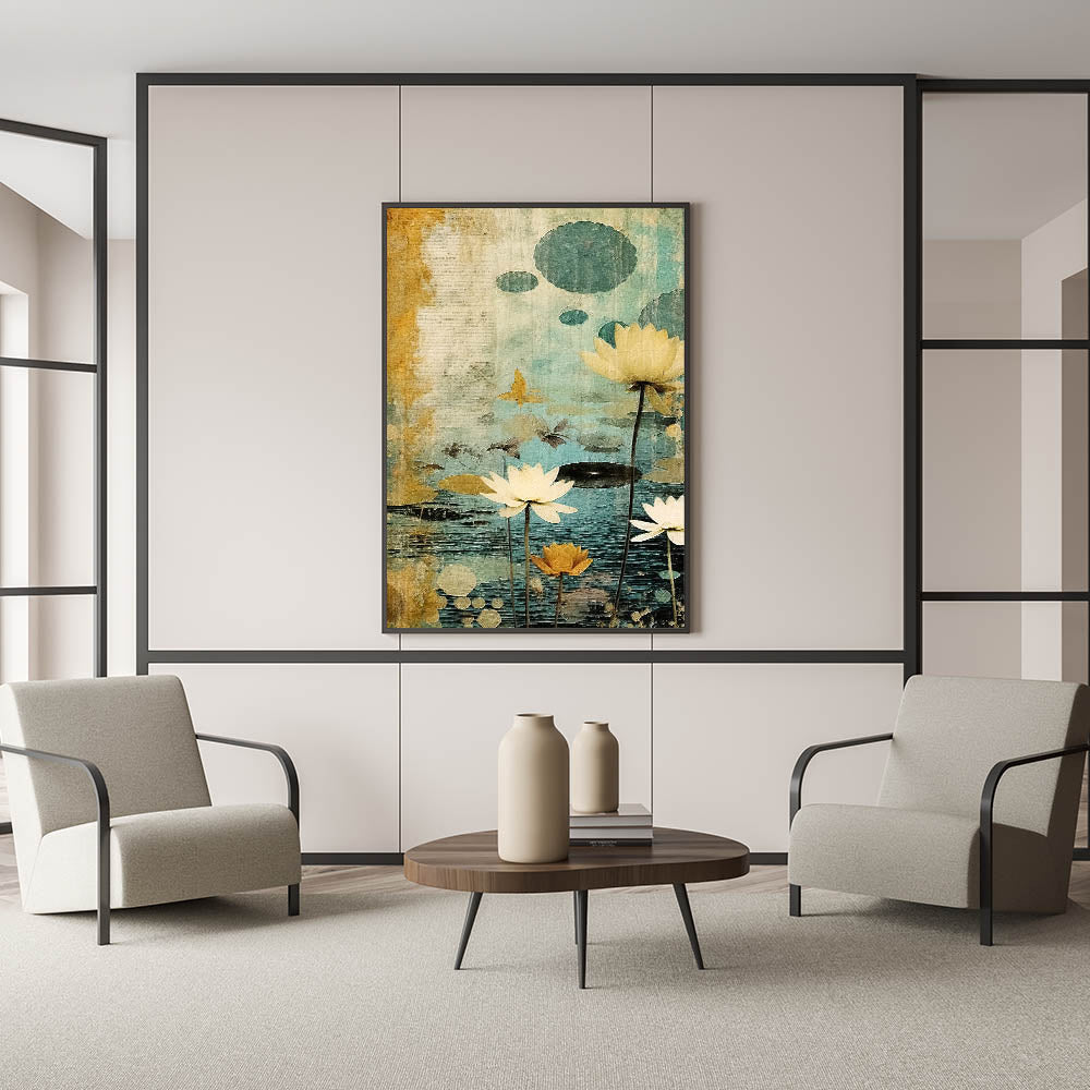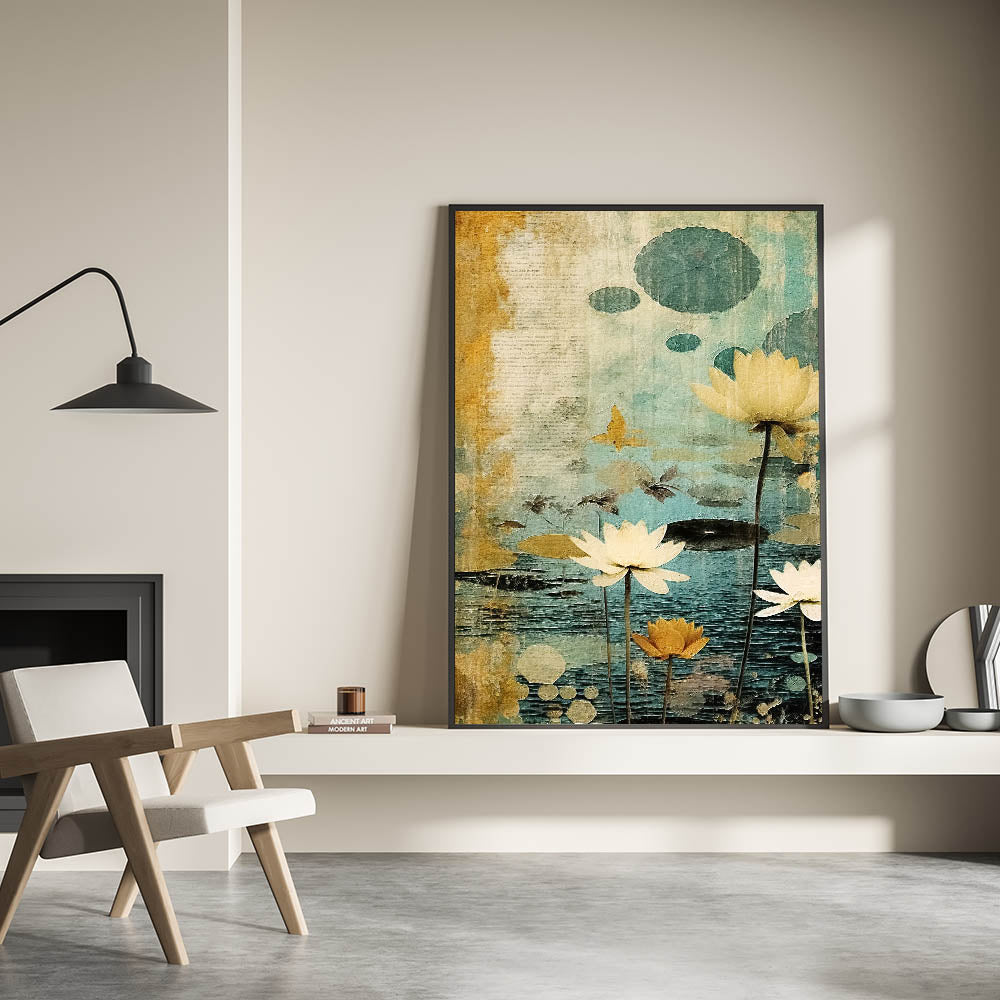 - Serene Nature-Inspired Art – A tranquil fusion of lotus flowers, water elements, and vintage textures, ideal for modern living room decor.