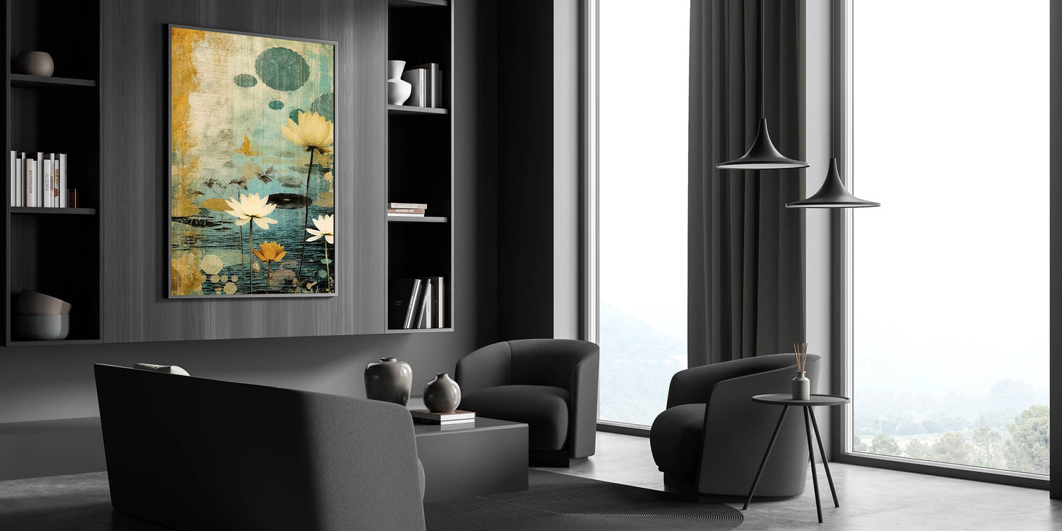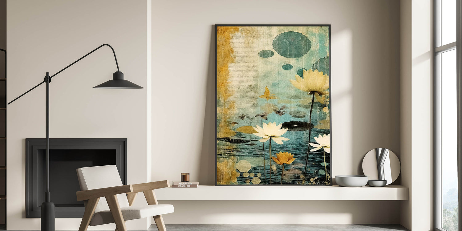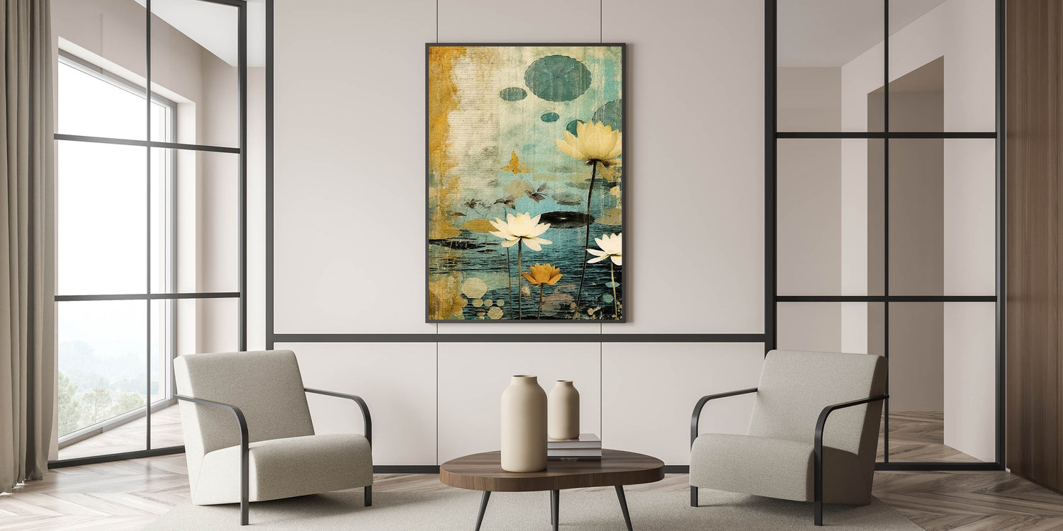 - Serene Nature-Inspired Art – A tranquil fusion of lotus flowers, water elements, and vintage textures, ideal for modern living room decor.