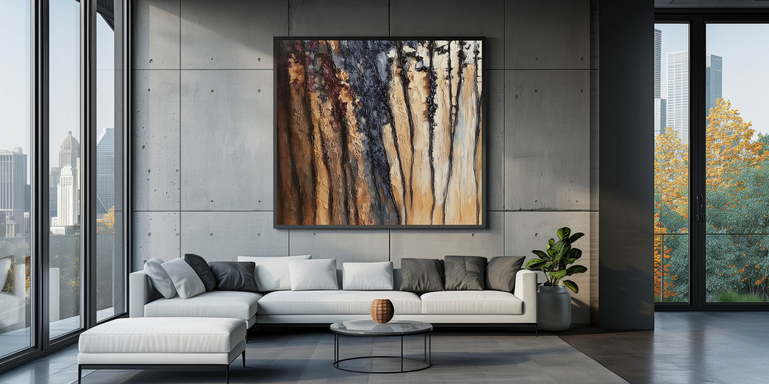 Immerse yourself in the beauty of nature with this Textured Abstract Forest Wall Art. Featuring deep brown, beige, and navy blue hues, this canvas wall art evokes the essence of tree bark and natural landscapes in a rich, textured style. The detailed brushstrokes create a sense of depth and movement, making this piece a striking choice for modern living room decor. Whether displayed as stretched canvas, framed prints, or acrylic glass, this large wall art brings warmth and artistic sophistication to any space.