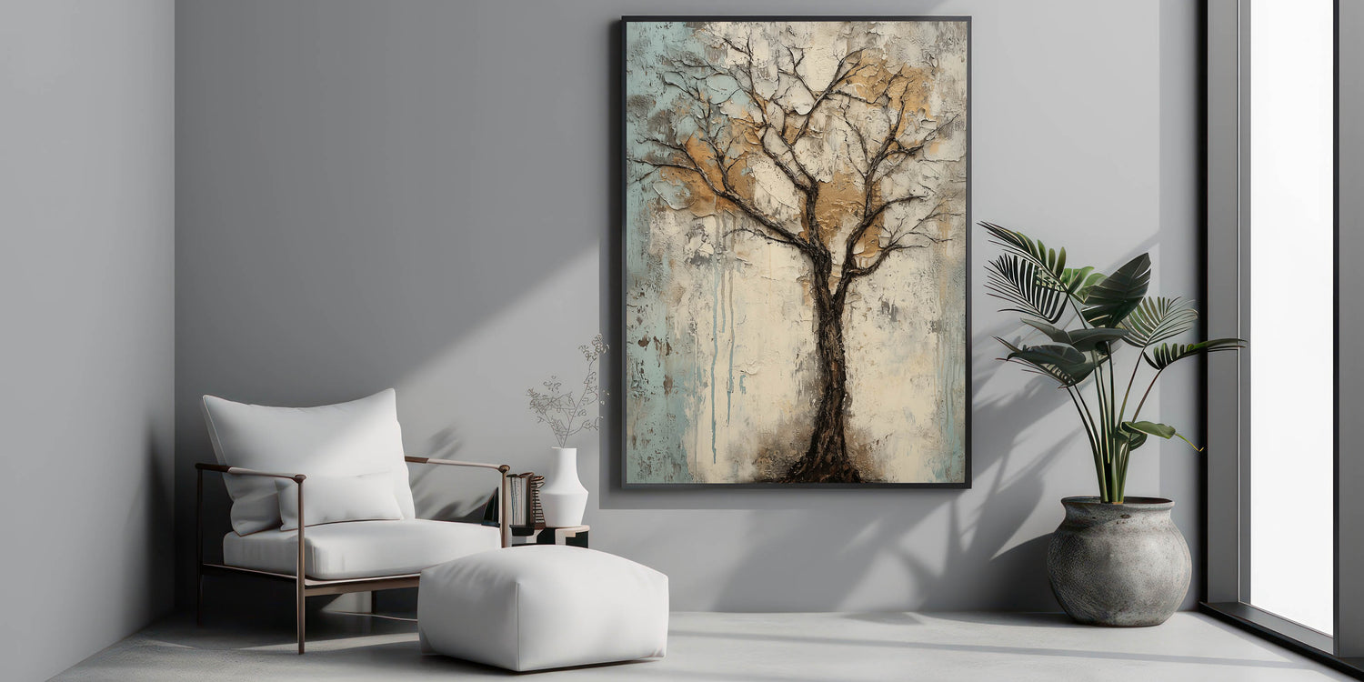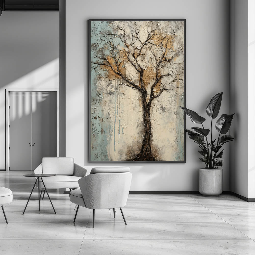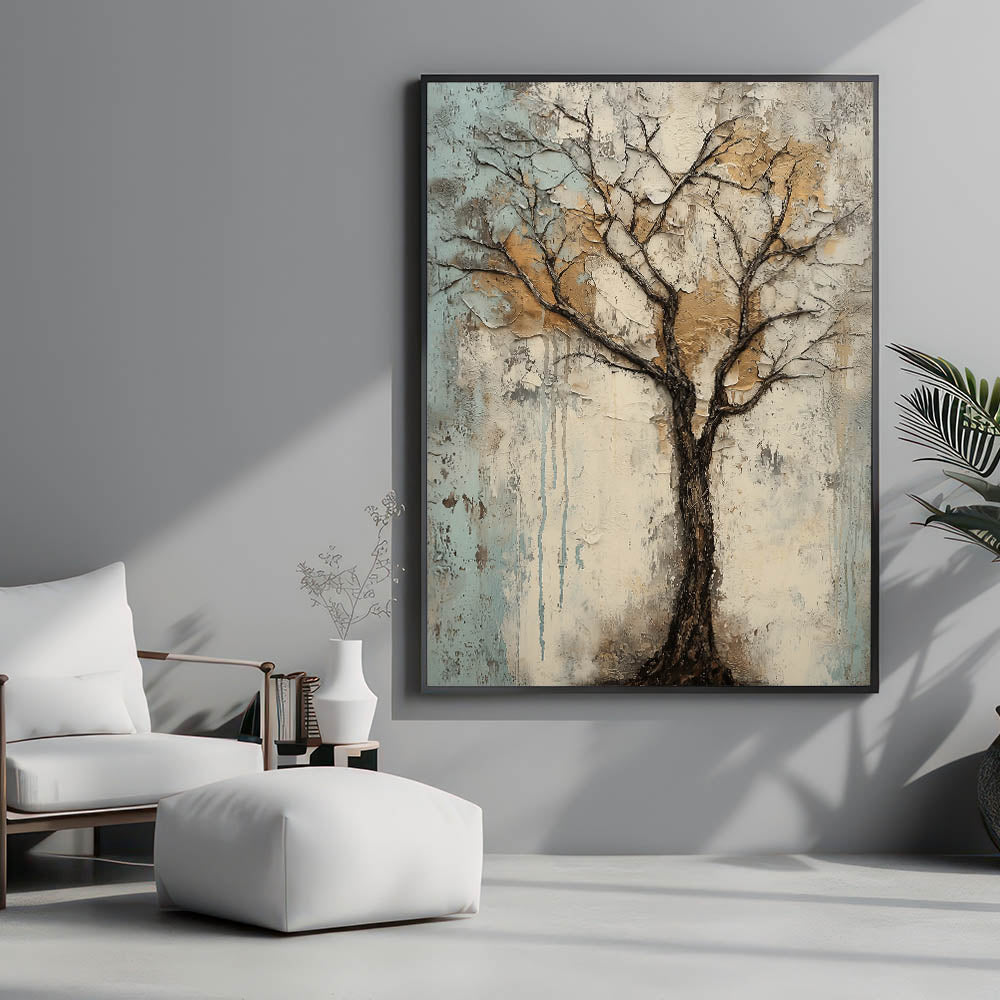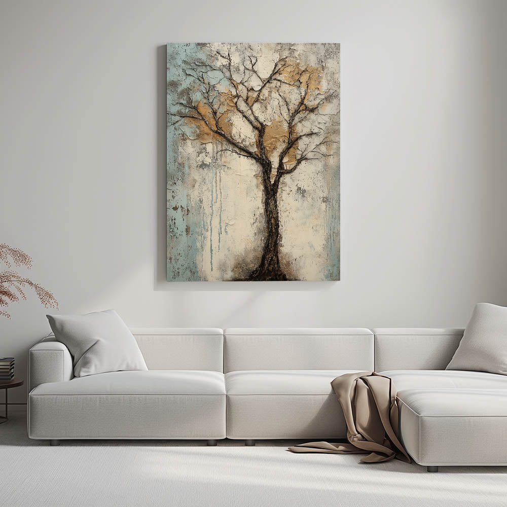 Add depth and dimension to your space with this stunning textured abstract tree wall art. Featuring a richly textured tree against a distressed gold, beige, and soft blue background, this modern wall art blends natural beauty with contemporary artistic techniques. The thick brushstrokes create a sculptural, three-dimensional effect, making it an eye-catching piece for wall art for living rooms, bedrooms, or nature-inspired interiors. Available in canvas wall art, framed wall art, and acrylic glass, this design effortlessly complements both modern and rustic décor.