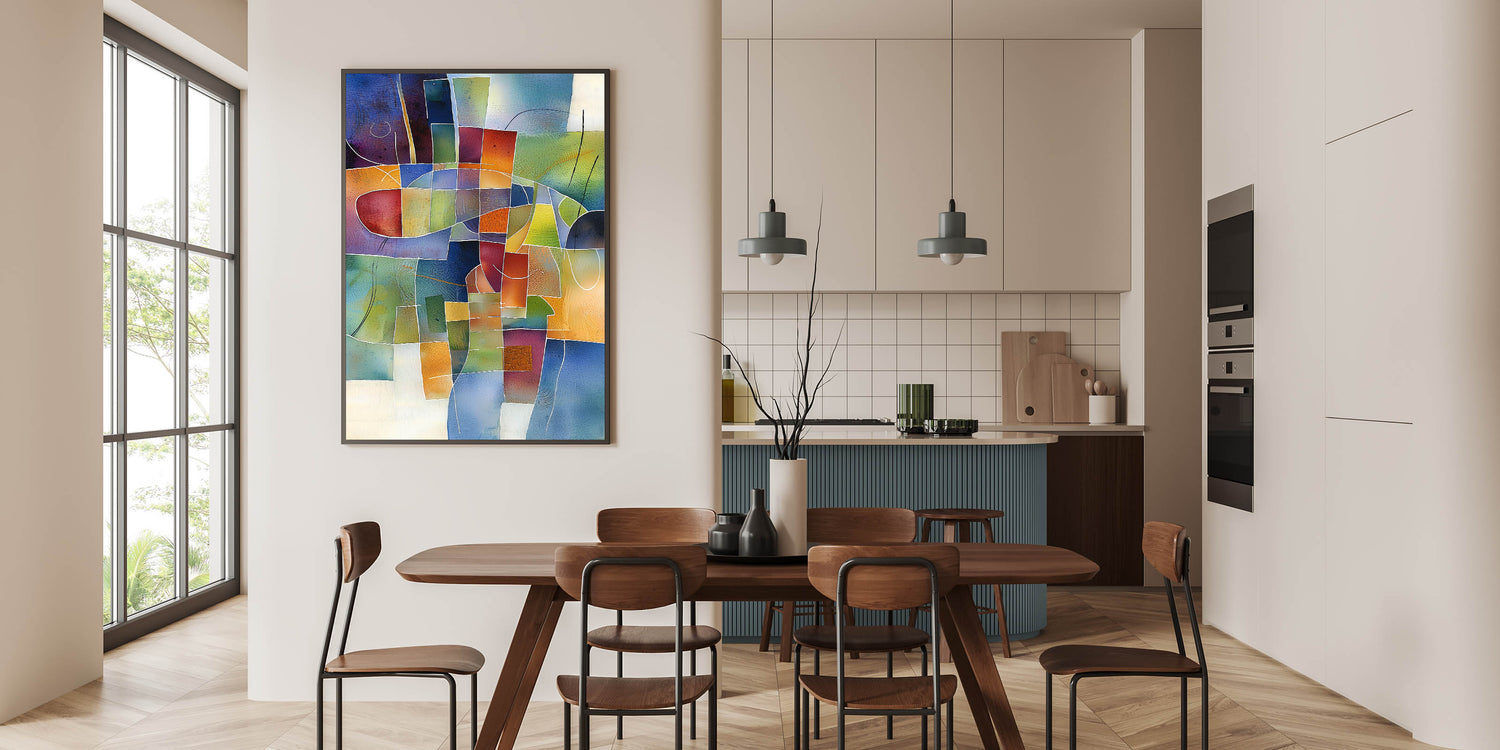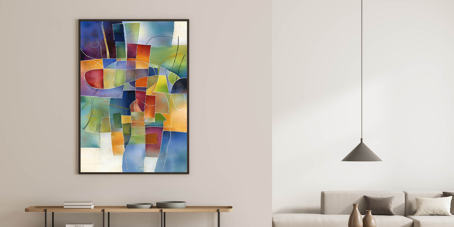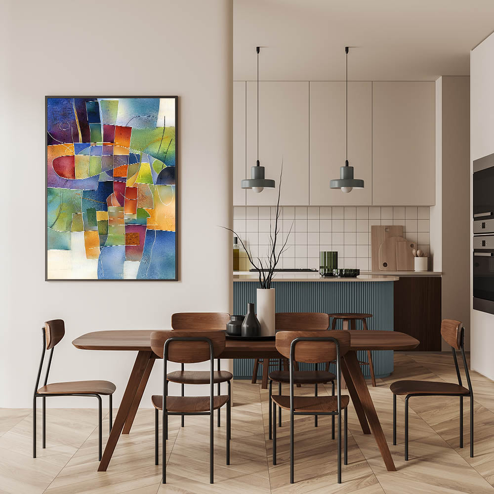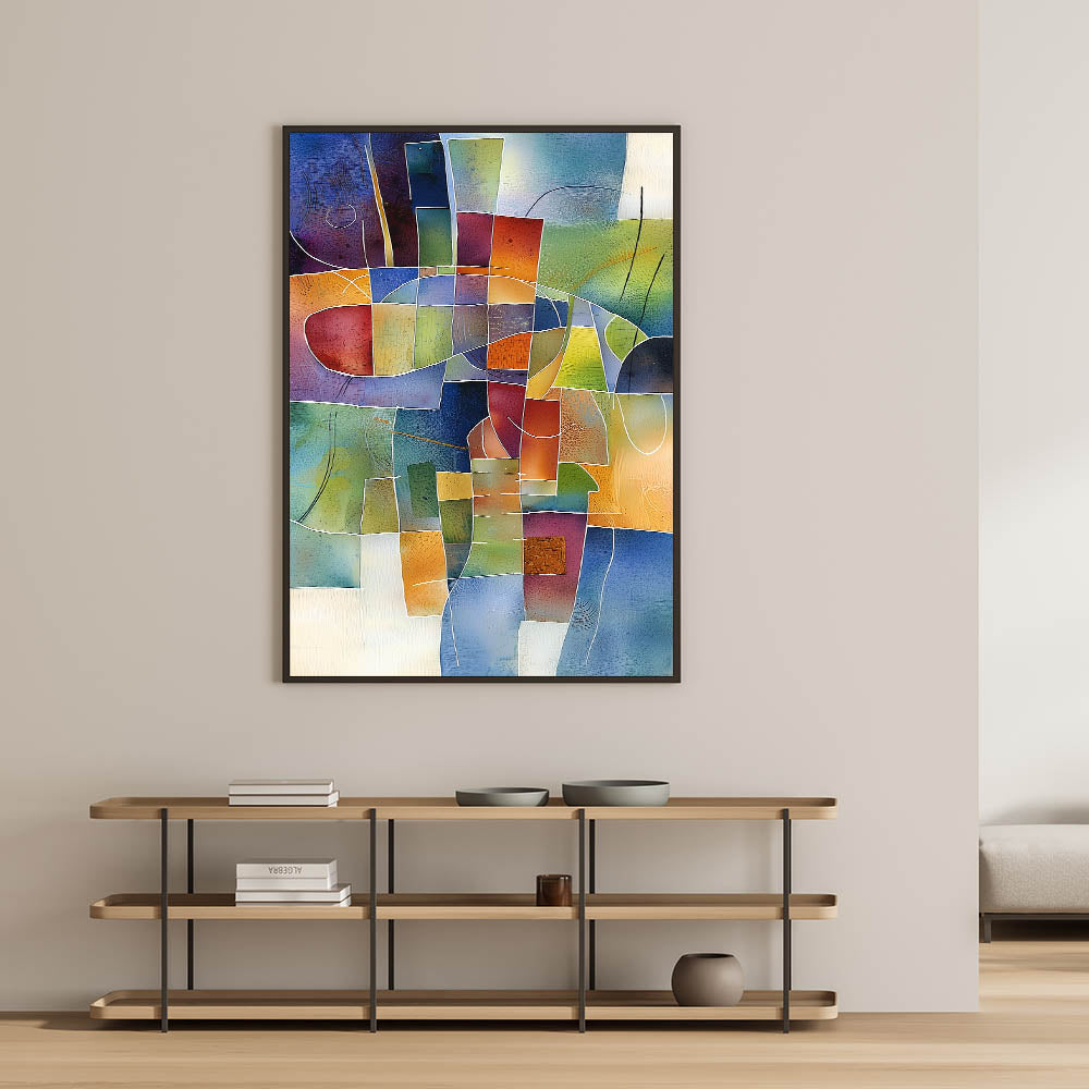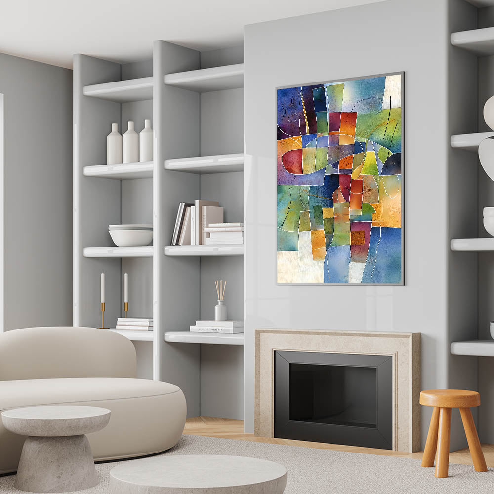 Add a burst of color and energy to your space with this Living Room Wall Art, a stunning geometric abstract composition featuring bold multicolor blocks outlined in white. The vibrant mix of red, orange, blue, green, and yellow hues creates a dynamic and modern aesthetic, perfect for Modern Living Room Decor. Whether displayed alone or as part of a gallery wall, this piece enhances any contemporary setting.