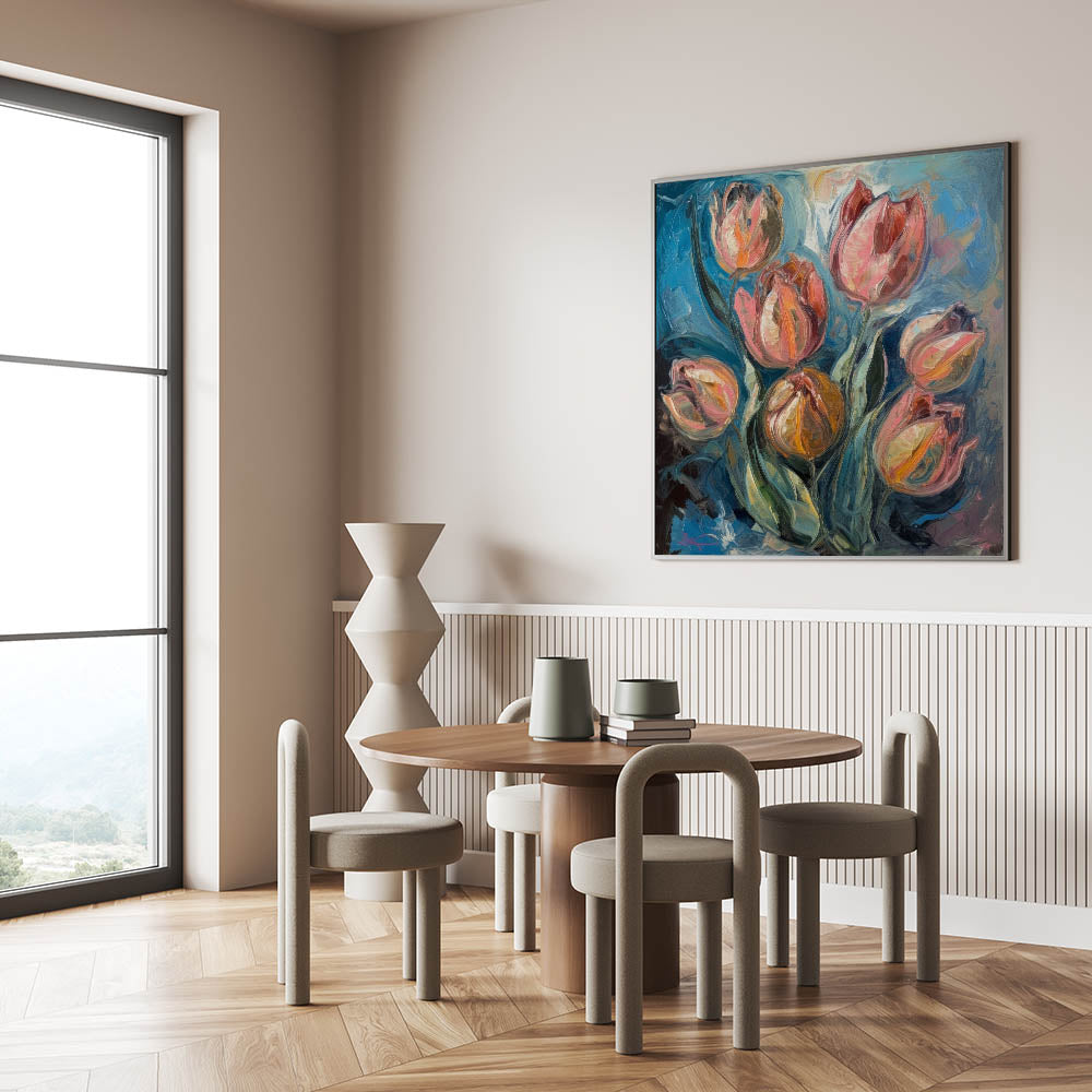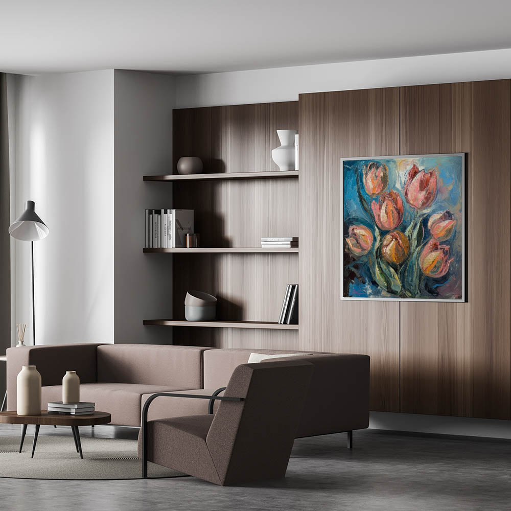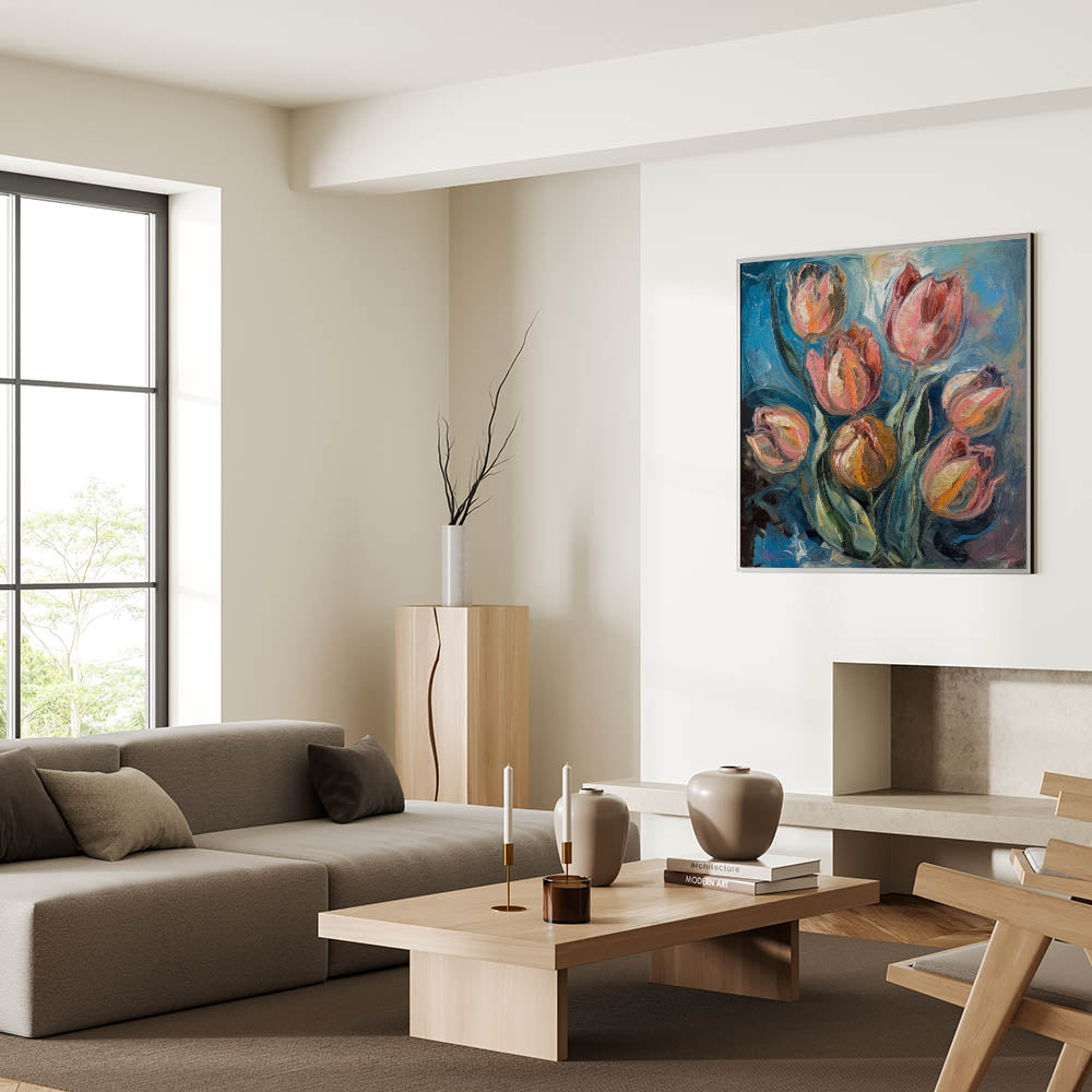 Enhance your home with the beauty of this Vibrant Tulip Abstract Wall Art, a stunning fusion of rich blues, fiery oranges, and soft pinks. This living room wall art features expressive brushstrokes and bold color contrasts, making it an ideal choice for those who appreciate modern wall art with a dynamic, painterly touch. The textured details and fluid motion bring a sense of energy and sophistication to any contemporary space.