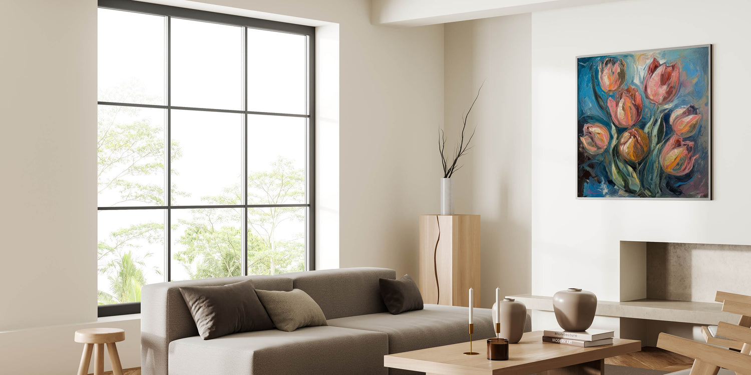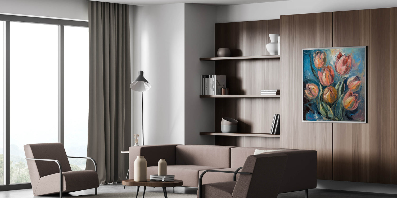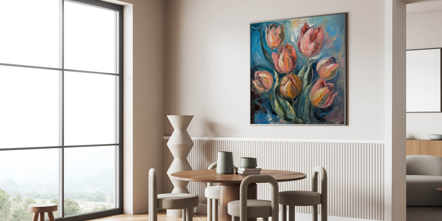 Enhance your home with the beauty of this Vibrant Tulip Abstract Wall Art, a stunning fusion of rich blues, fiery oranges, and soft pinks. This living room wall art features expressive brushstrokes and bold color contrasts, making it an ideal choice for those who appreciate modern wall art with a dynamic, painterly touch. The textured details and fluid motion bring a sense of energy and sophistication to any contemporary space.