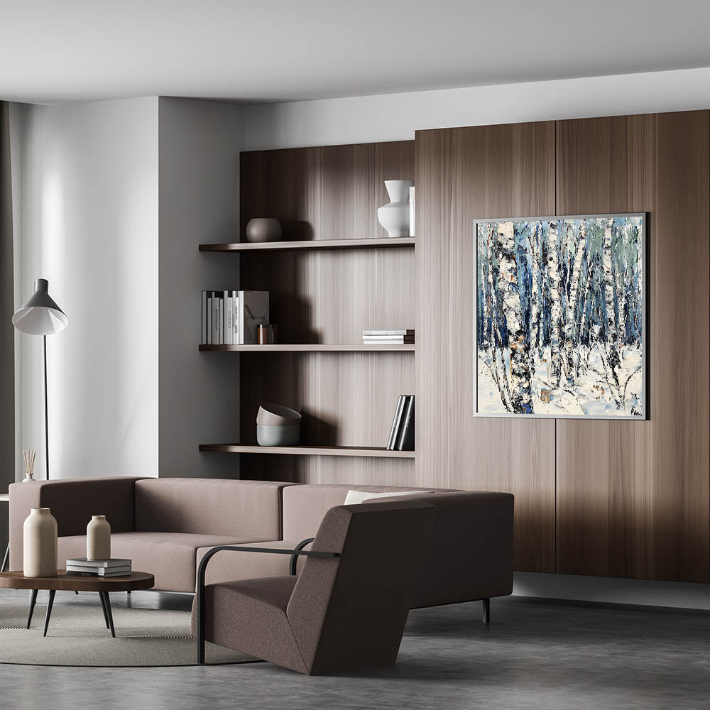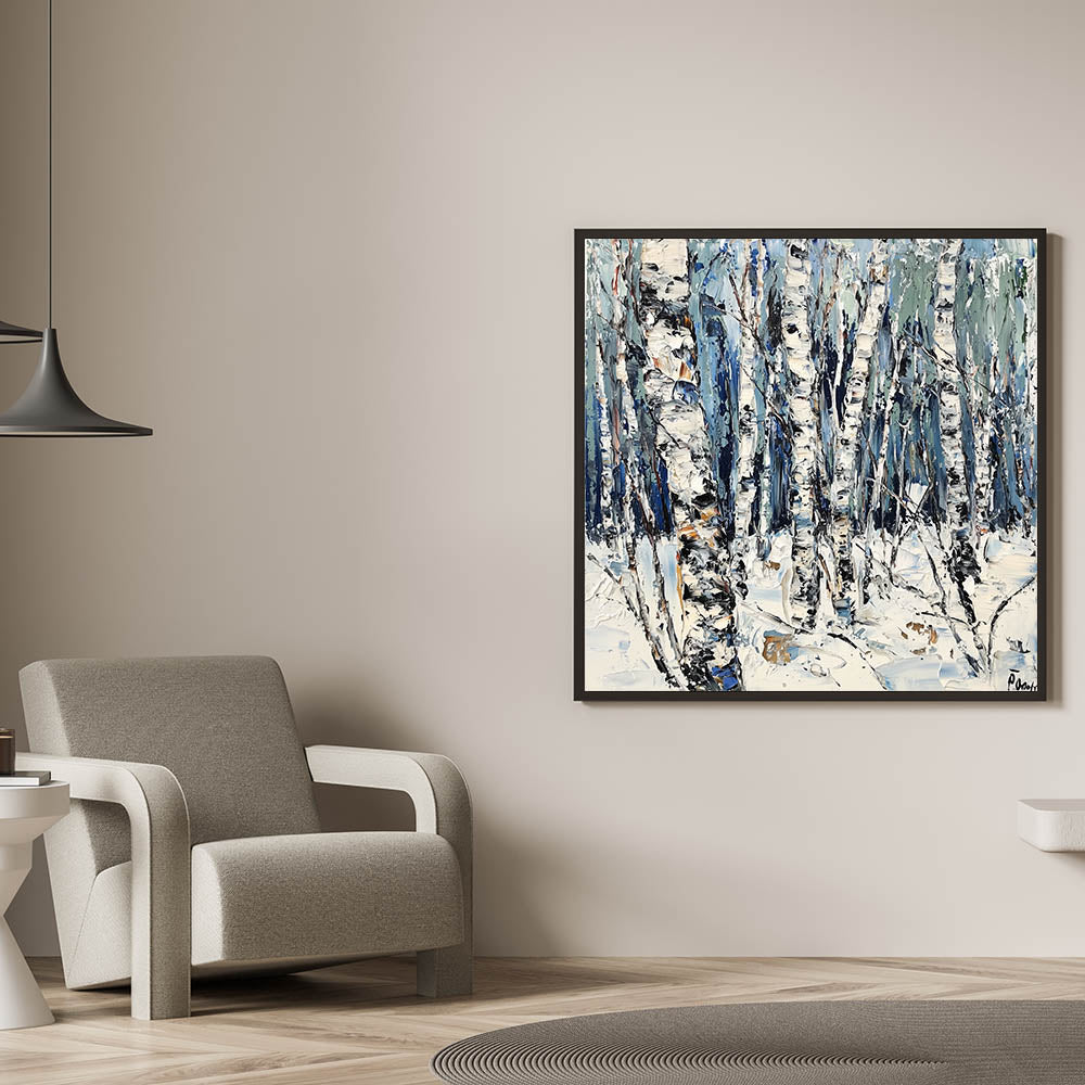 Transform your space with the tranquil beauty of this living room wall art, featuring a serene winter birch forest in an expressive abstract wall art style. The combination of textured brushstrokes and cool color tones creates a calming and elegant focal point for any modern living room decor.