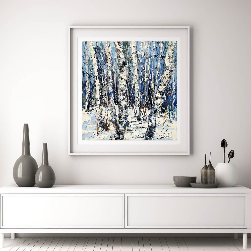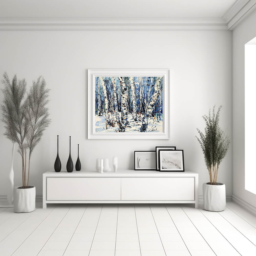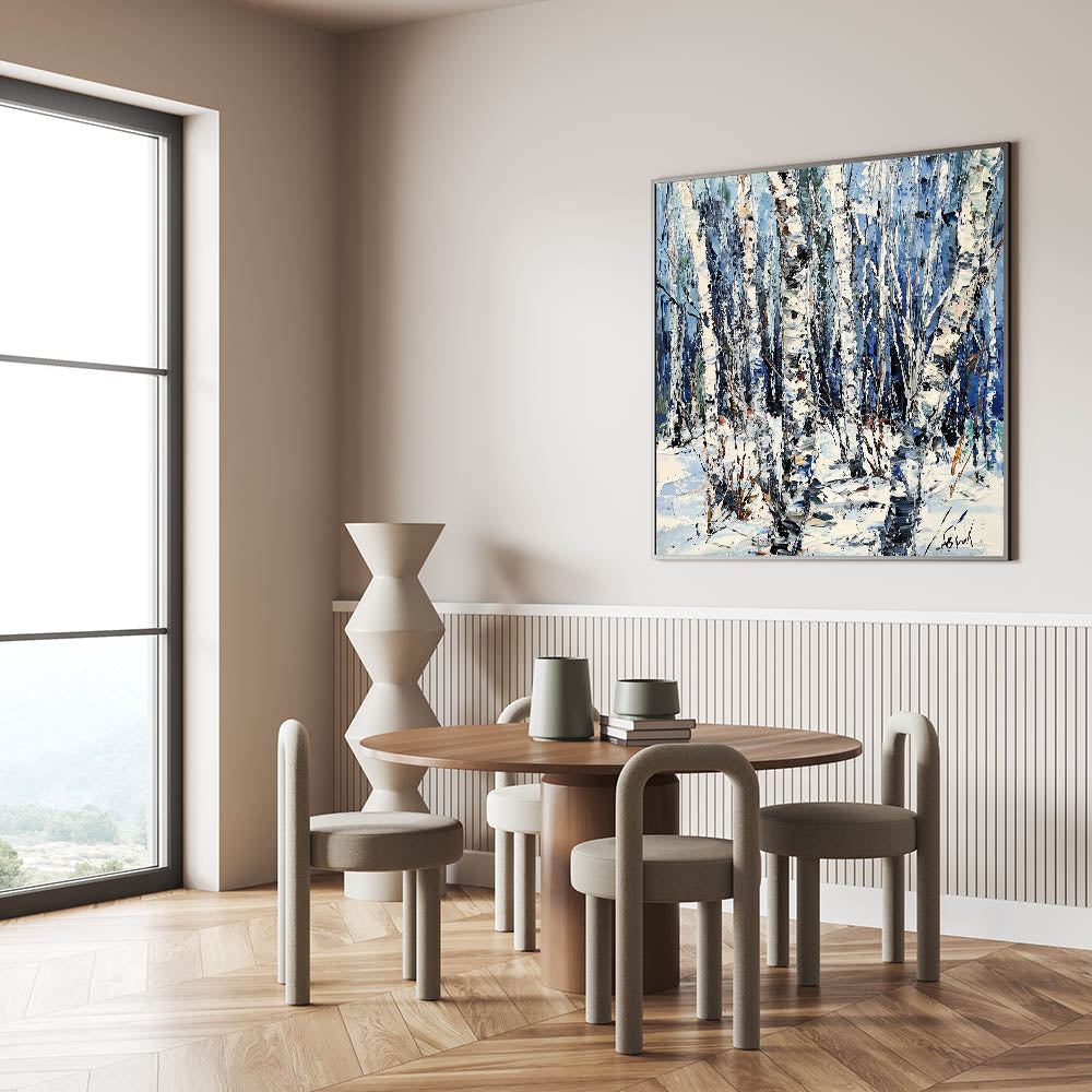 Elevate your home with the beauty of winter landscapes through this living room wall art, featuring a stunning birch tree forest. With textured brushstrokes and a serene mix of blues and whites, this abstract wall art piece brings a sense of tranquility and sophistication to your space. Perfect for those who appreciate modern wall art with a nature-inspired theme.