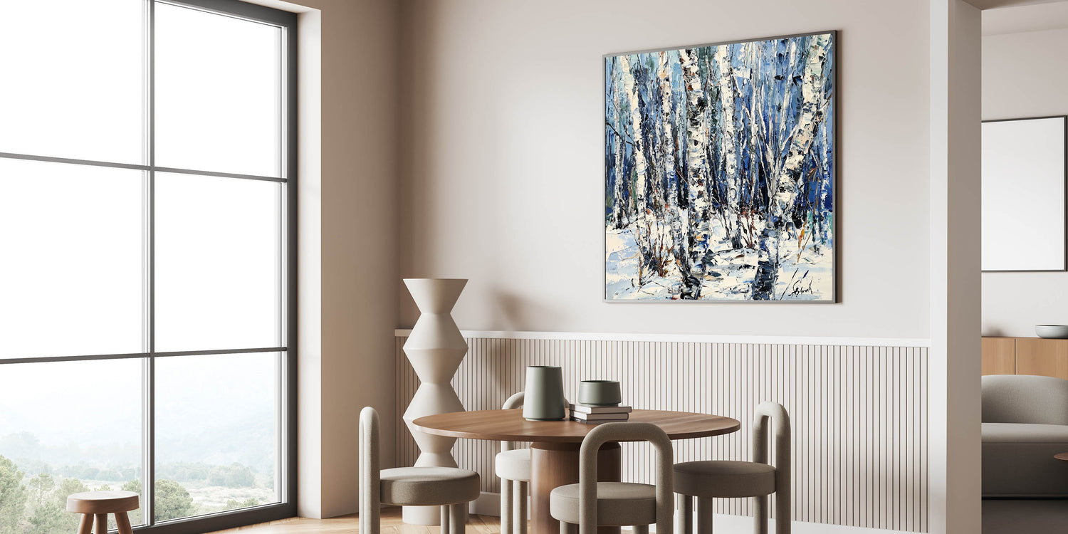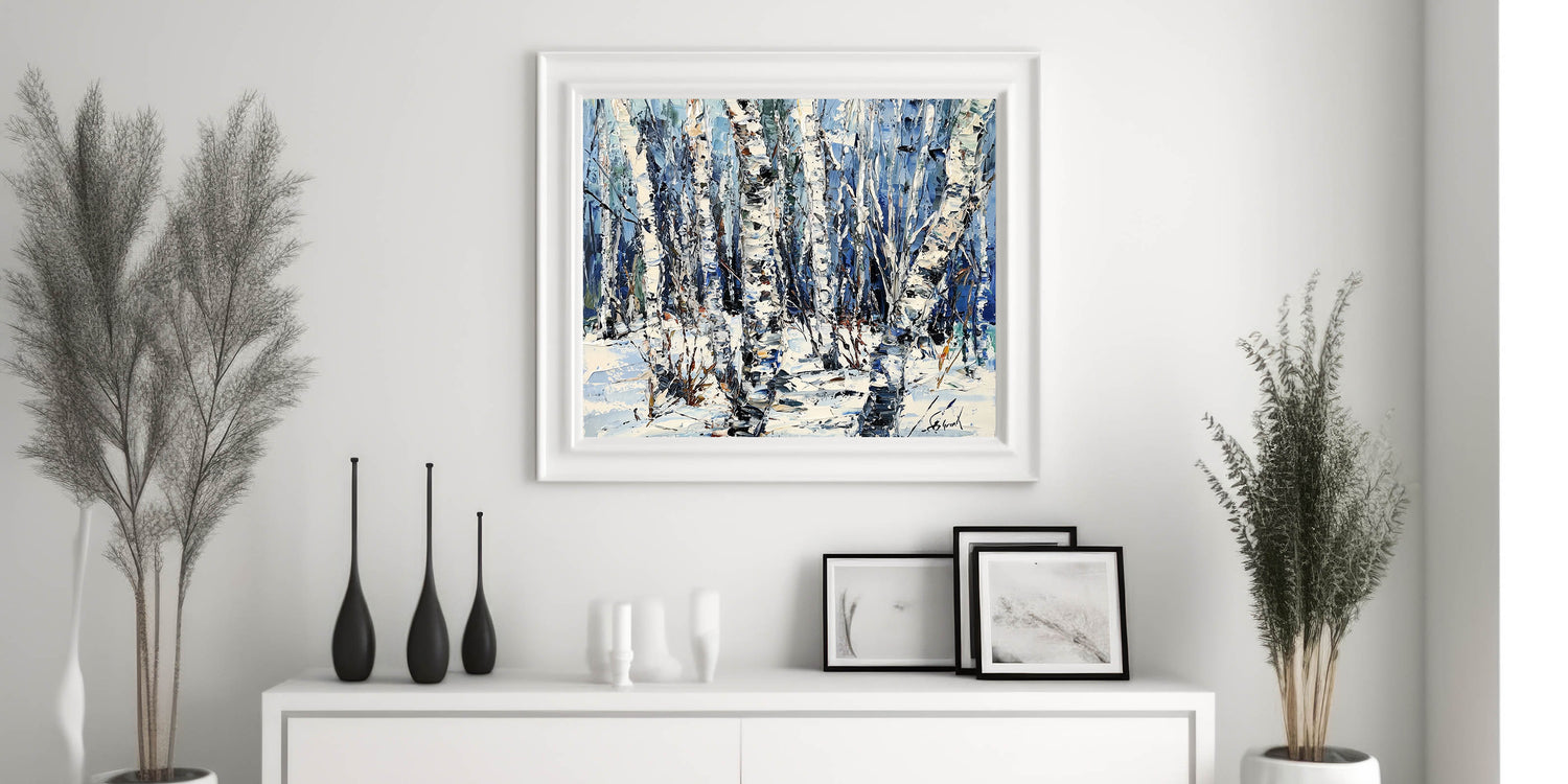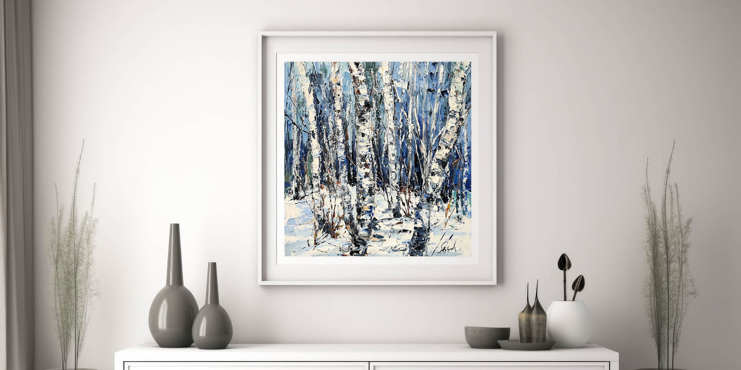 Elevate your home with the beauty of winter landscapes through this living room wall art, featuring a stunning birch tree forest. With textured brushstrokes and a serene mix of blues and whites, this abstract wall art piece brings a sense of tranquility and sophistication to your space. Perfect for those who appreciate modern wall art with a nature-inspired theme.