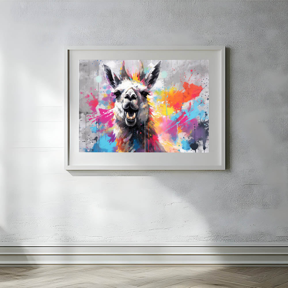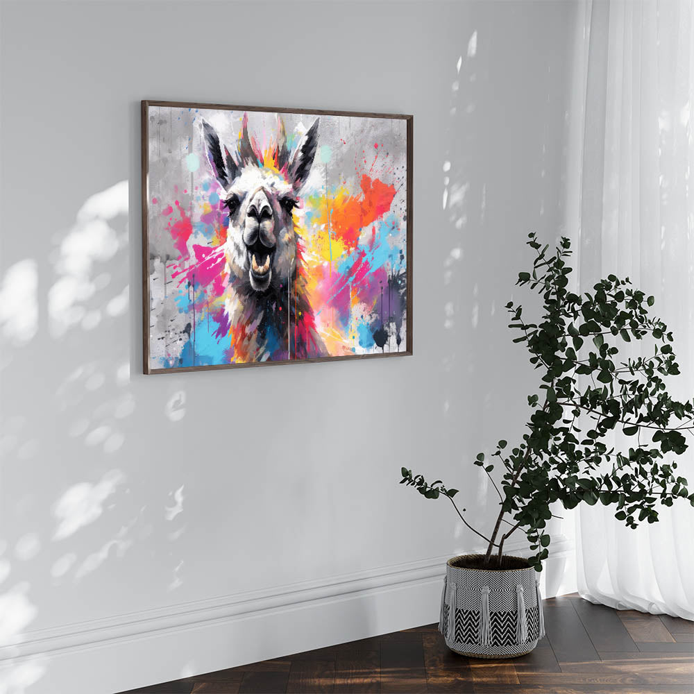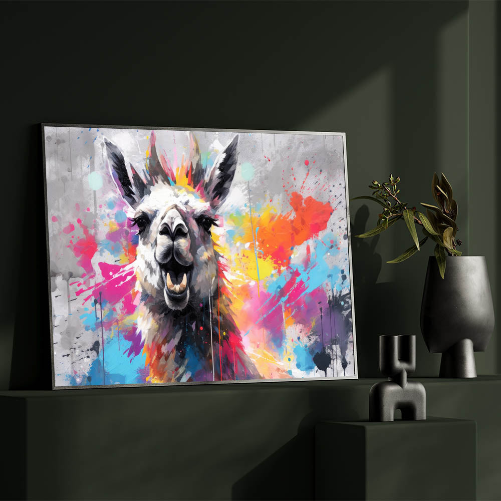 Inject energy and color into your space with this Vibrant Llama Wall Art, a striking piece that embodies modern artistry and bold design. This artwork features a lively llama against a dynamic splash of colors, making it an ideal focal point for contemporary and eclectic interiors. The fusion of vibrant hues and playful splatters creates an artistic expression that will enliven any room.