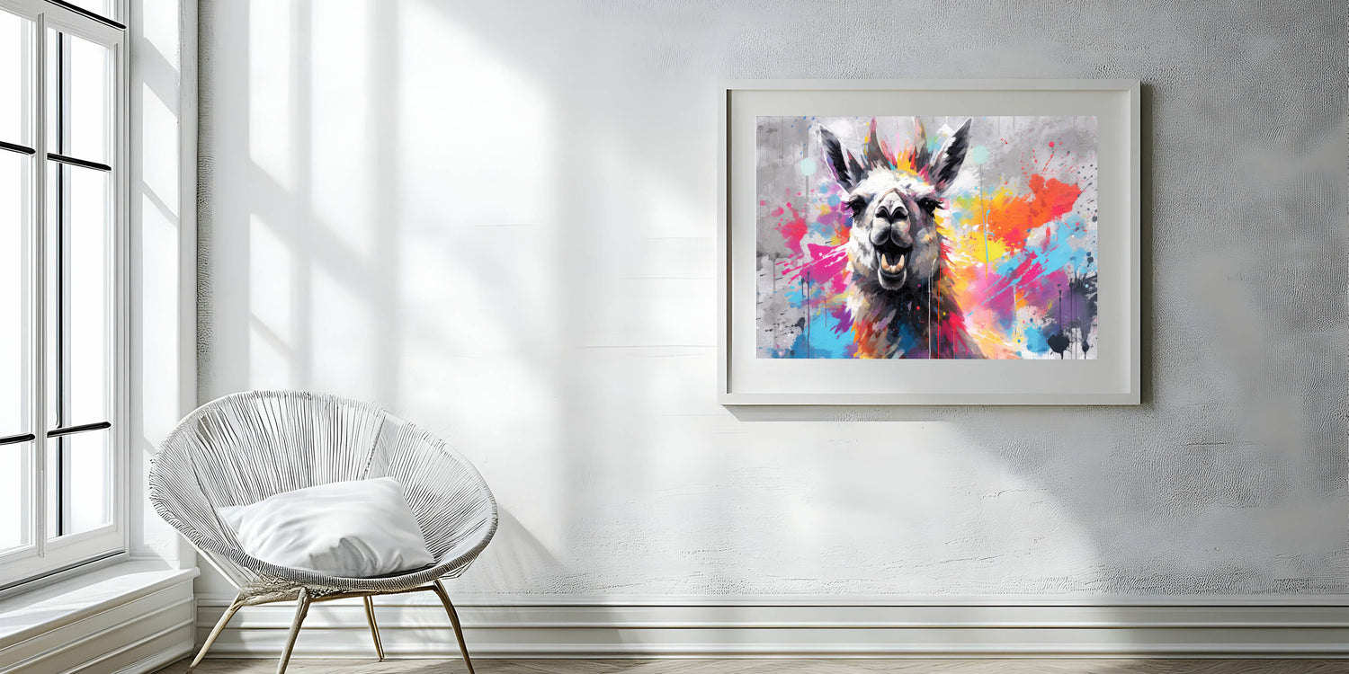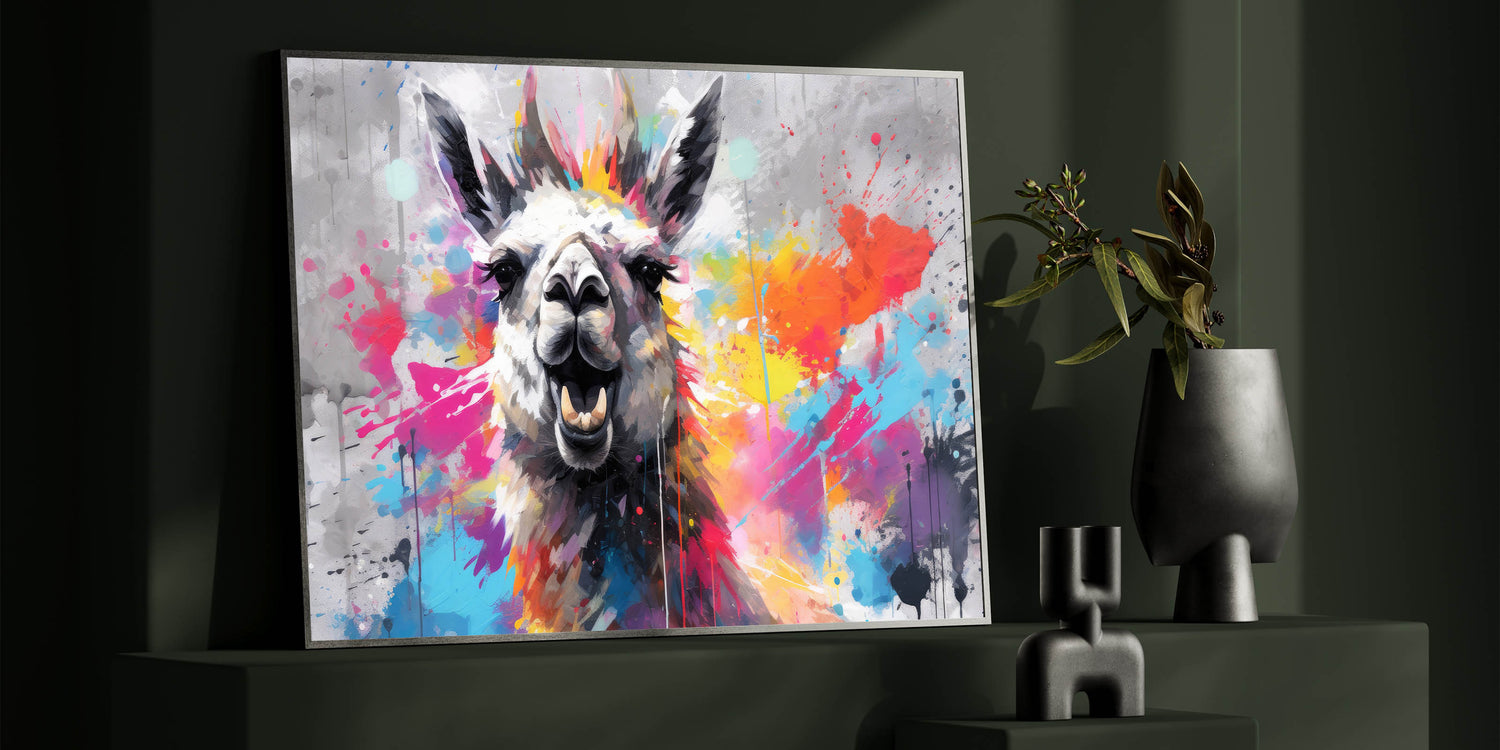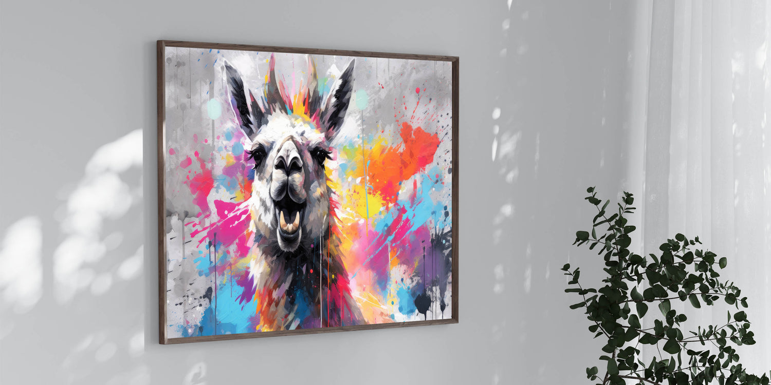 Inject energy and color into your space with this Vibrant Llama Wall Art, a striking piece that embodies modern artistry and bold design. This artwork features a lively llama against a dynamic splash of colors, making it an ideal focal point for contemporary and eclectic interiors. The fusion of vibrant hues and playful splatters creates an artistic expression that will enliven any room.