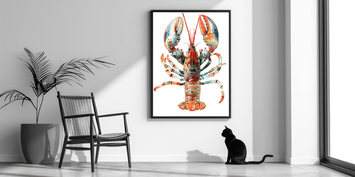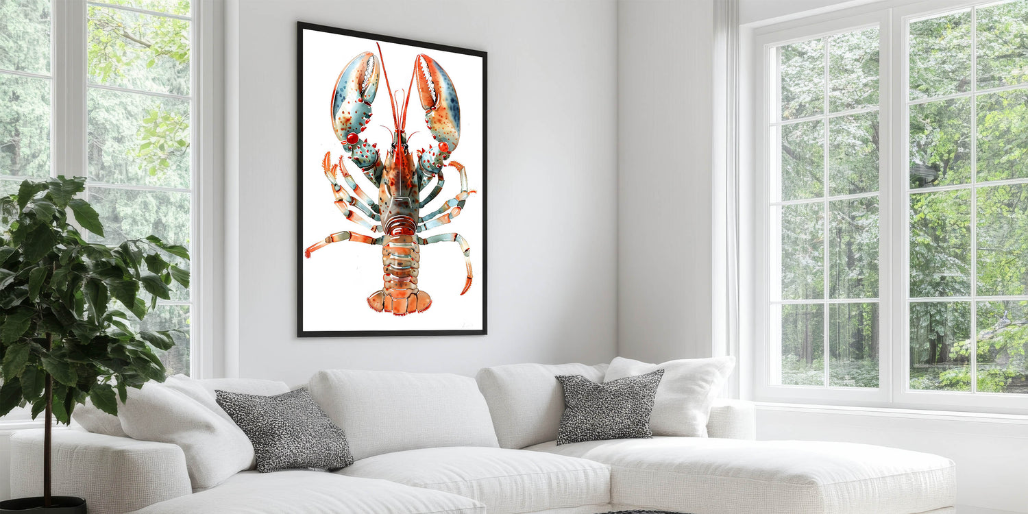 Bring a modern coastal vibe to your home with this elegant lobster artwork. Whether you're decorating a beach house or adding a touch of the ocean to your city apartment, this piece will enhance your decor with its fresh and contemporary appeal. Available in various print and frame options to suit your style.