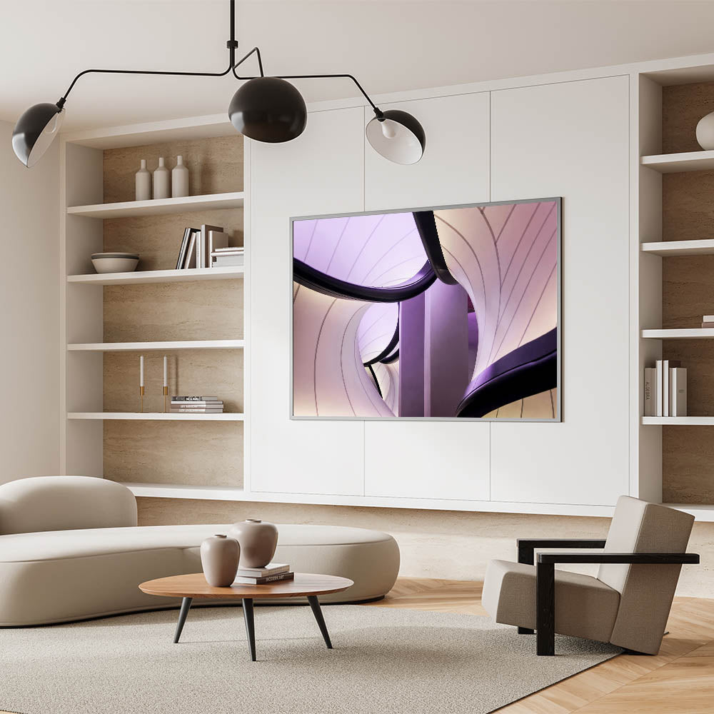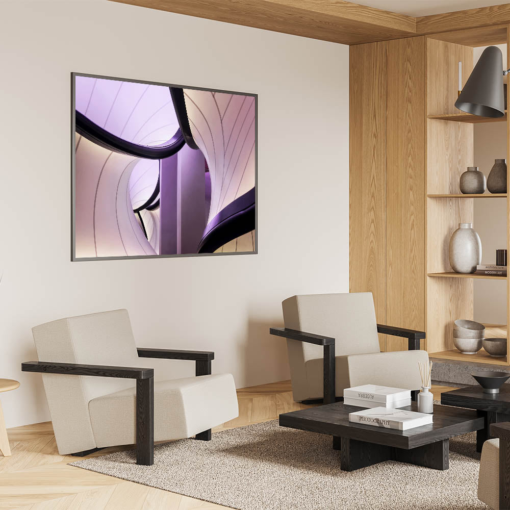This stunning piece of contemporary London art captures the flowing curves and abstract design of a modern architectural structure. The soft lilac and purple tones, combined with smooth lines, give this artwork a futuristic yet calming aesthetic, perfect for adding a unique and modern touch to your home or office decor. The abstract composition draws viewers in, allowing them to appreciate the fluidity and artistic nature of the architecture.