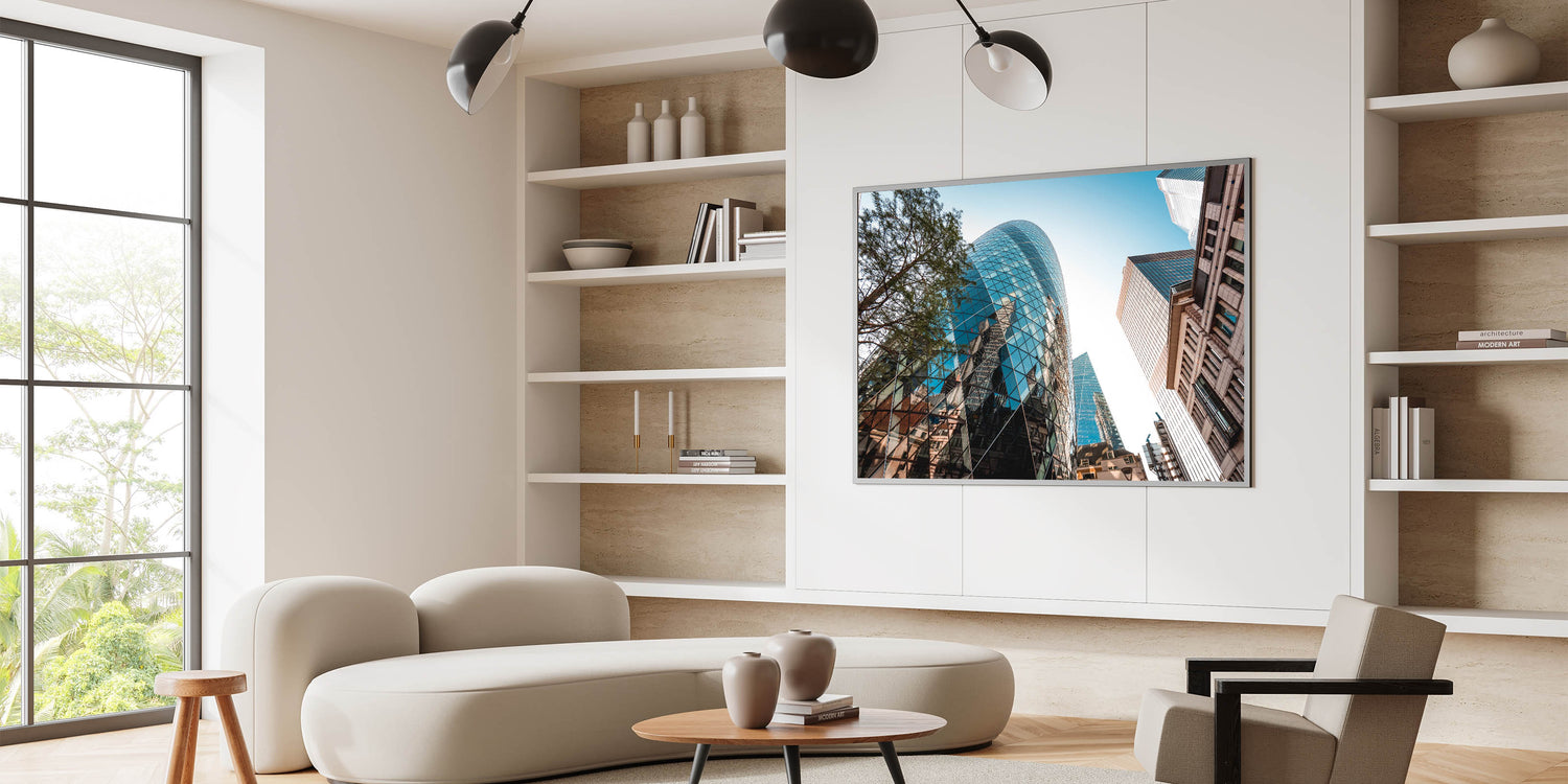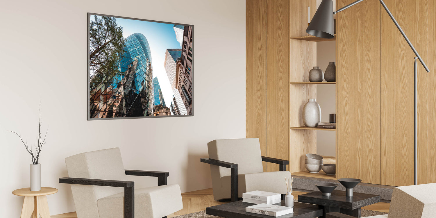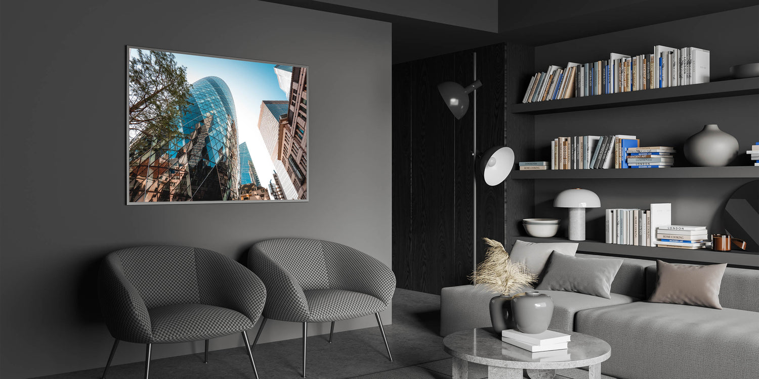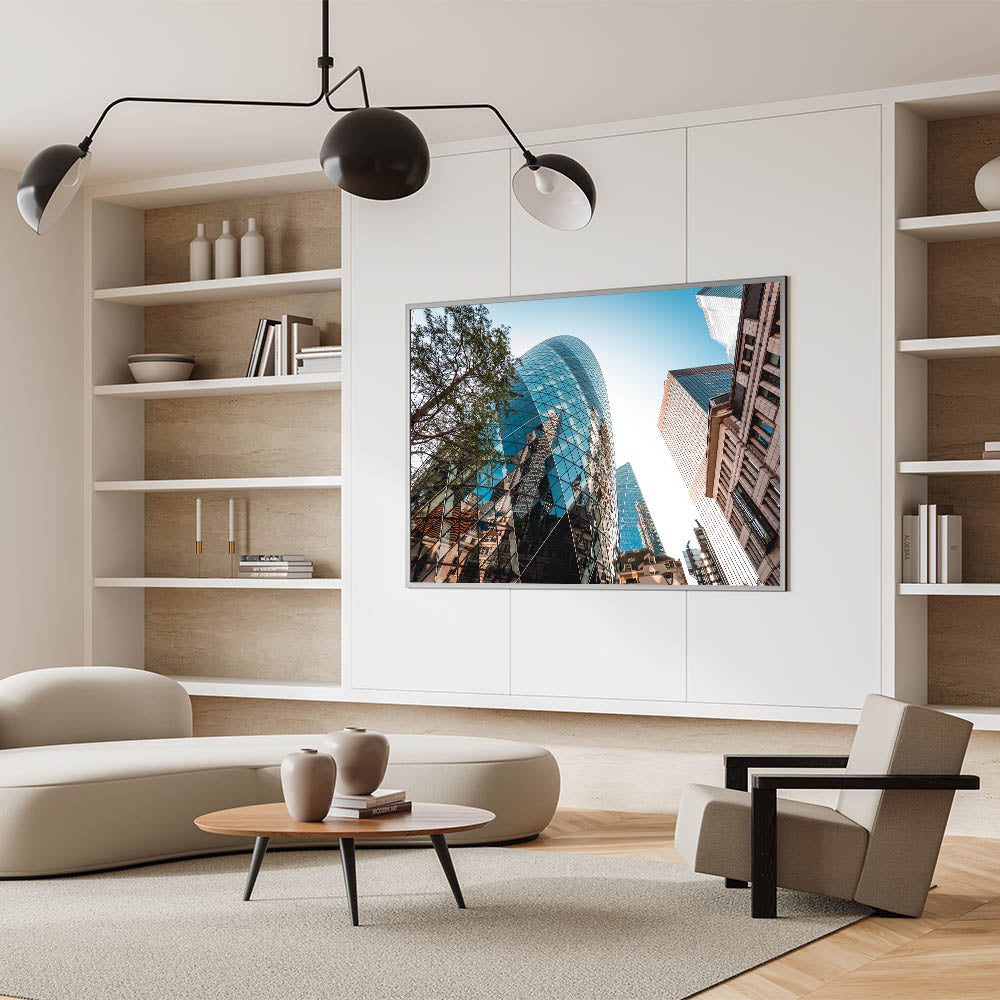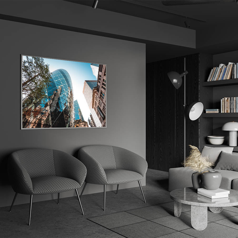 Bring a piece of London's iconic skyline into your home or office with this captivating Gherkin building print. The sharp details and sleek lines of this architectural gem make it an excellent addition to any modern decor setting. Elevate your space with this unique piece of London-themed wall decor.