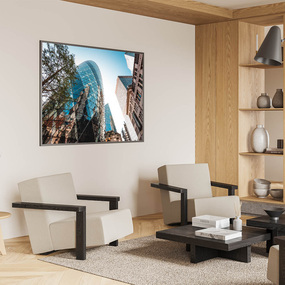 This striking London cityscape print showcases the iconic Gherkin building, a masterpiece of modern architecture nestled in the heart of London's financial district. The reflective glass surface of the building creates a fascinating contrast with the surrounding structures, capturing the vibrant energy of urban London. Perfect for those who appreciate contemporary architecture and London photography art, this print will transform your space into a stylish haven.