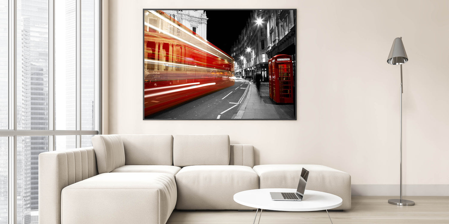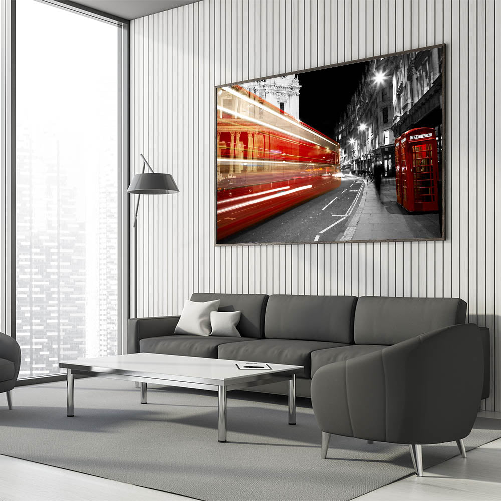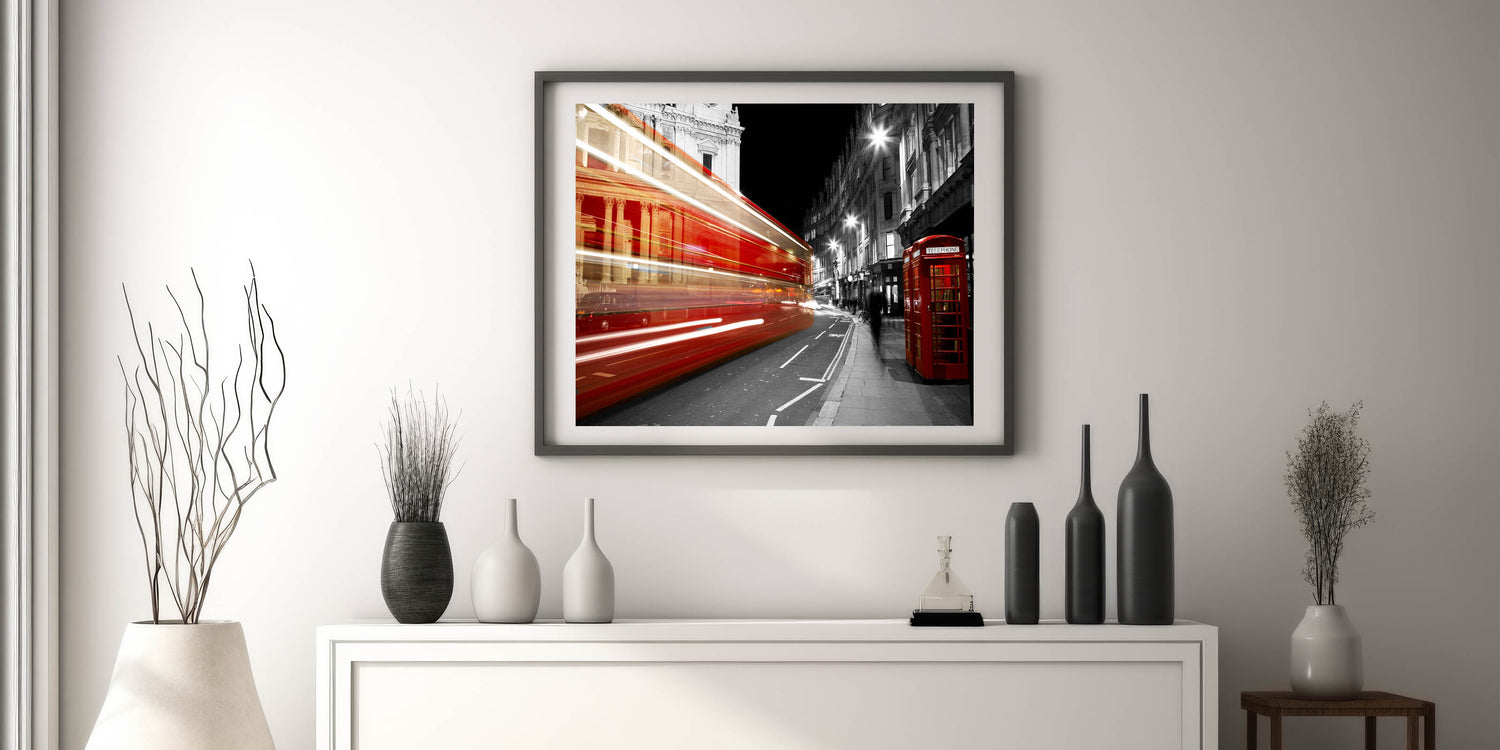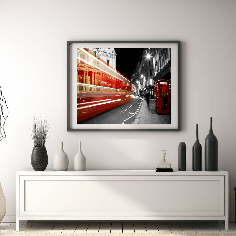 • High-resolution print showcasing a red bus and phone booth, with an artistic black-and-white background.
